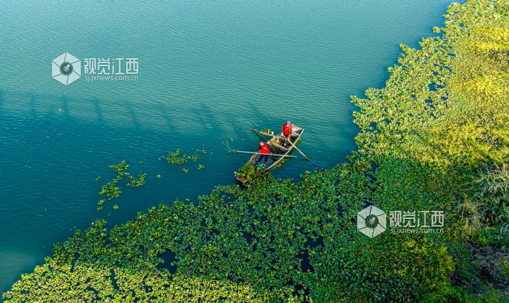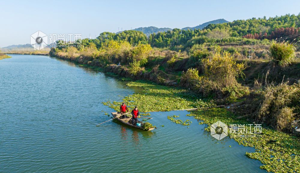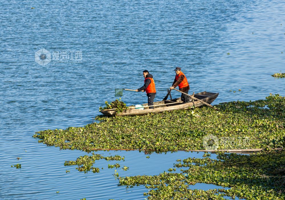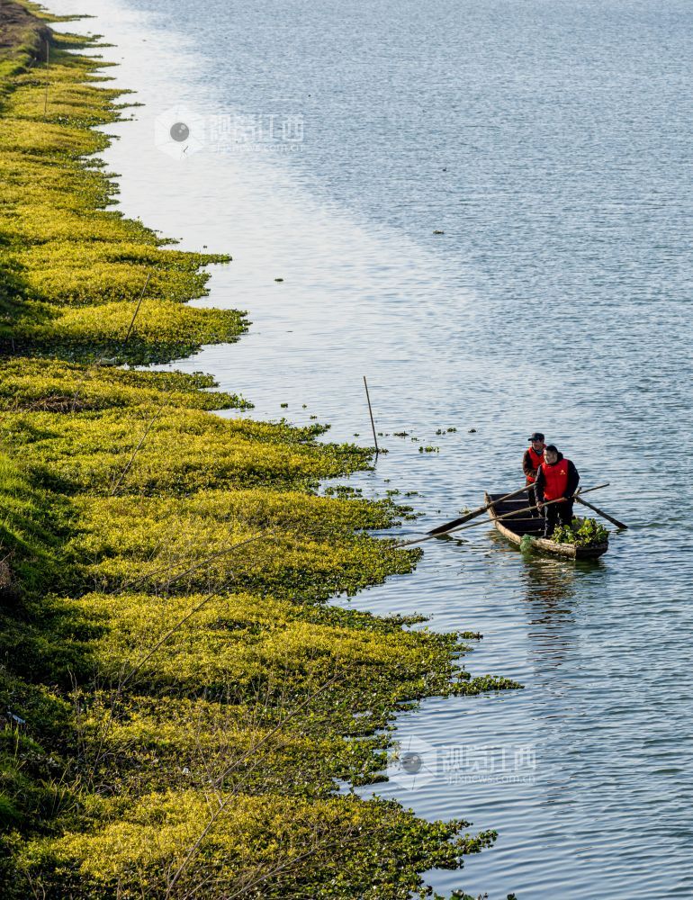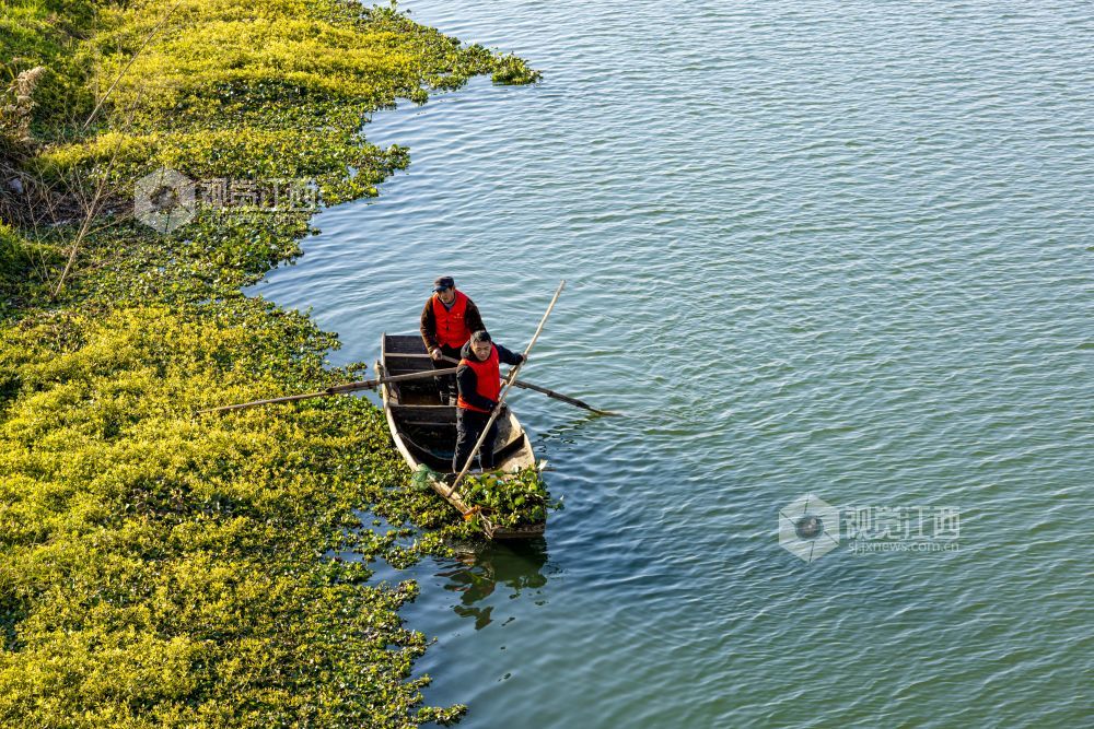 2022年12月14日,江西省九江市柴桑区新塘乡四华村,党员志愿者在辖区长河内清理水葫芦及其他漂浮物。