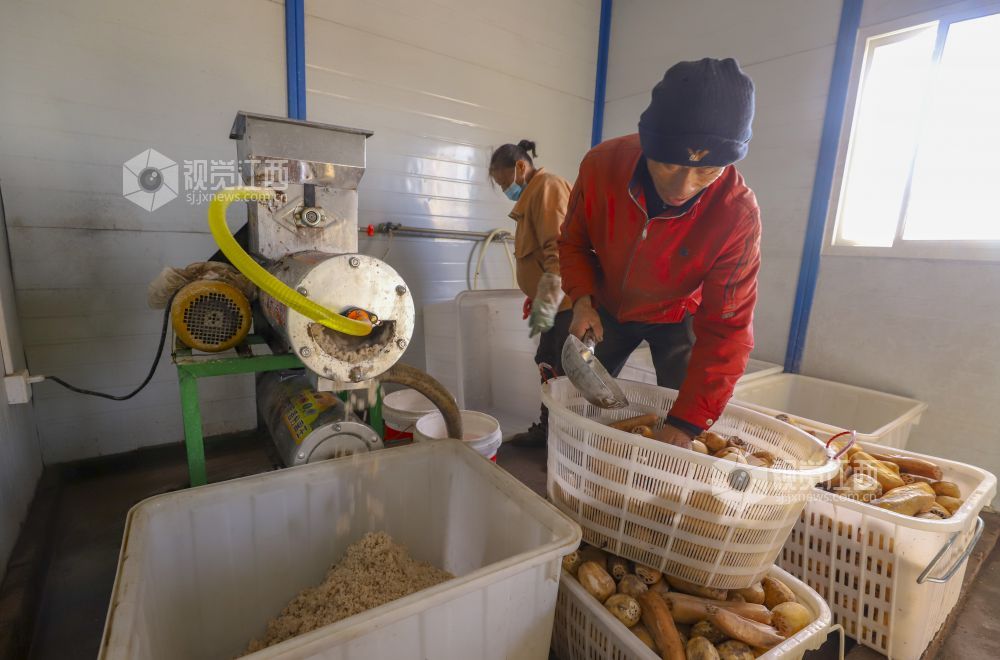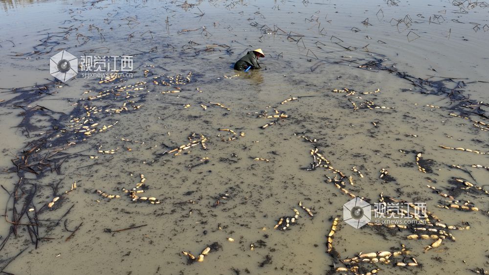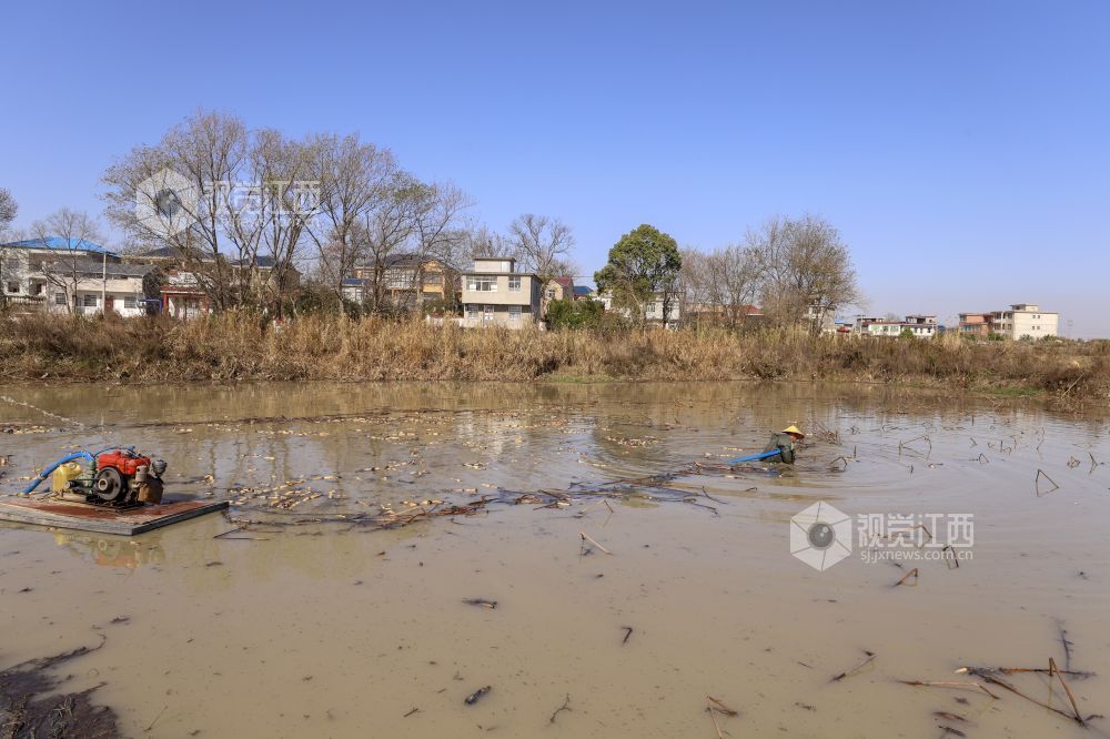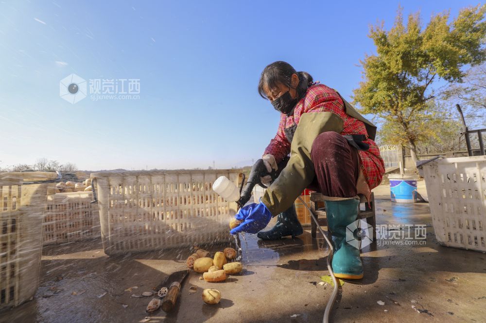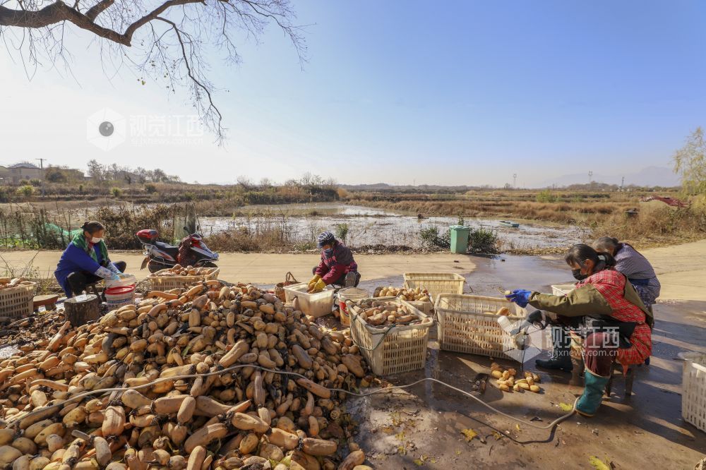 12月18日,江西省湖口县城山镇东庄村返乡创业青年陈明协在组织村民采挖、清洗、加工田藕。