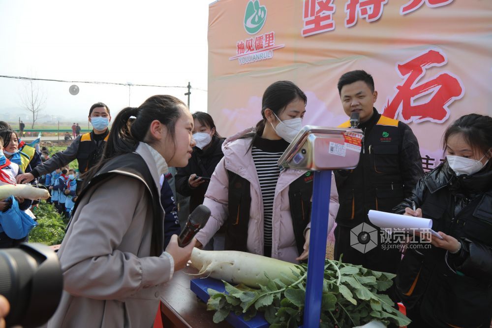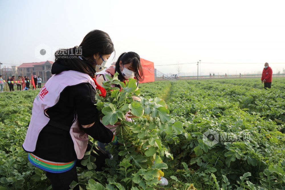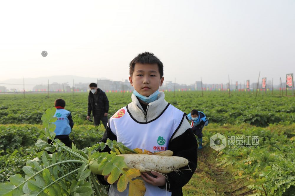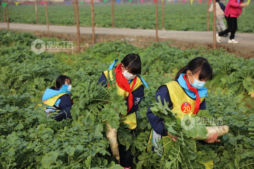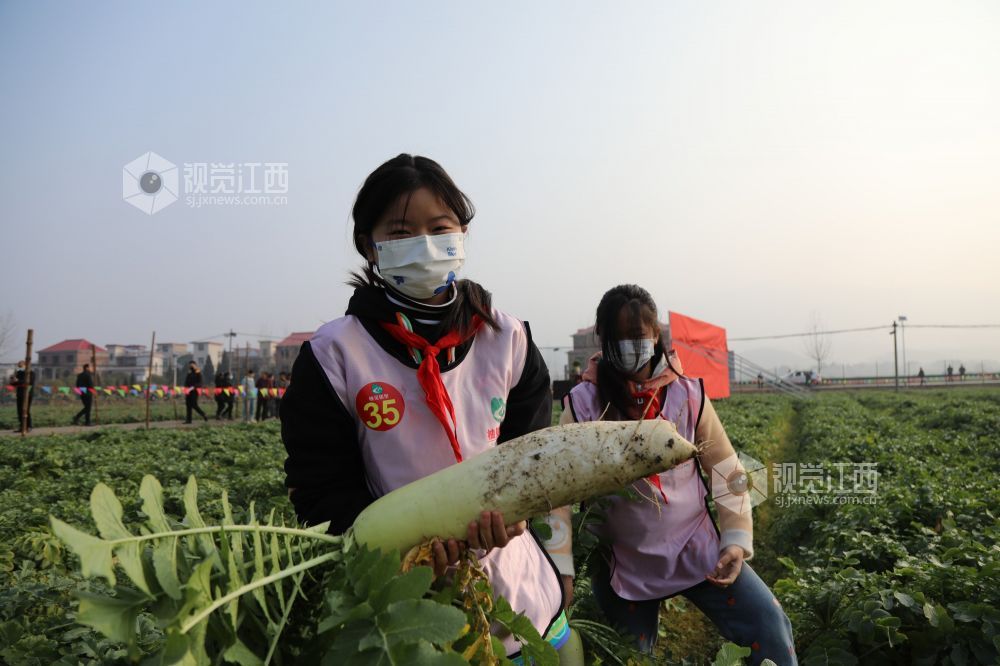1月6日,江西省莲花县升坊镇石江村新时代文明实践站在该村萝卜基地组织学生开展活动采收萝卜。