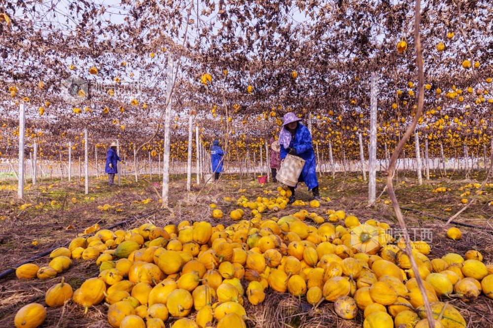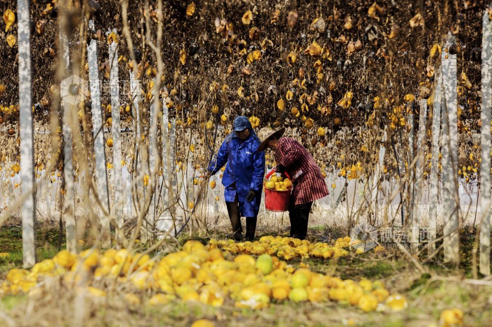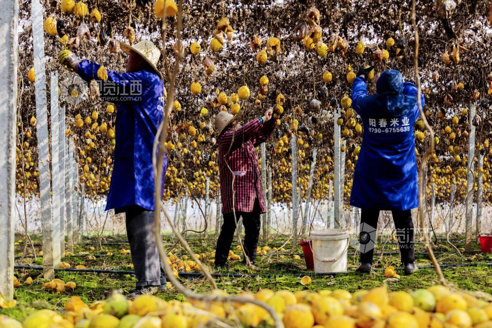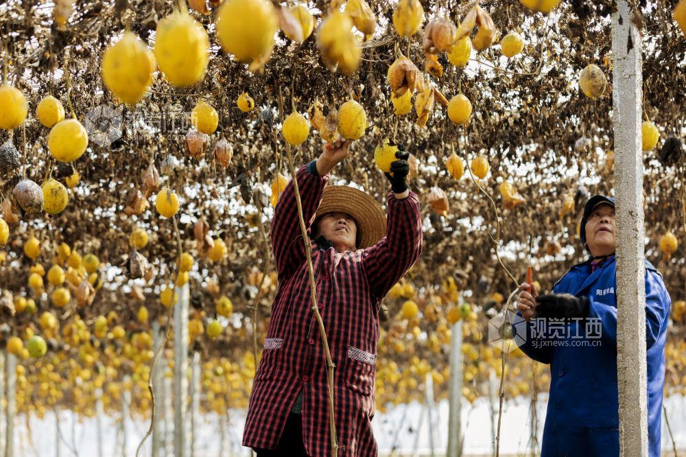 1月7日,在冬日阳光照射下,江西省新余市渝水区罗坊镇湖头村村民种植的瓜蒌一片金黄,村民们正在采摘。