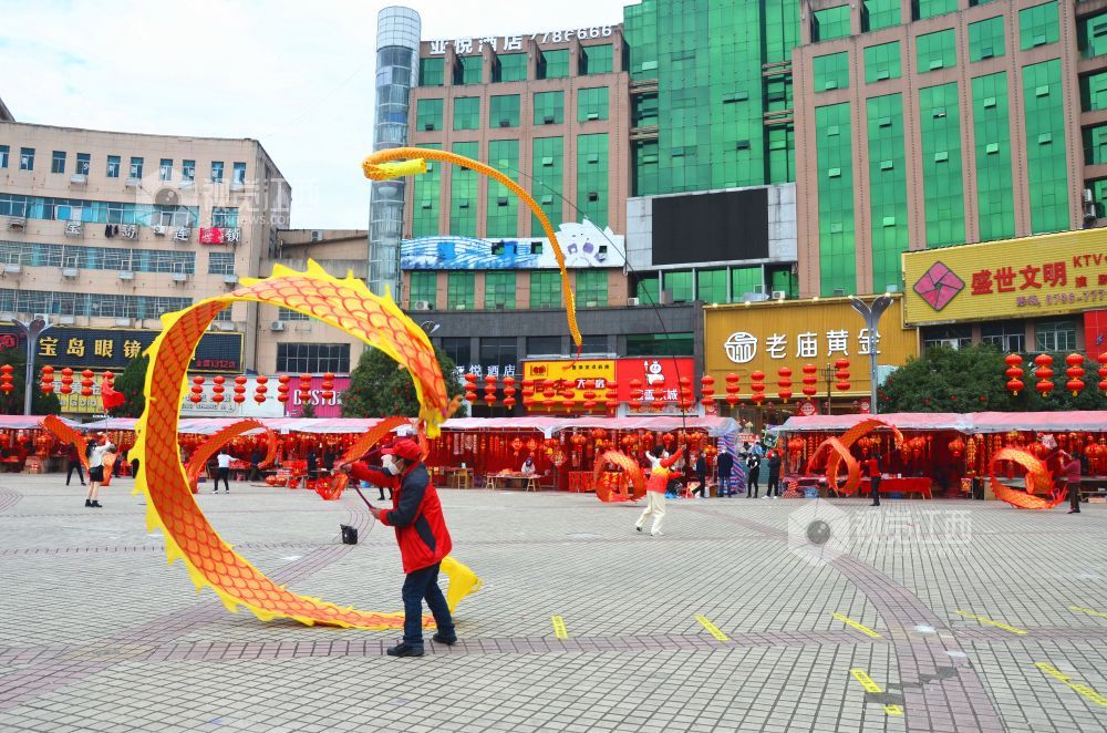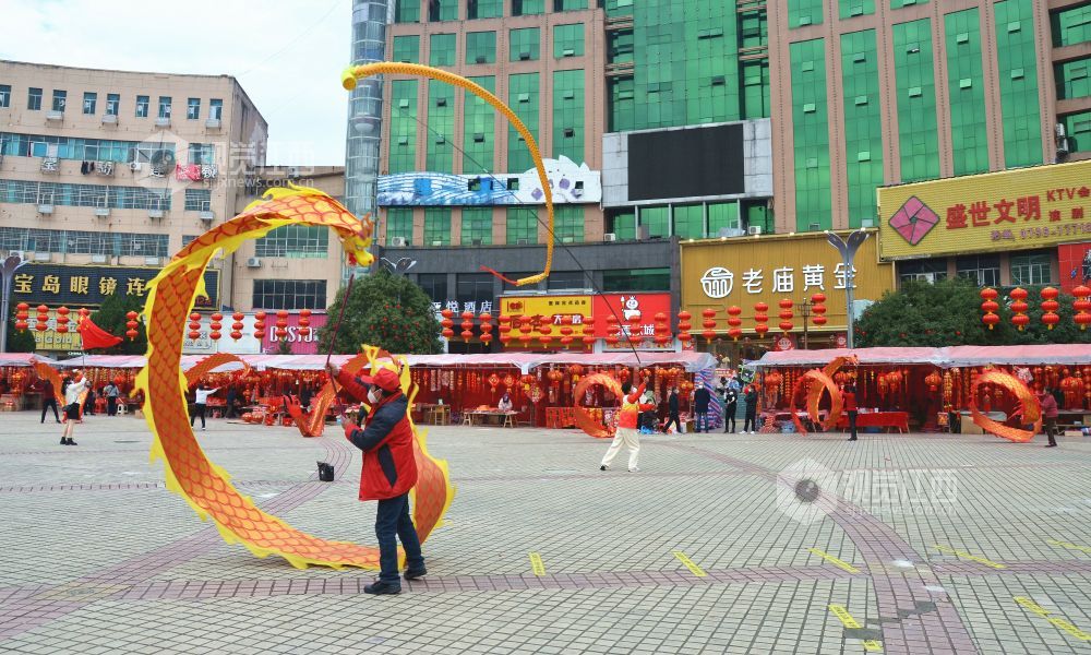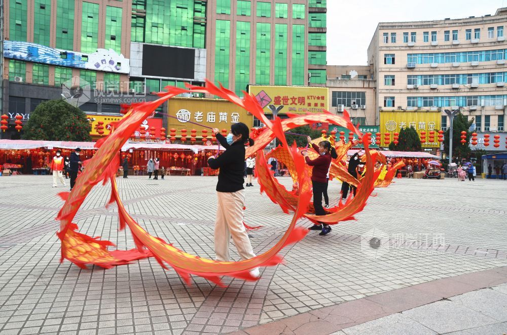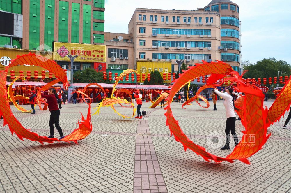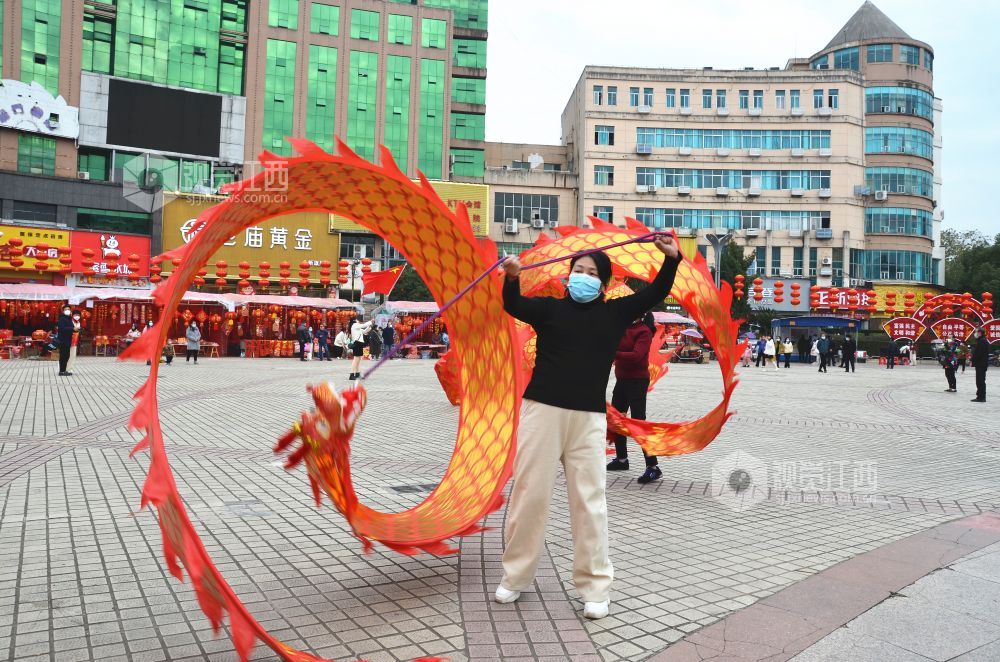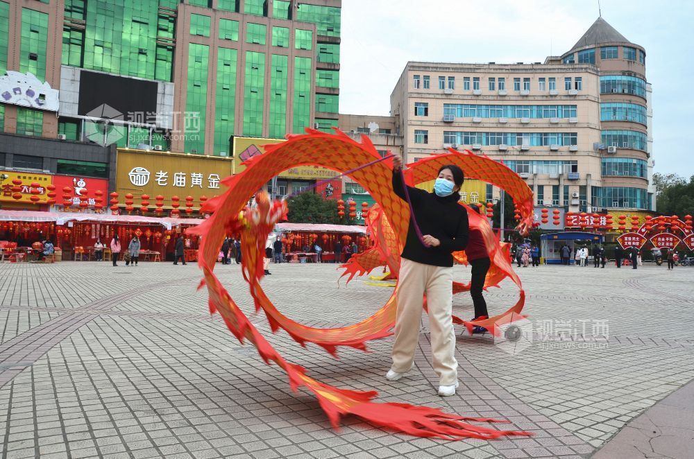 2023年1月8日下午,在江西省永新县中心广场,该县巾帼志愿者协会舞龙队的队员们舞起“彩带龙”,喜迎新春佳节的到来。