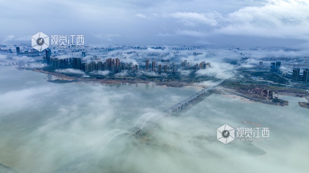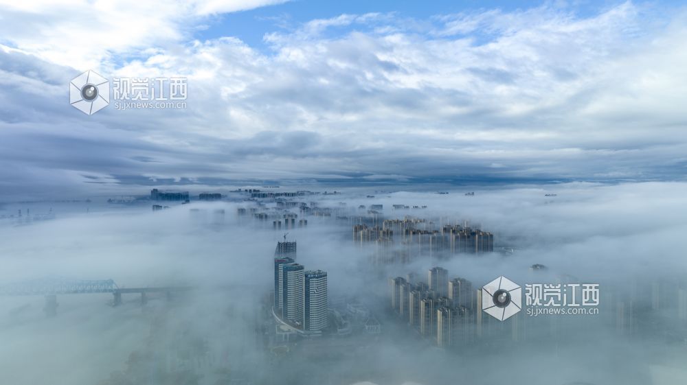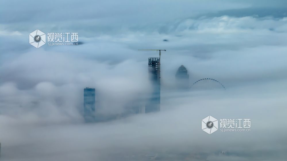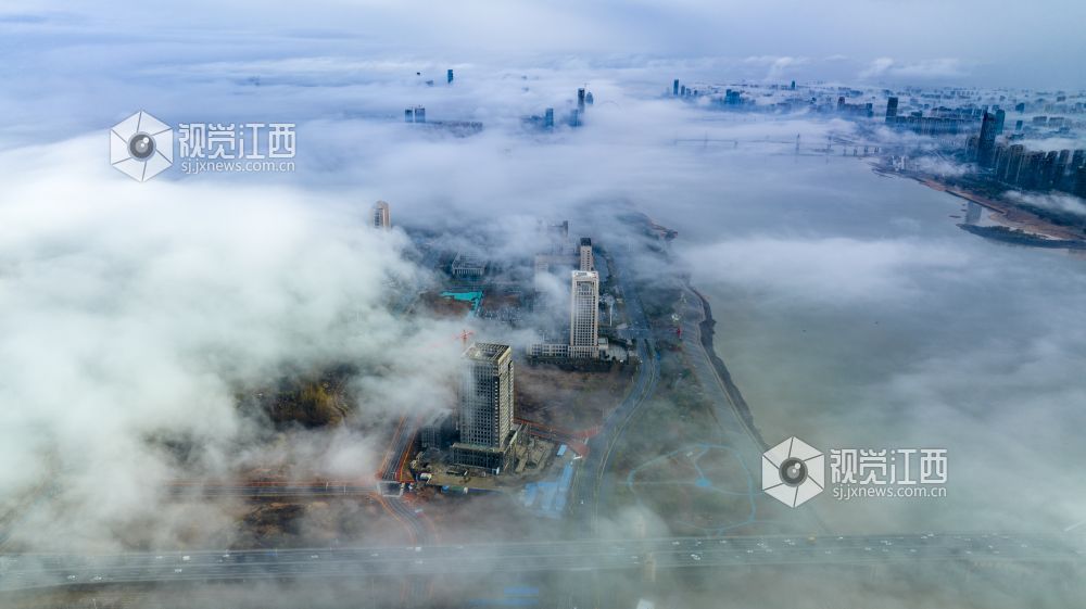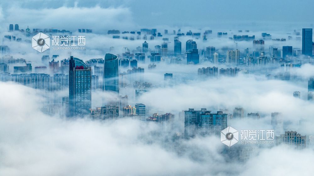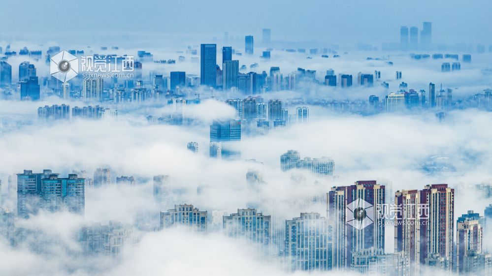 2023年1月13日,上班早高峰的一场雨后,江西省南昌市上空现短暂平流雾。城市中的建筑在云雾中缭绕,仙气十足,宛如画卷。