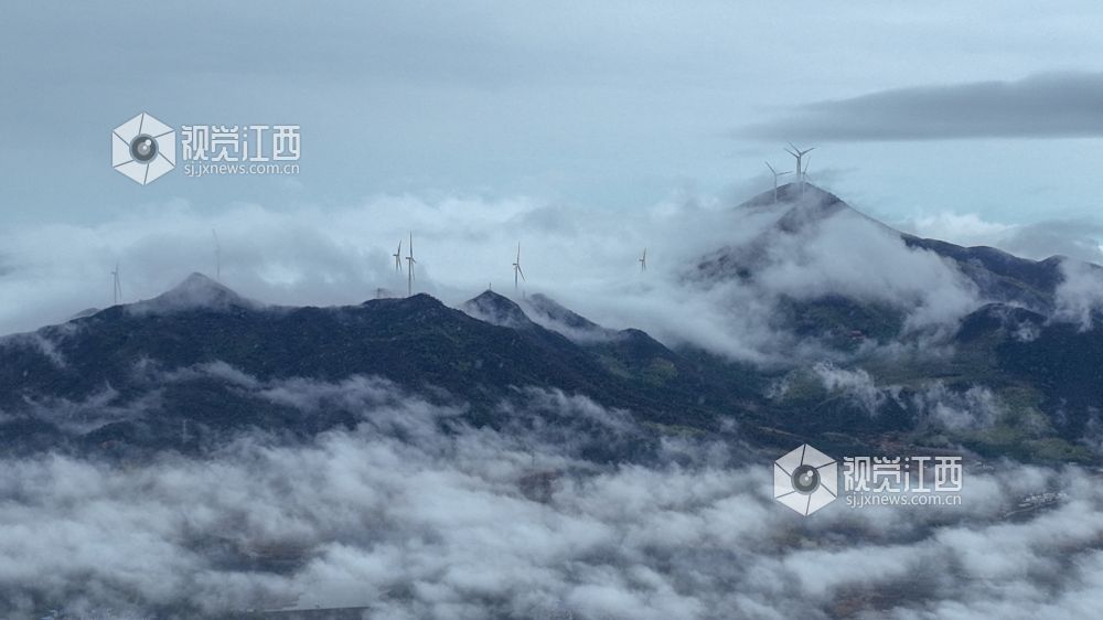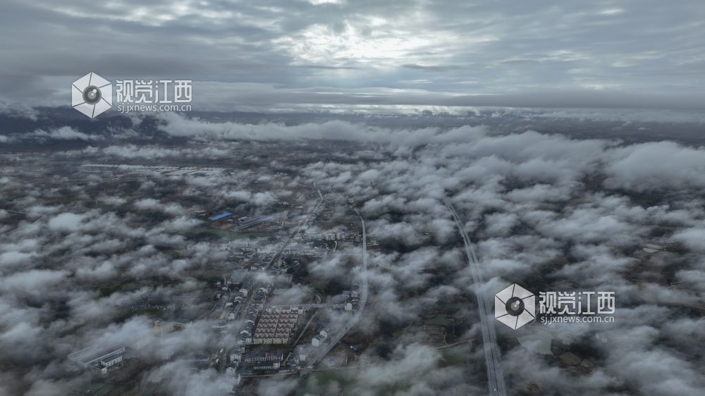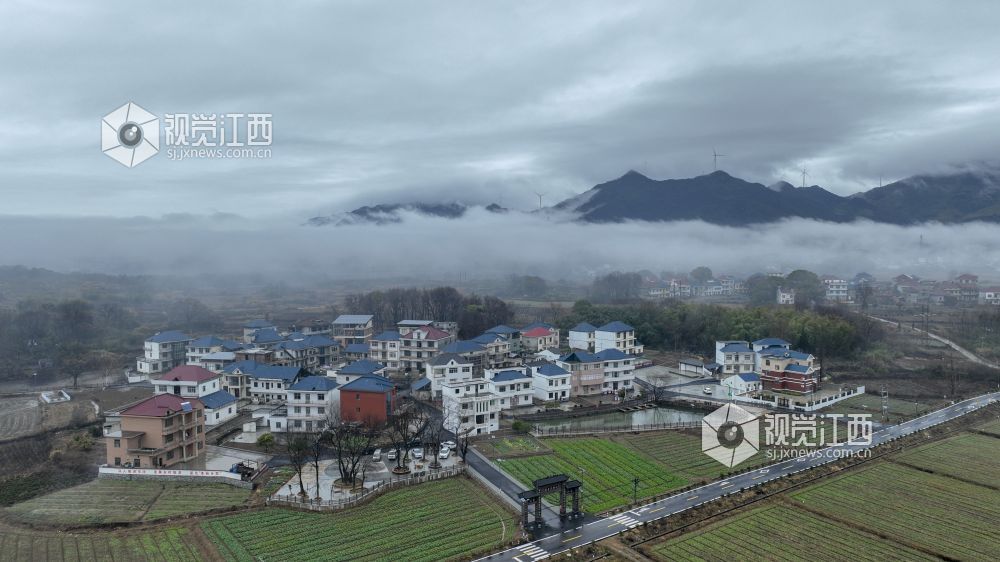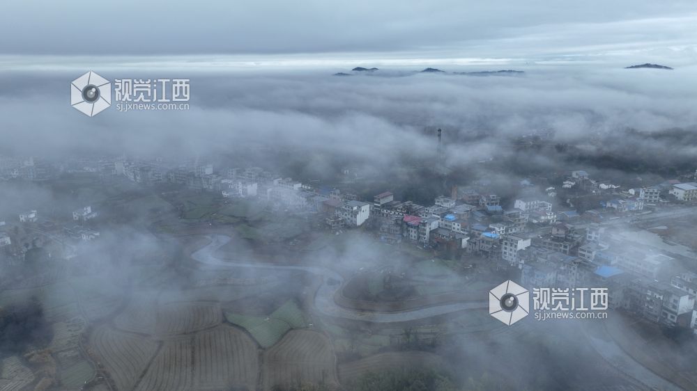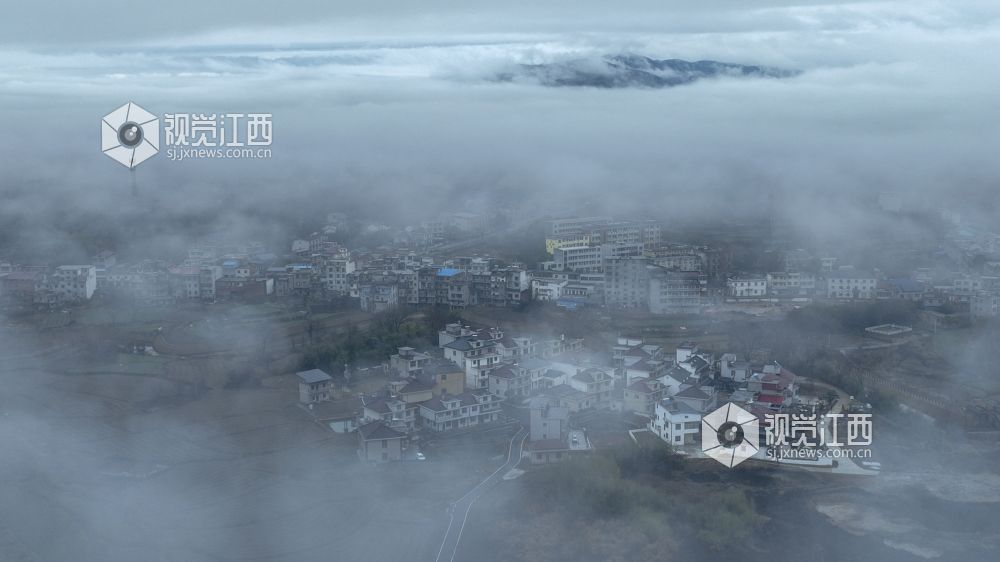 2023年1月13日上午,雨后的江西省九江市湖口县上空出现平流雾。乡村中的集镇、“宅改”新村、产业基地等在云雾中若隐若现,宛如仙境。