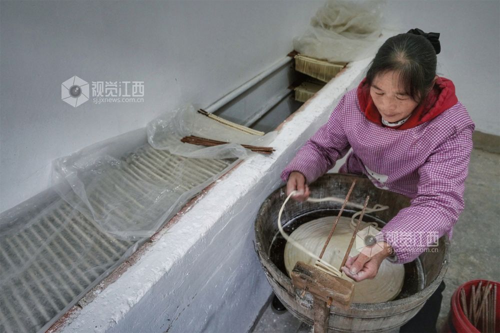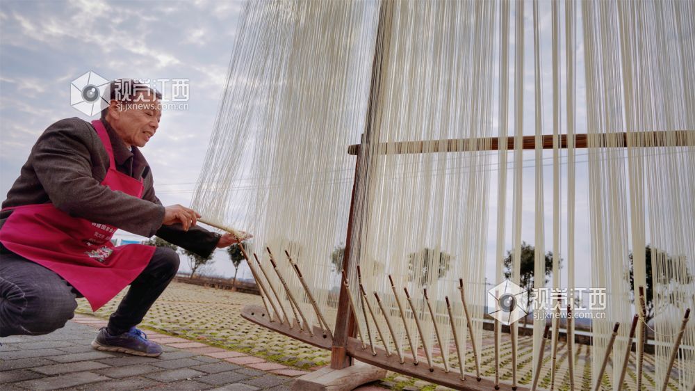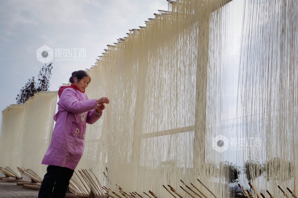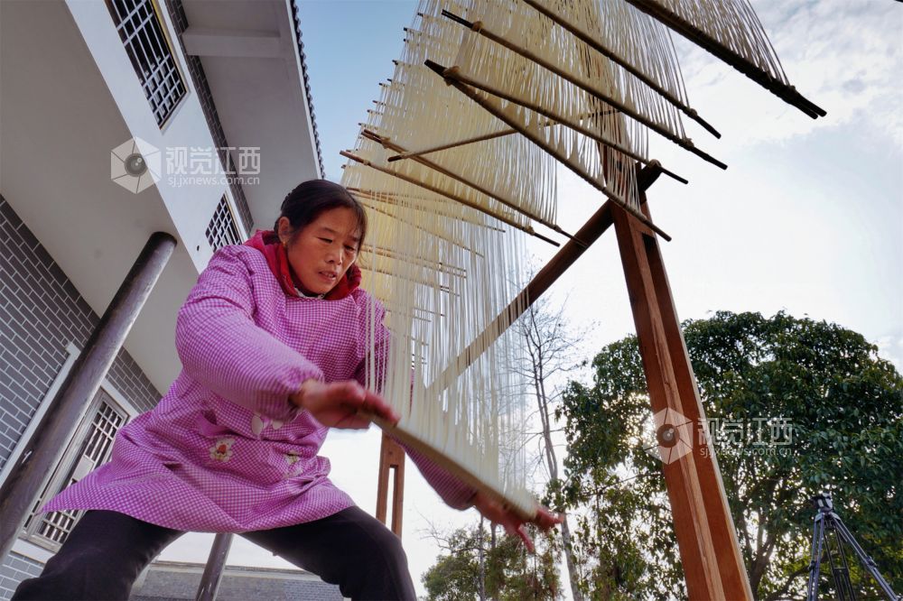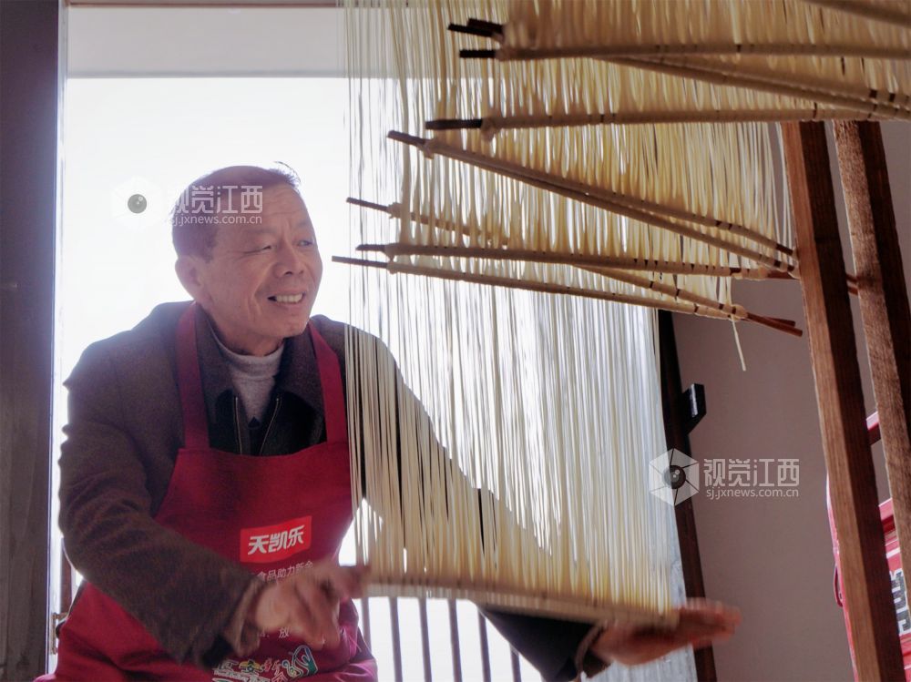 晾晒架上,一丝丝挂面无声地“晒”着黄坑村村民的幸福,为腊月里的乡村增添了浓浓年味。