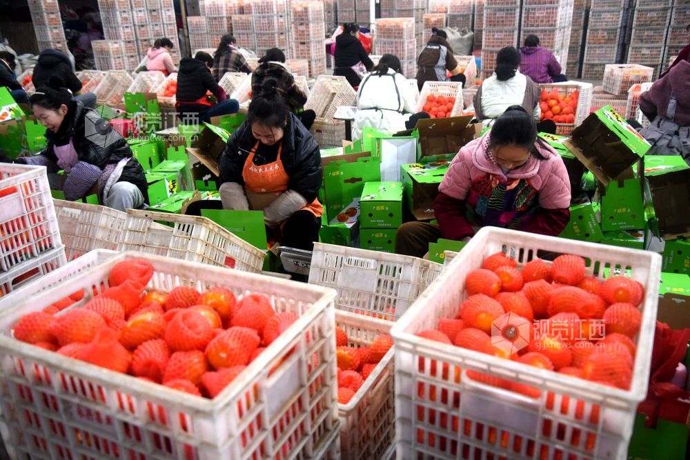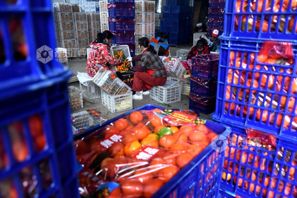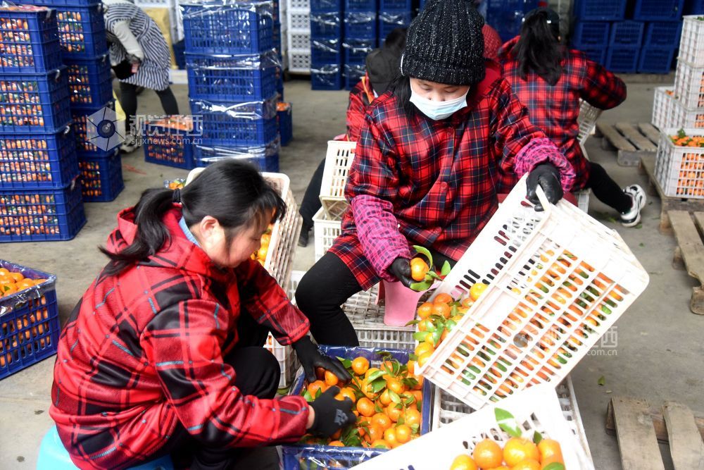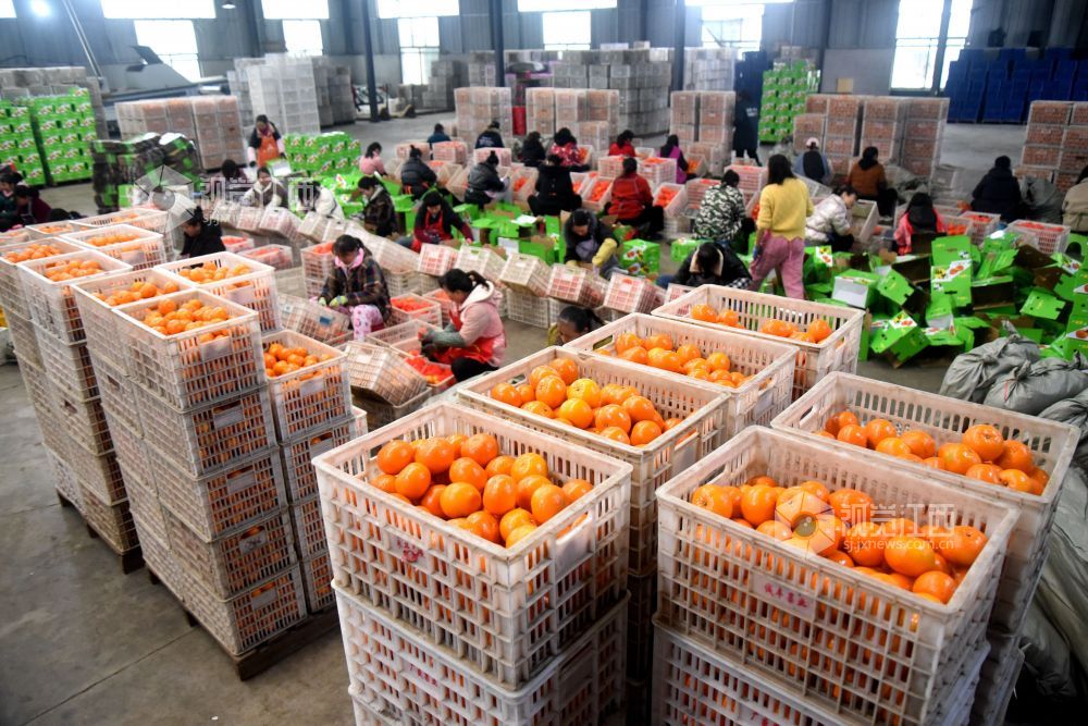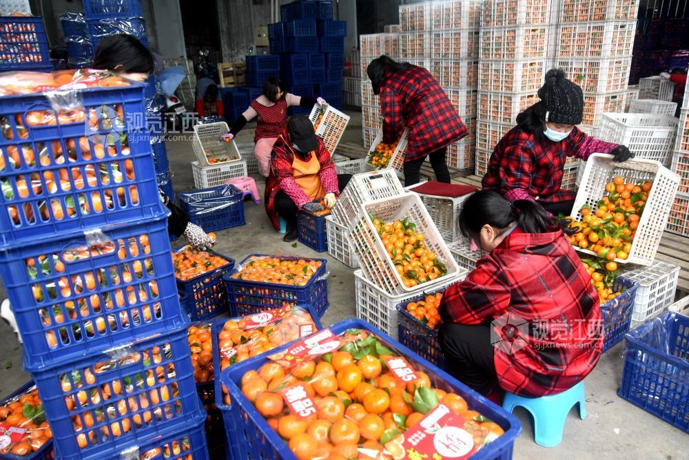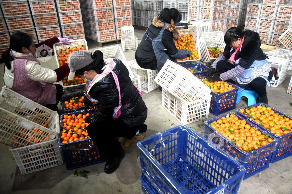 2023年1月23日,农历正月初二,江西省抚州市南丰县市山镇广盛果业合作社组织工人们分拣、加工包装南丰蜜橘、沃柑、砂糖橘等多个柑橘品种,准备销往全国各地。