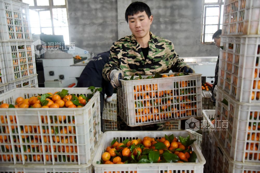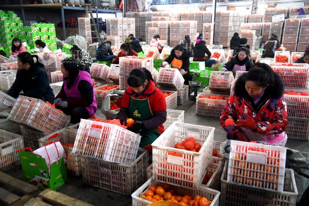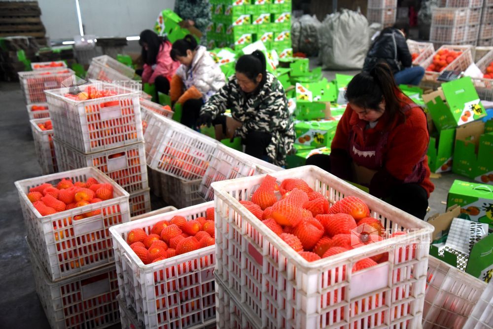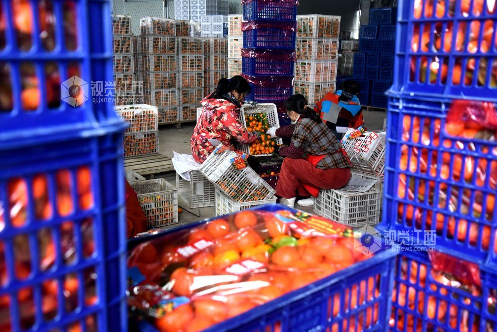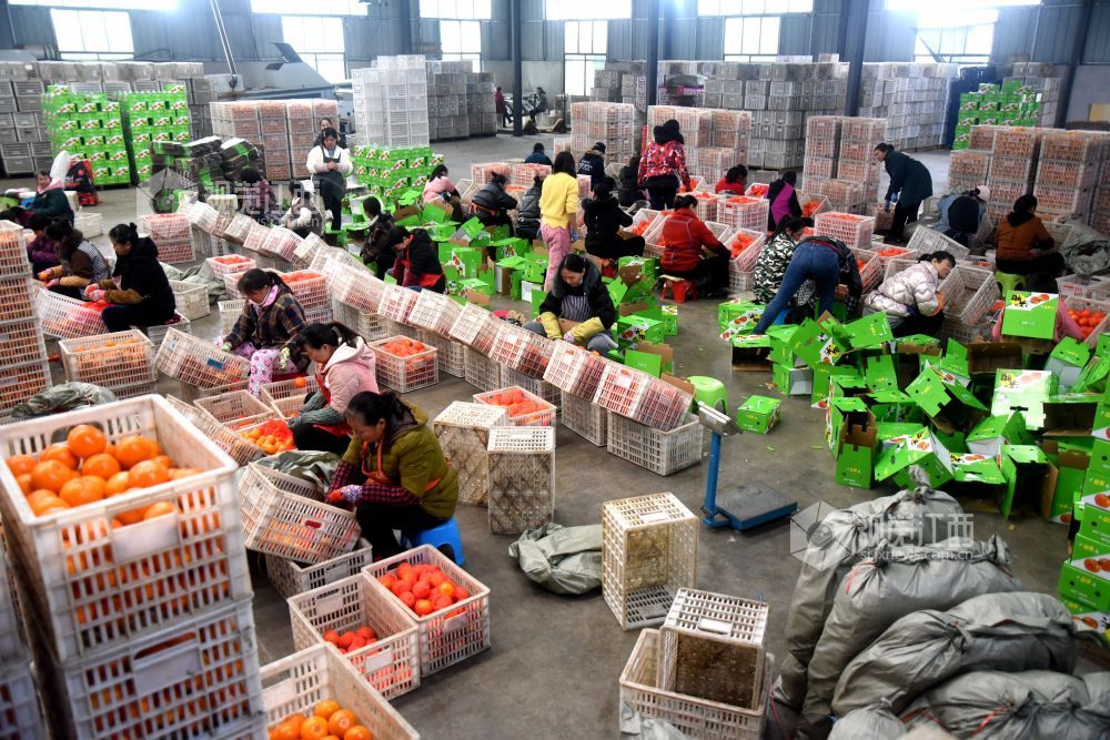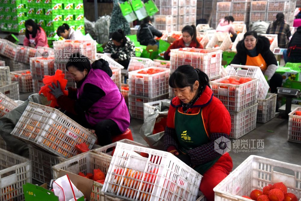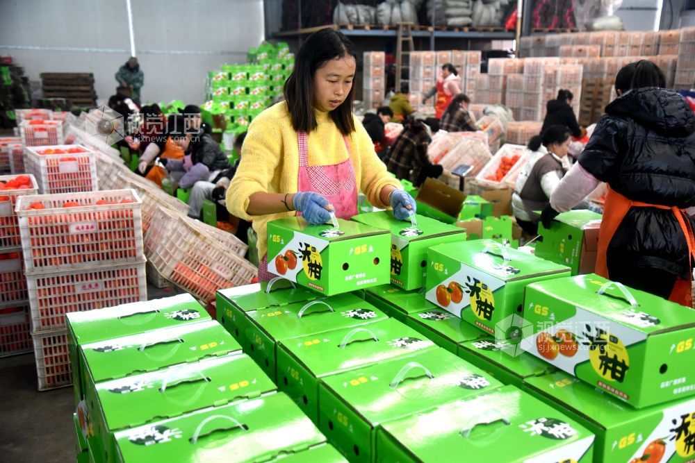 2023年1月23日,农历正月初二,江西省抚州市南丰县市山镇广盛果业合作社组织工人们分拣、加工包装南丰蜜橘、沃柑、砂糖橘等多个柑橘品种,准备销往全国各地。