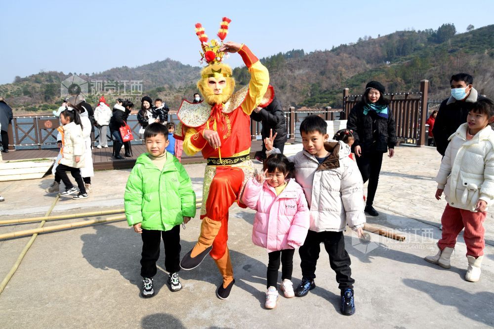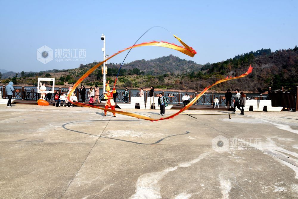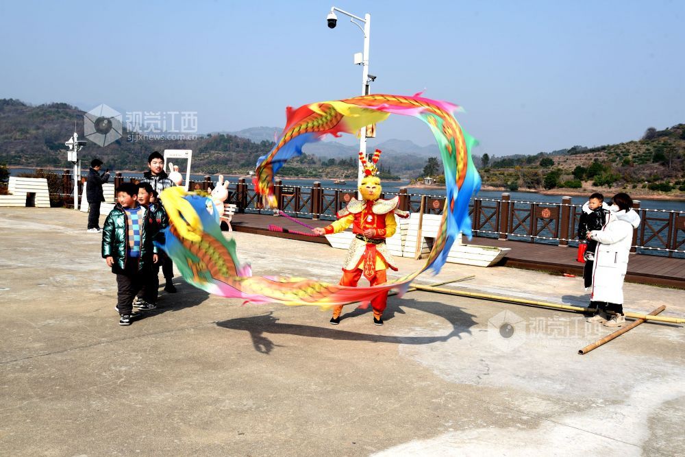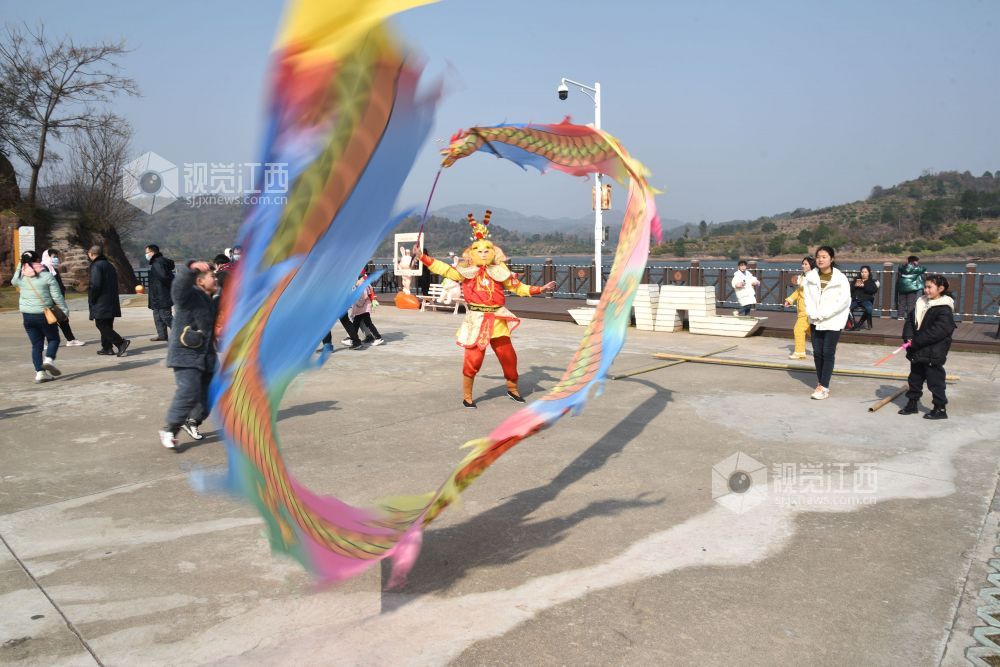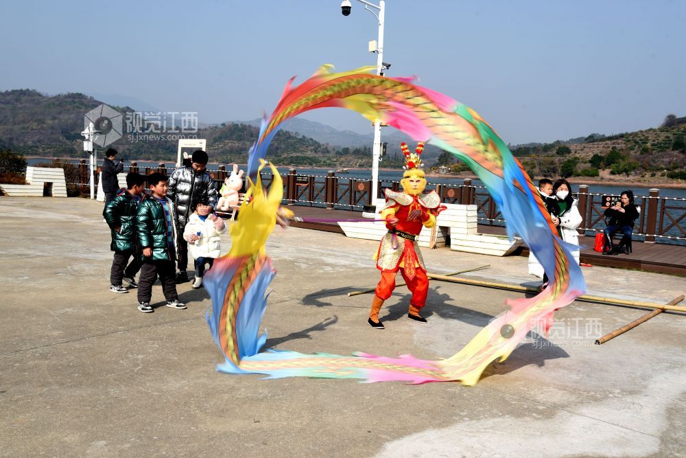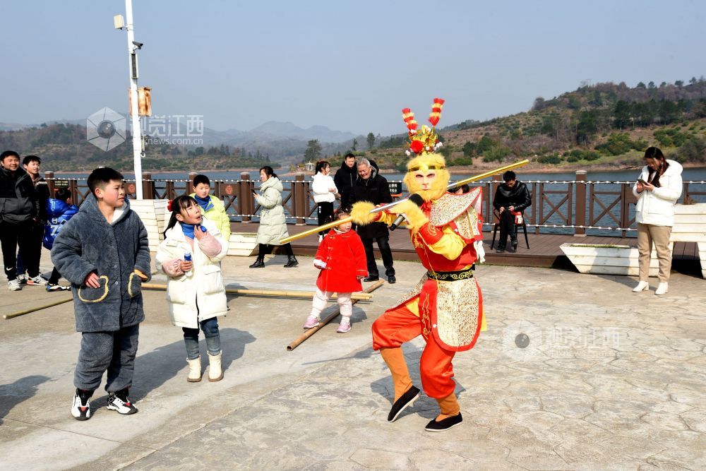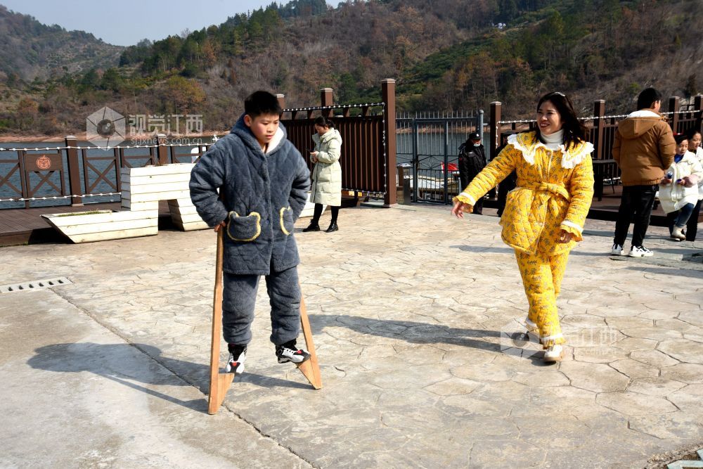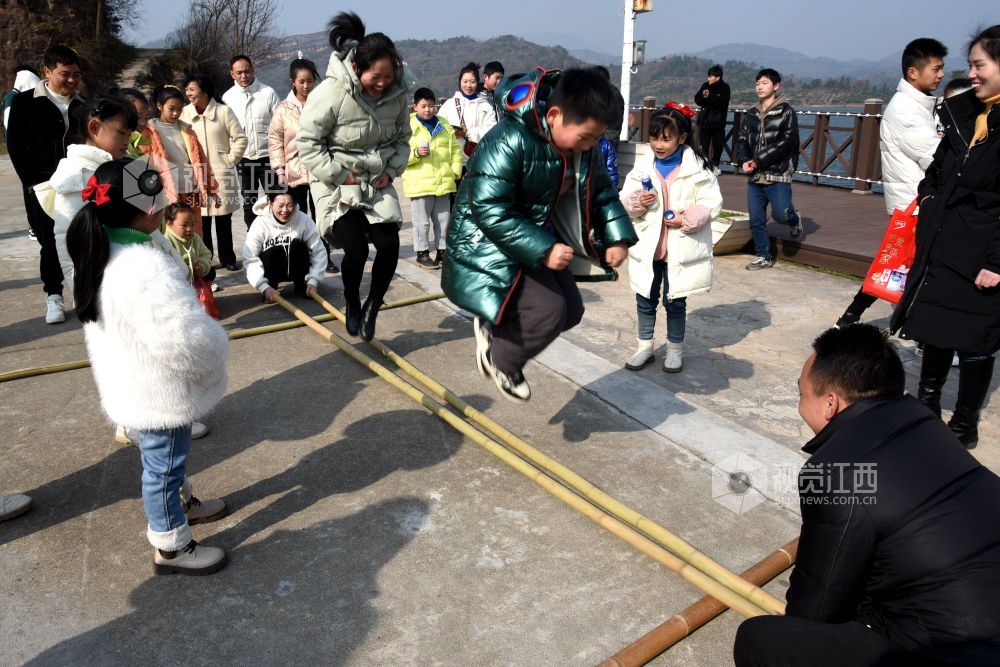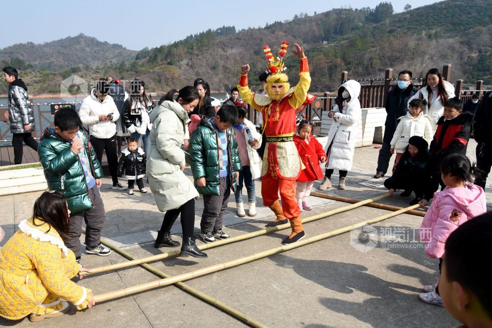 2023年1月27日,农历正月初六,江西省抚州市南丰县蜜橘湖景区,游客们在欣赏和体验跳竹竿舞、荡秋千、舞龙、踩高跷等,形式多样的花样民俗表演,深受市民和游客的欢迎。