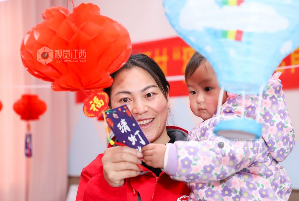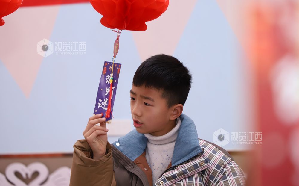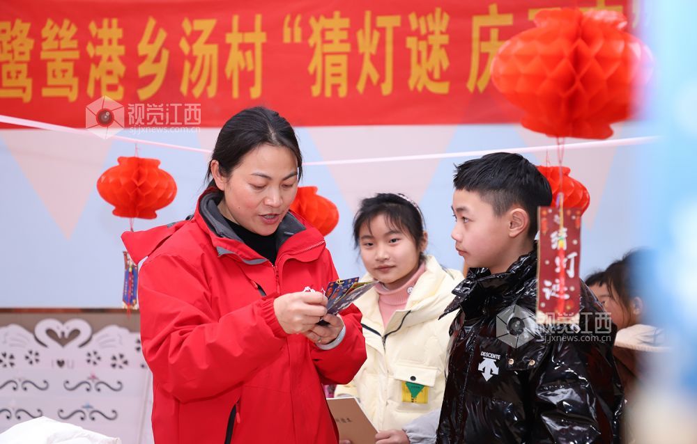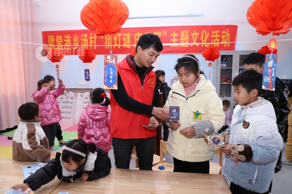 2月2日,在江西省余干县鹭鸶港乡汤村新时代文明实践站,志愿者和村里的孩子们一起猜灯谜,喜迎元宵佳节。