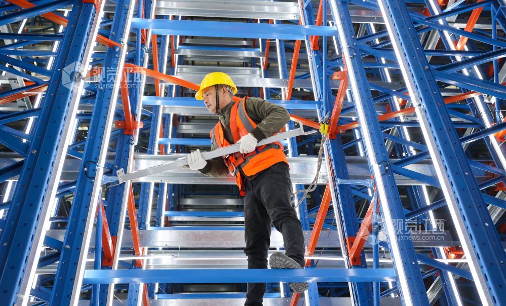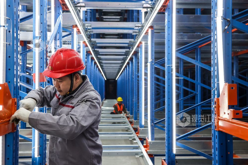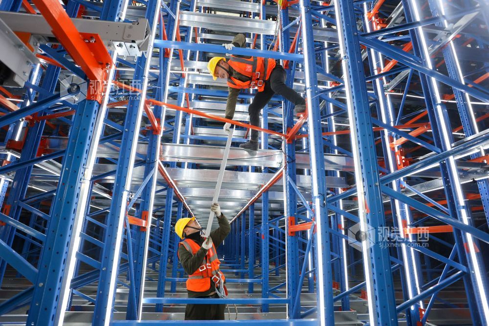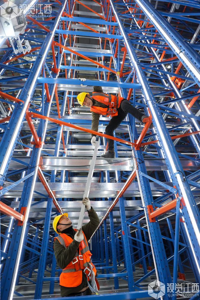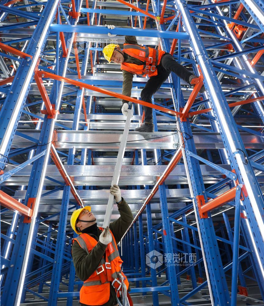 2023年2月6日,江西省瑞昌市大唐新区联盛智慧物流仓储园项目工地上,工人们正在四向车密集立体仓库内加紧施工。