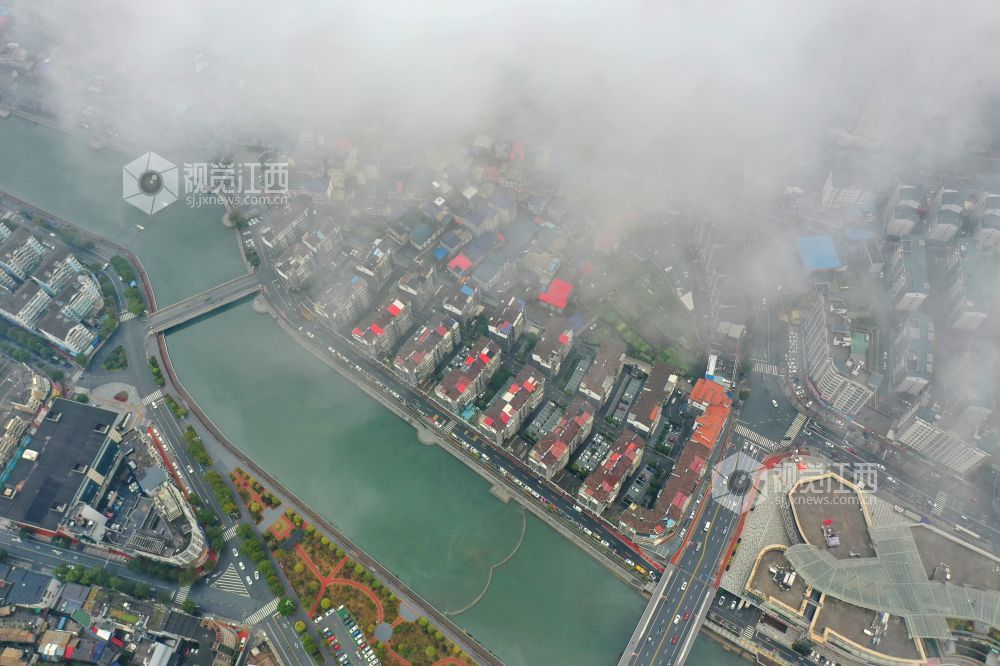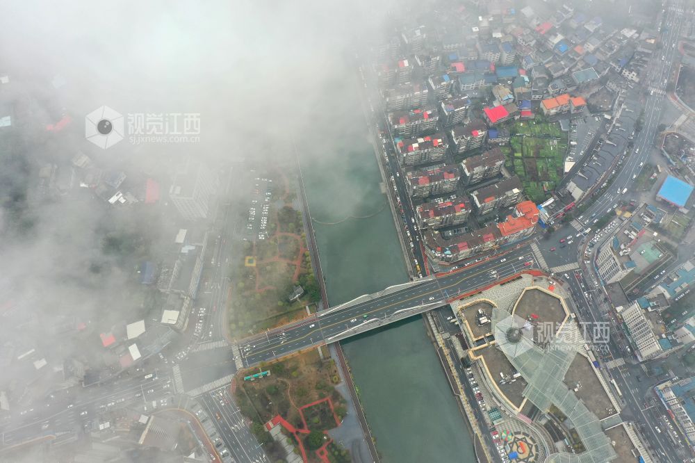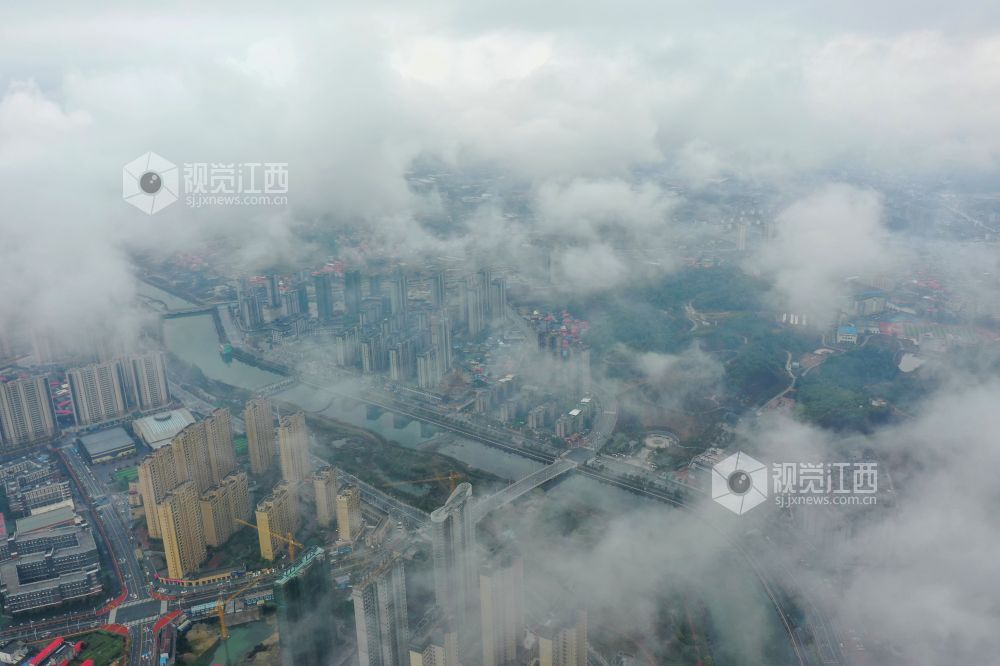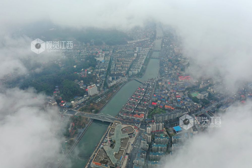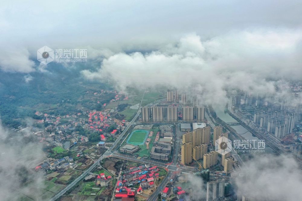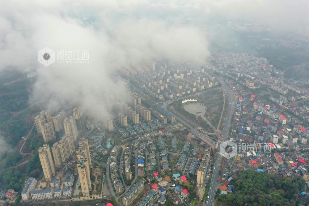 2023年2月6日,降雨过后江西省萍乡市芦溪县上空云雾缭绕,山峦间云雾翻涌,高楼?公园?道路?民居在云雾中若隐若现,宛若仙境。