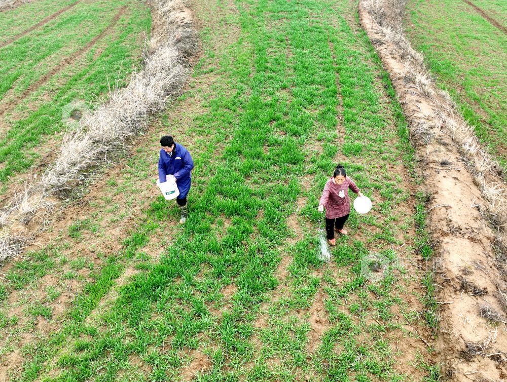 2023年2月7日,江西省九江市湖口县舜德乡兰新村农户正在对小麦施撒提苗肥。