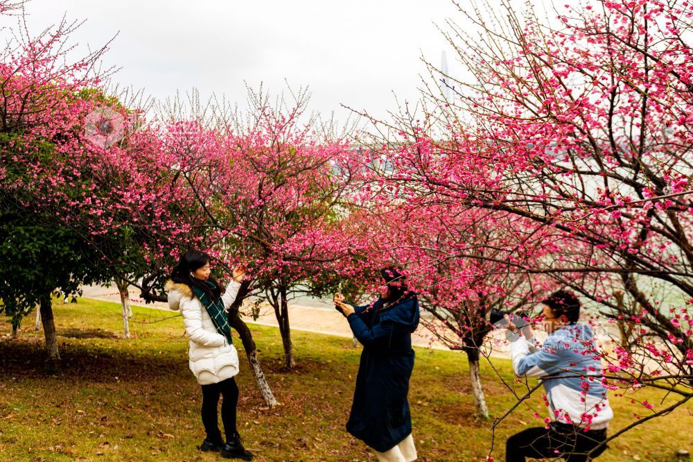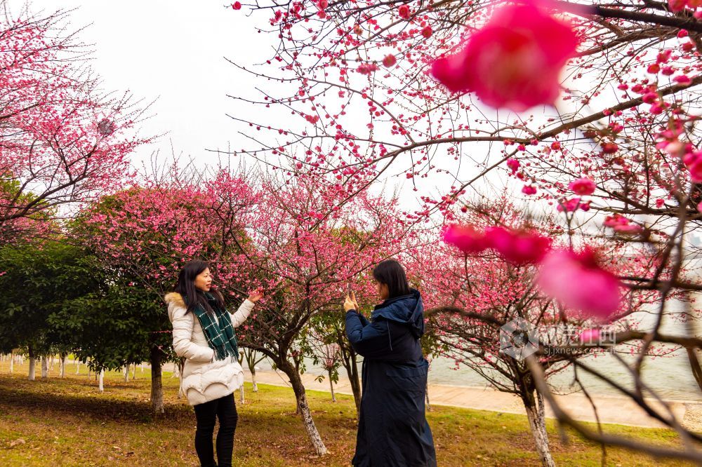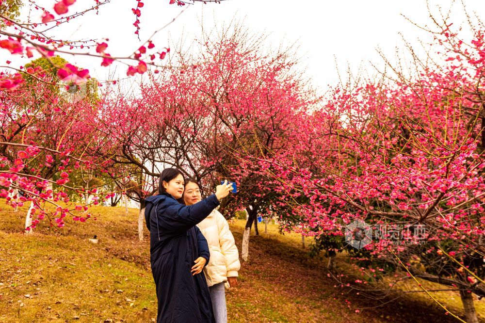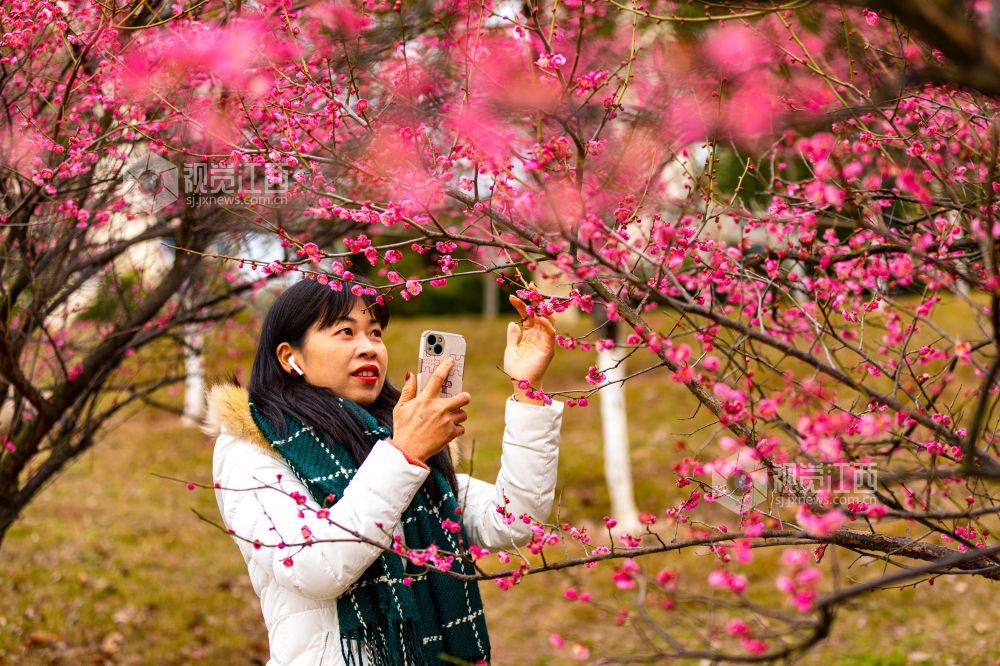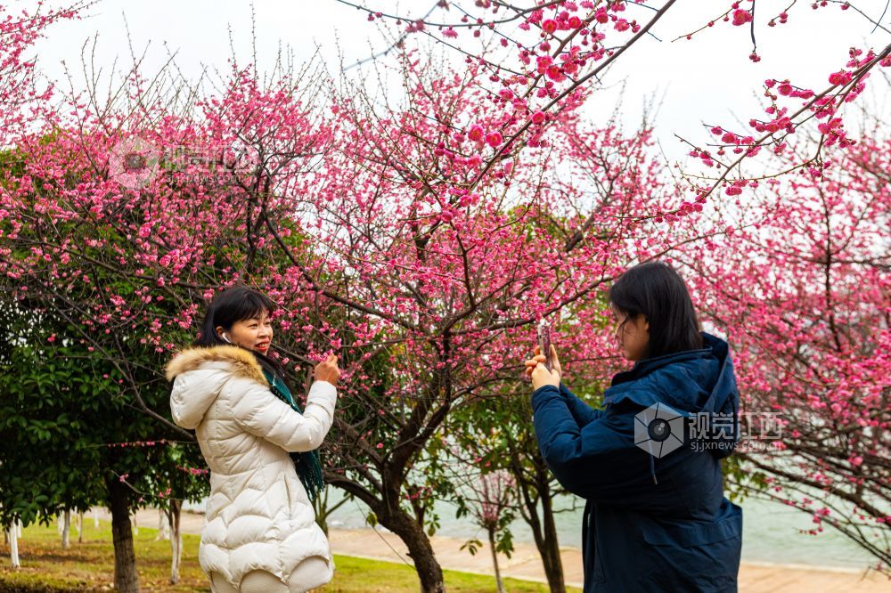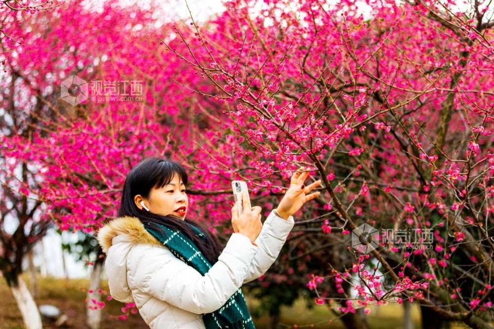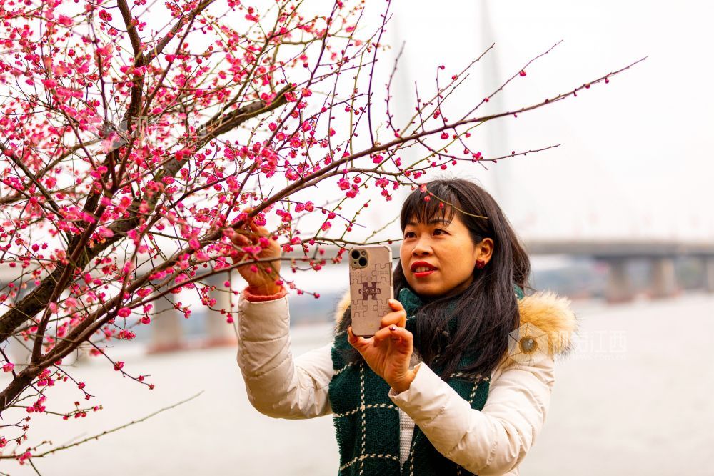 2023年2月14日,江西省吉安市吉水县赣江岸边游步道两旁红梅花开正艳,吸引了众多市民前来拍照打卡。