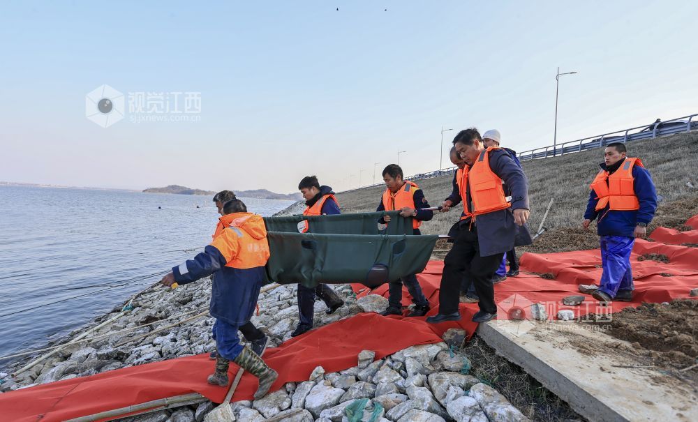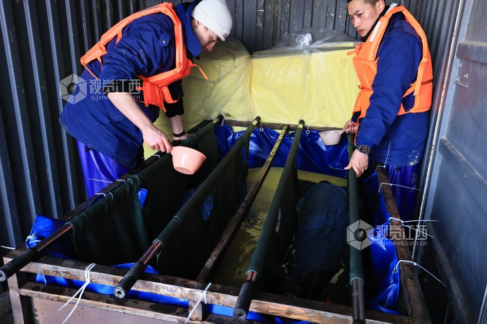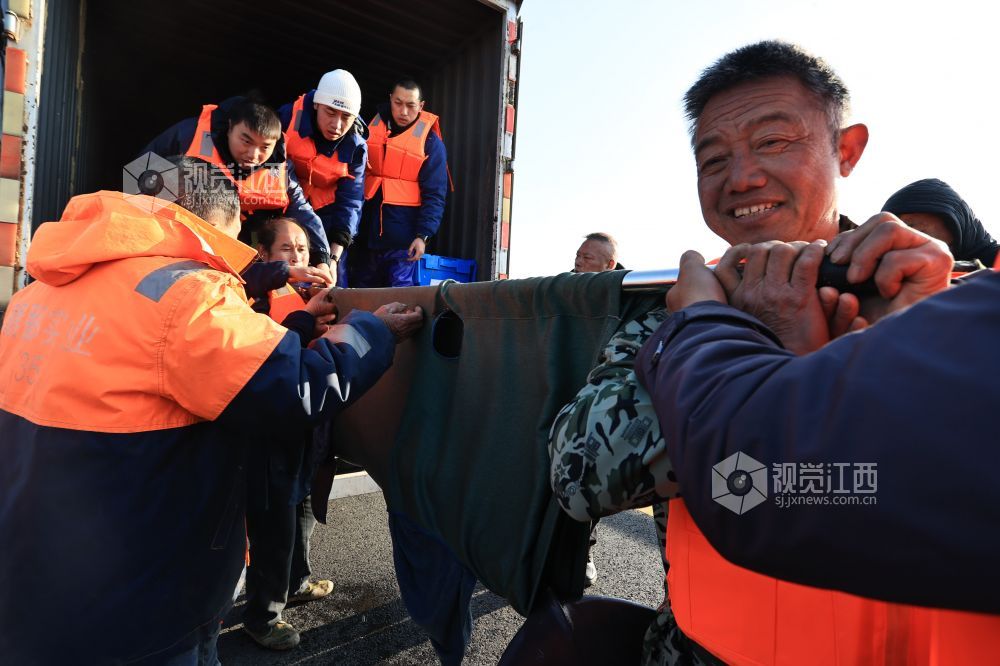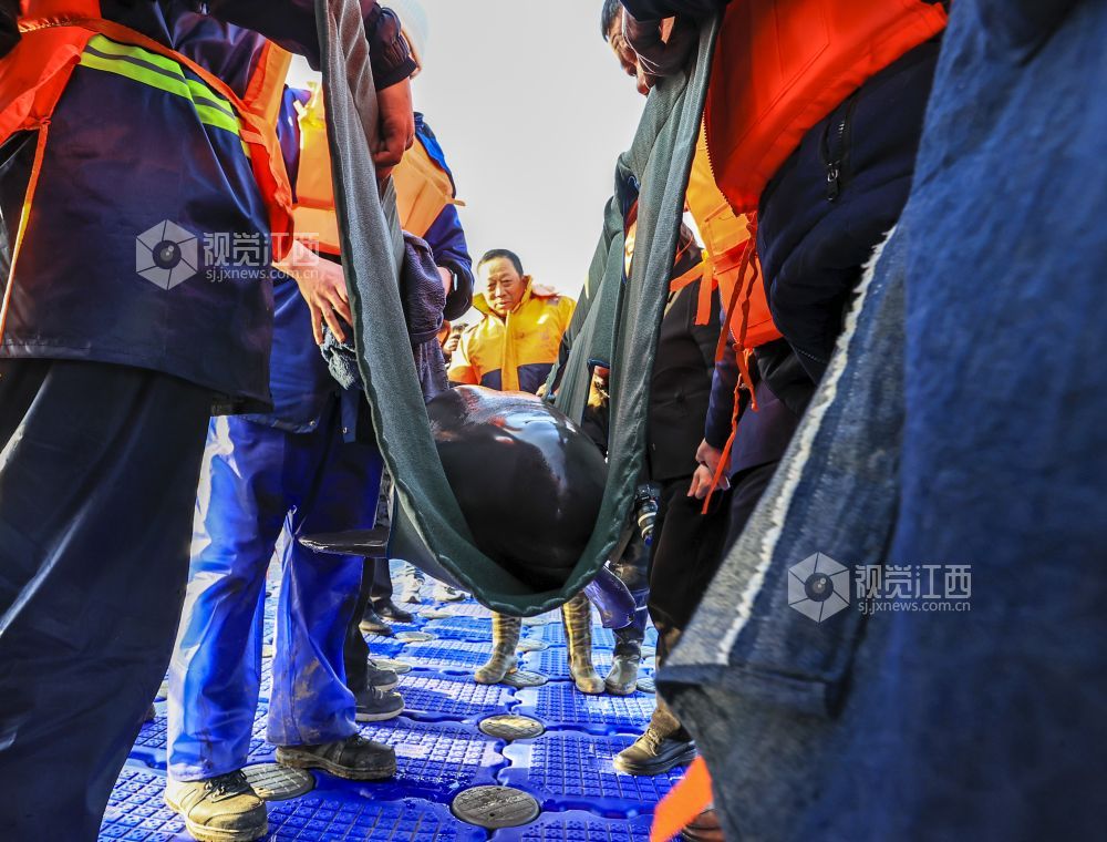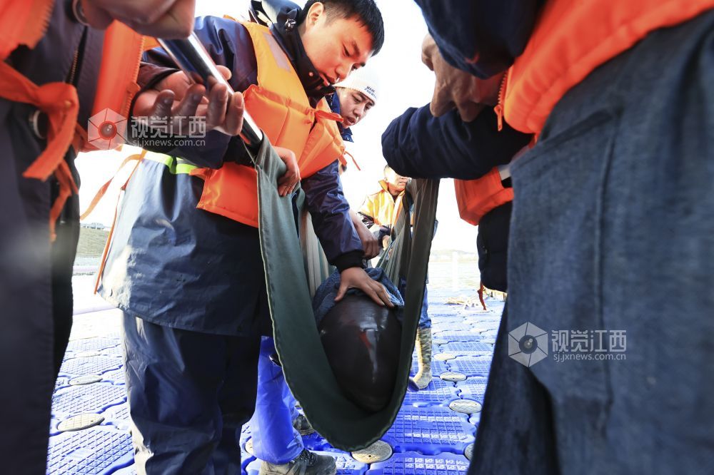 2月15日,在江西鄱阳湖松门山水域捕捞上岸的2头江豚经都昌龙口里码头运抵江西省九江市湖口县,并在科研人员指导下,被缓缓放入湖口县南北港水域中。