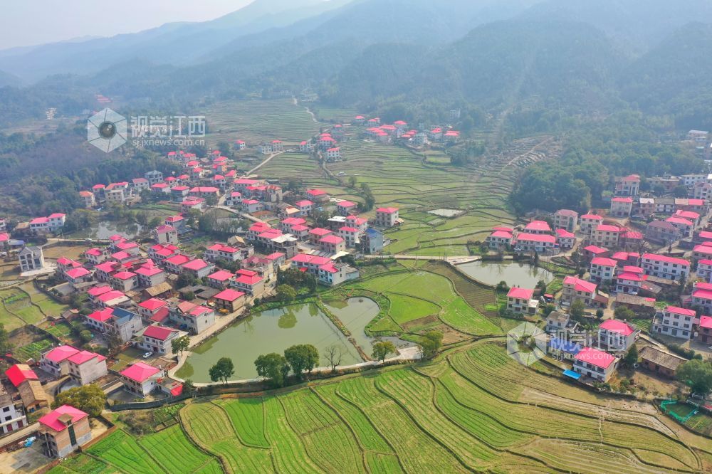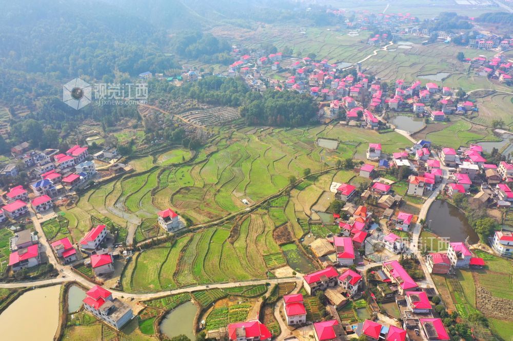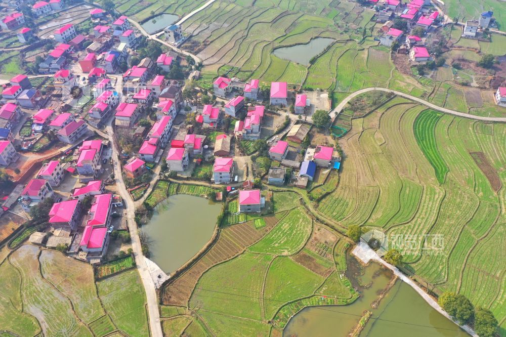 2月16日,俯瞰江西省萍乡市芦溪县芦溪镇丰泉村,田野与乡间公路、民房、群山相互交织,构成了一幅美丽的田园春景。