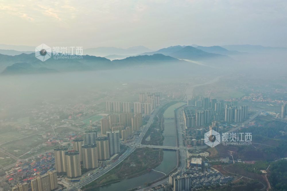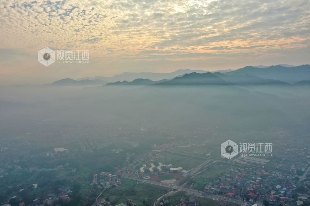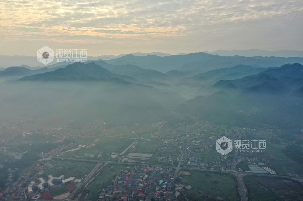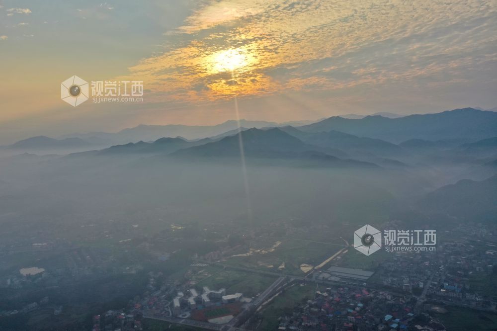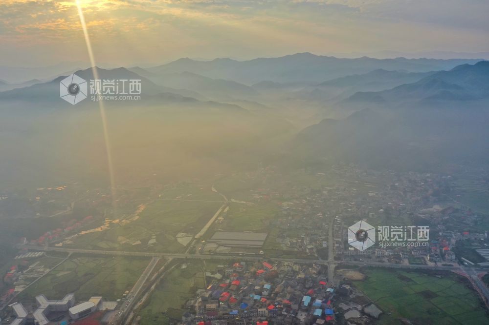 2023年2月18日清晨,在江西省萍乡市芦溪县,随着太阳慢慢升起,地面出现一层淡淡的平流雾,山峦、村庄、田园、晨雾在夏日朝阳的映射下,显得格外美丽,宛若仙境。