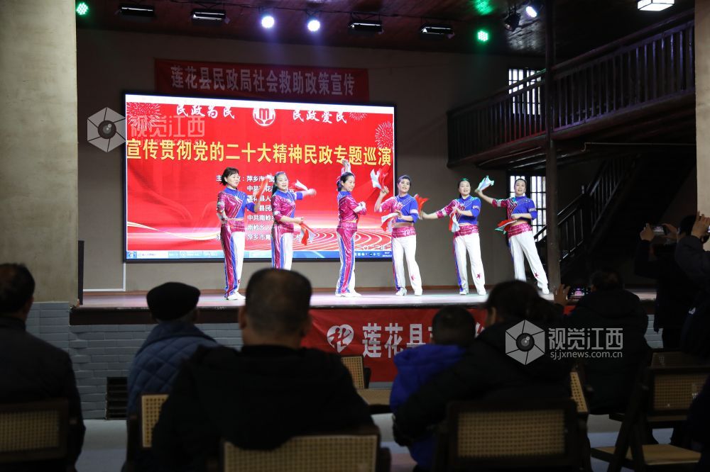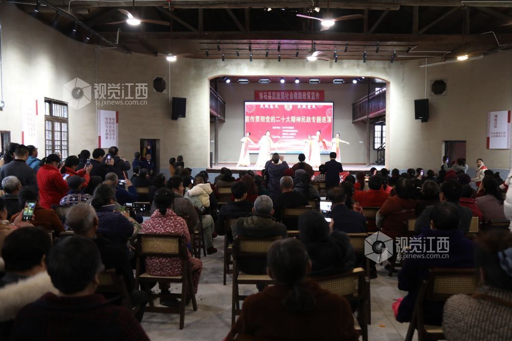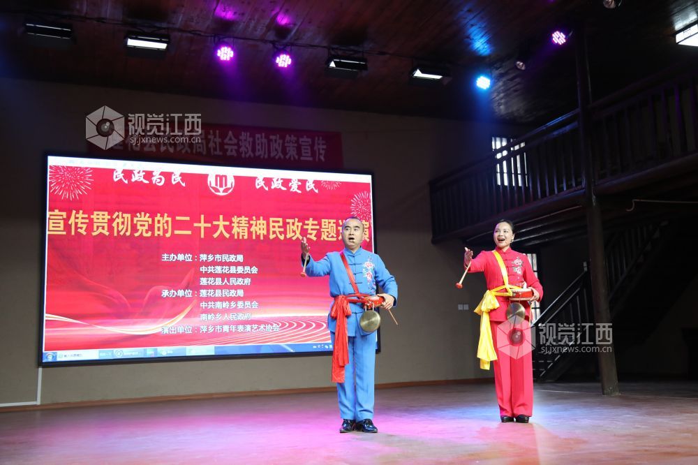 2月22日下午,萍乡市宣传贯彻党的二十大精神民政专题巡演在莲花县南岭乡岭水村礼堂启动。活动中,该市巡演团的文艺工作者通过快板、舞蹈、歌曲、小品以及知识问答等形式向村民宣传养老服务 、未成年人保护 、殡葬改革 、廉洁村社建设、福利彩票、社会救助、移?易俗等法律、法规、 政策。通俗易懂的语言,丰富多彩的文艺节目,吸引了400名村民观看。据了解,该活动将在全市各个县区巡演。