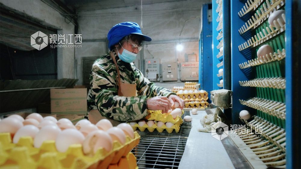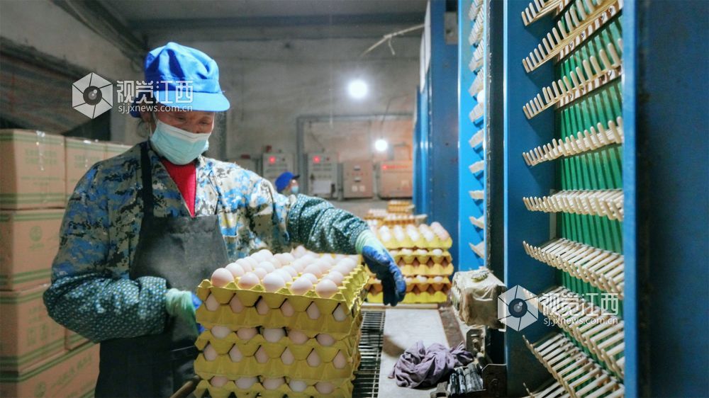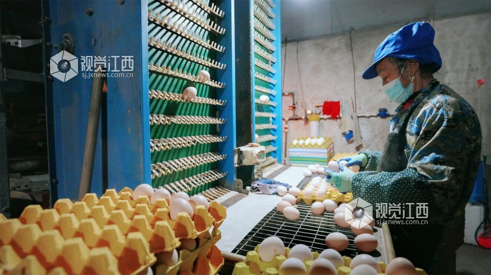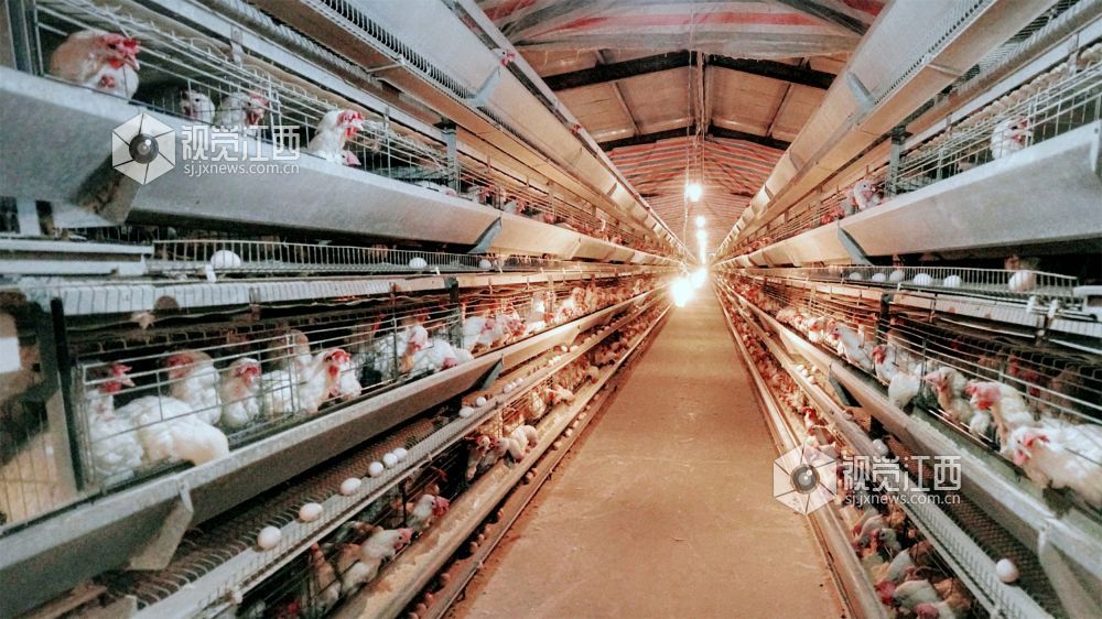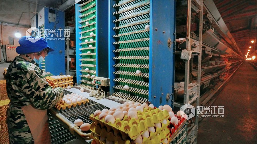 2023年2月23日,在江西新余高新区水西镇彭家村委自动化养鸡场里,一排排标准化鸡笼一字排开。鸡舍内排风、饮水、喂养、恒温、清粪等全部实现自动化处理。鸡蛋通过传送带源源不断地输送,工人们正忙着对鸡蛋进行分拣、打包,一派繁忙景象。