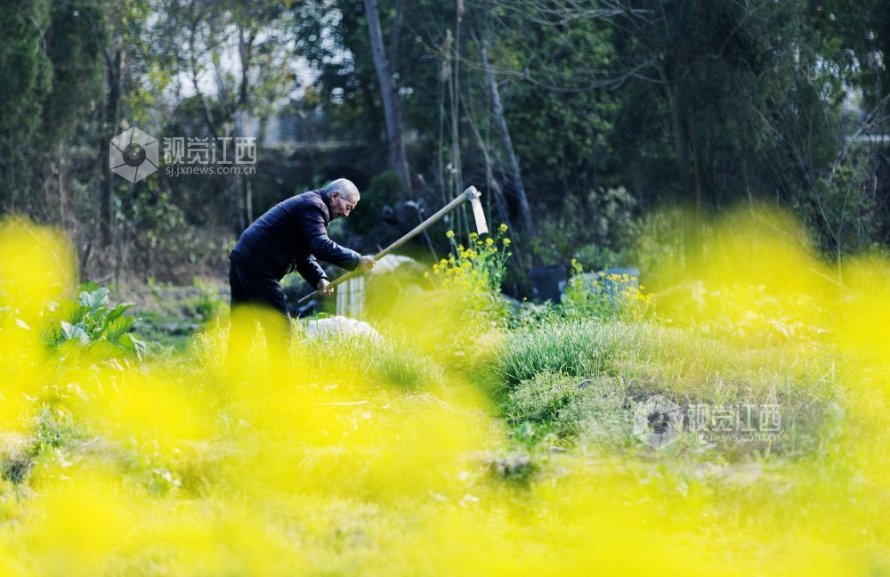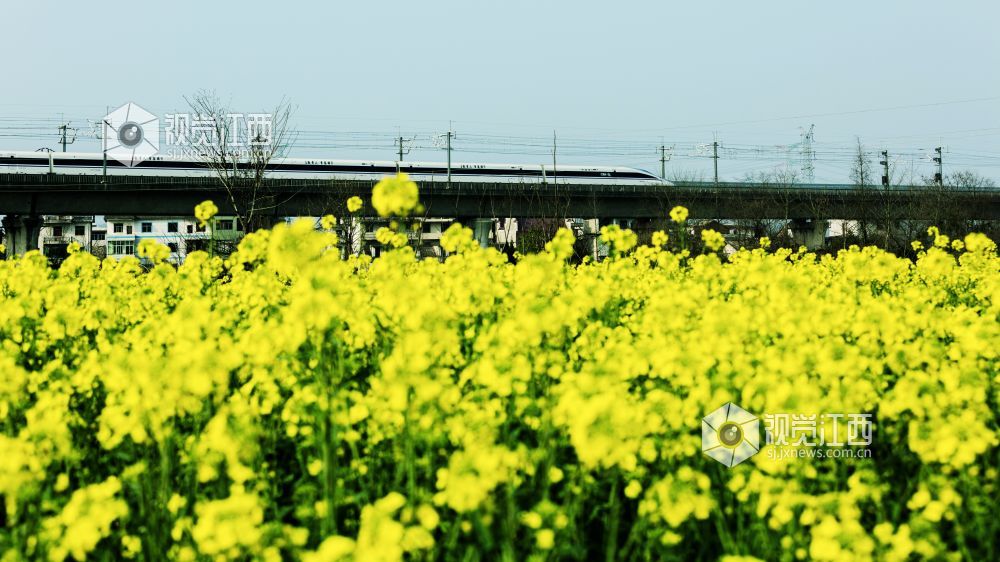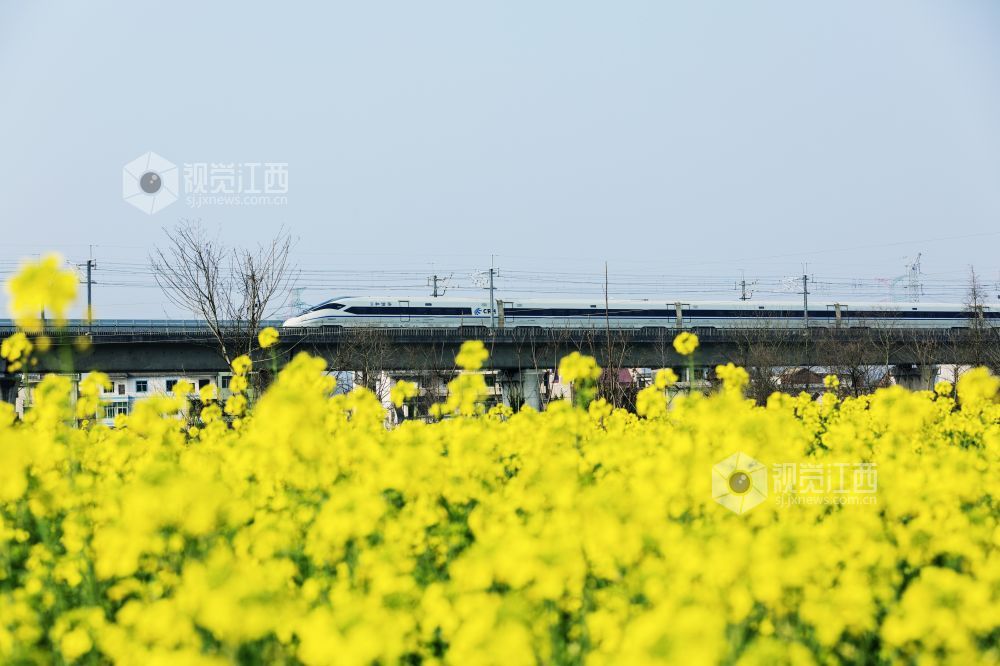 2月25日,春风拂过,万物吐绿,江西省新余仙女湖区观巢镇沪昆高铁两旁的油菜花竞相开放,勤劳的小蜜蜂在金灿灿的花丛里飞来飞去,辛勤采蜜。农民们也在油菜田间辛勤劳动。一辆辆高速列车在油菜花海中往来穿梭,形成了一幅幅美丽动人的画面。
