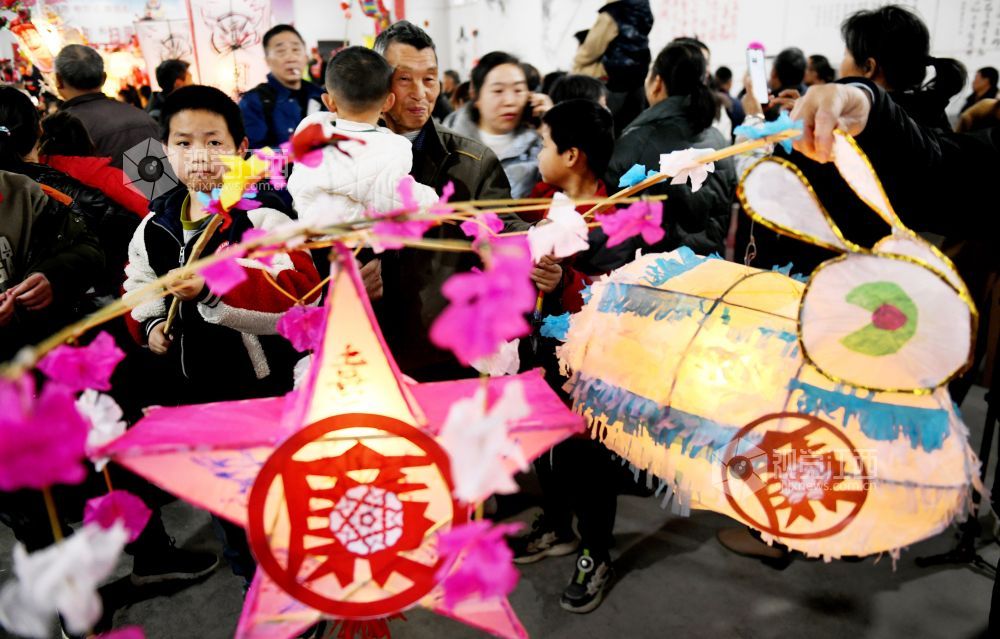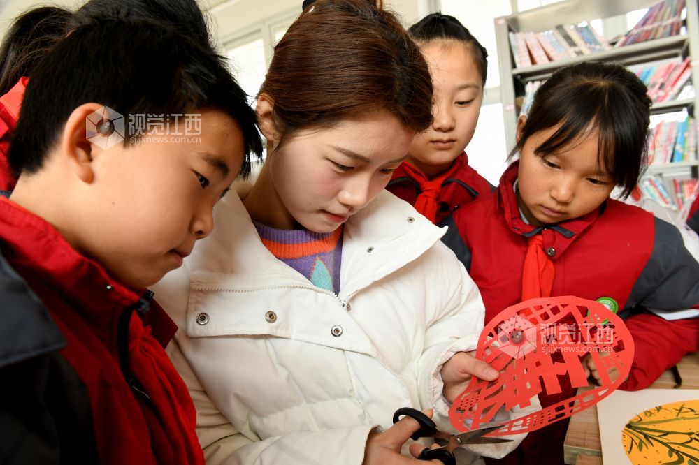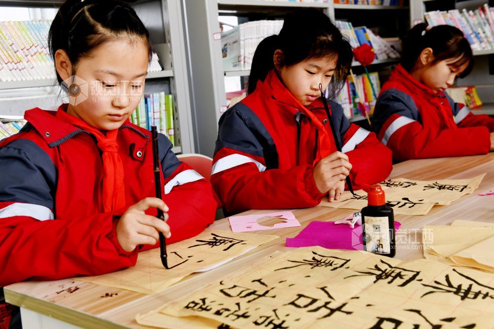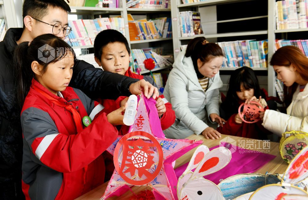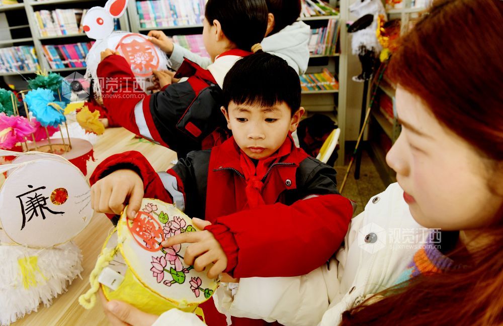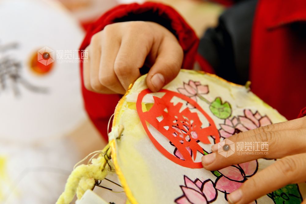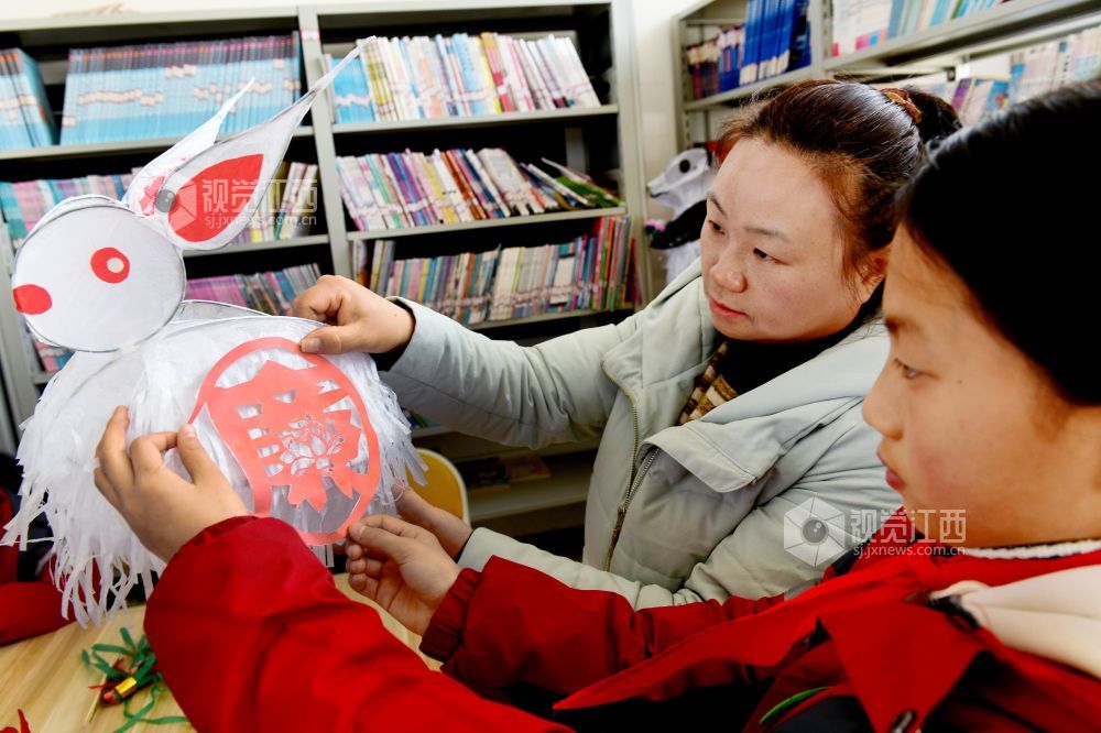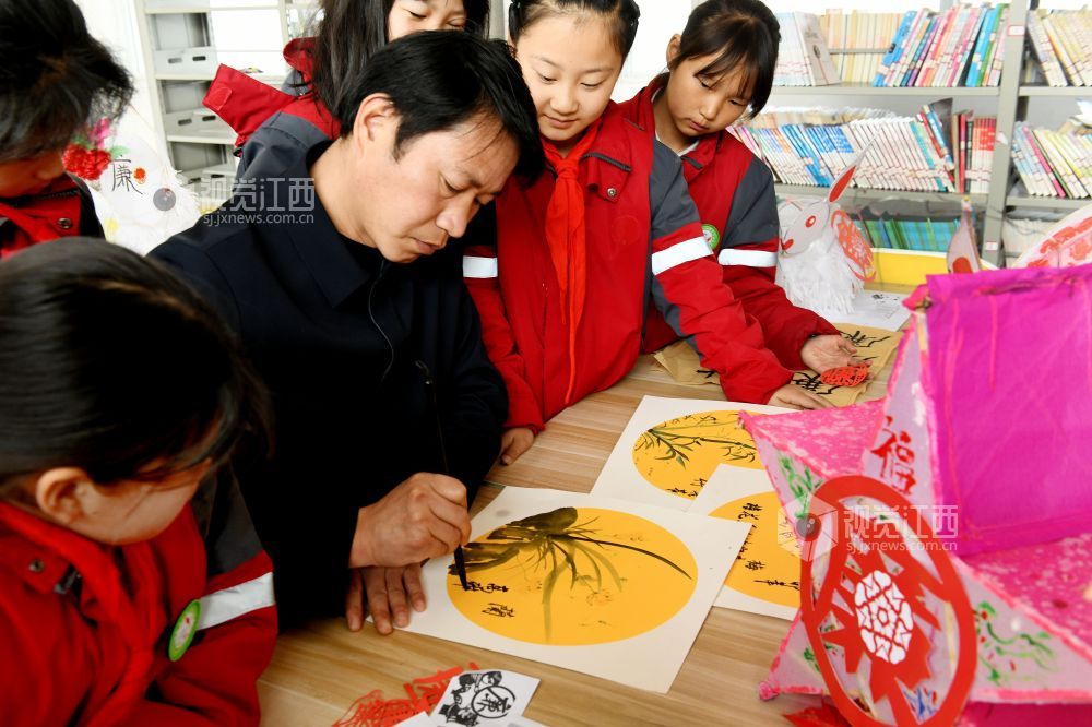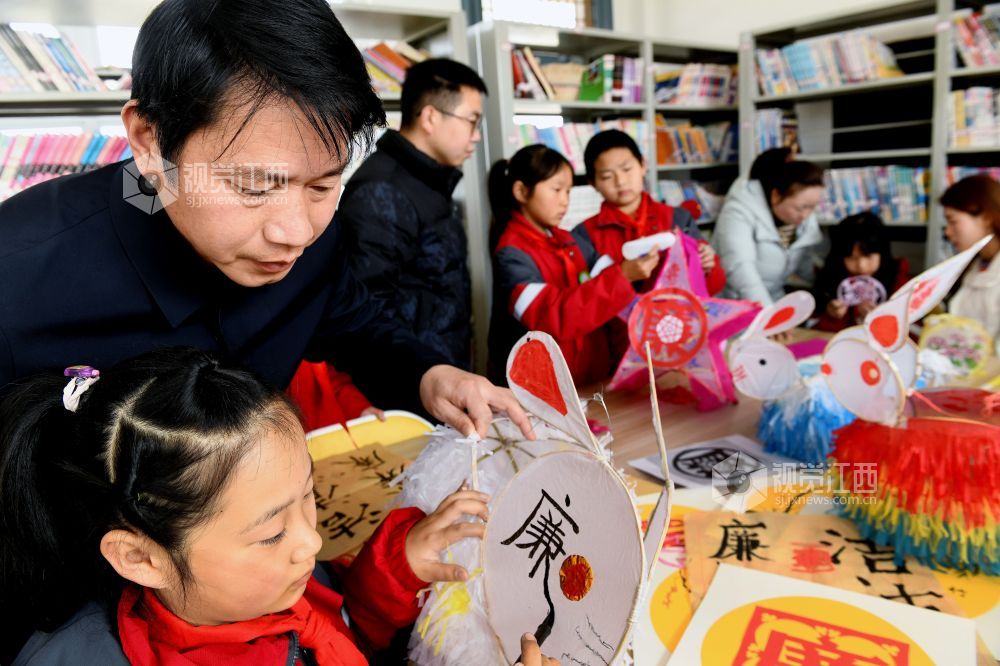 2023年2月25日,在江西省德兴市新岗山镇新岗山中心小学的老师正在指导学生在花灯上书写廉字,将廉洁文化融入到当地的民俗花灯中。