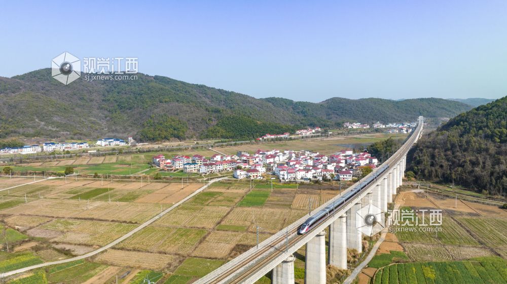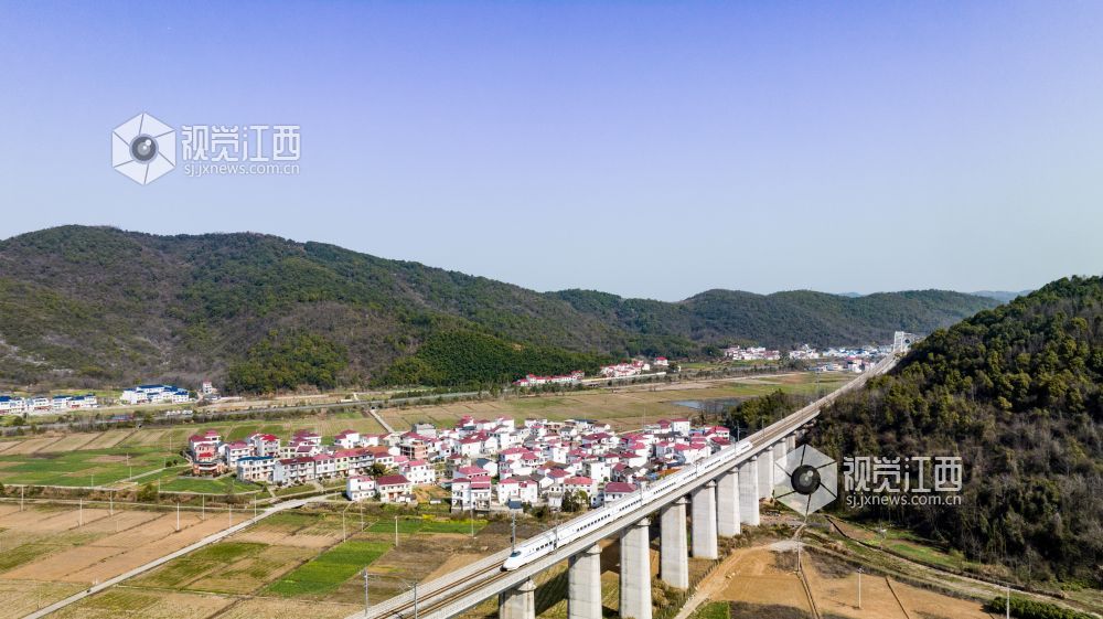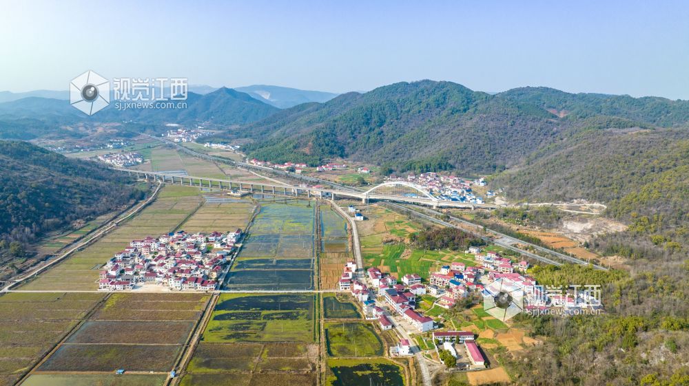 2023年3月5日,江西省瑞昌市南阳乡,穿境而过的武九客运专线及杭瑞高速与当地的田野村庄、青山绿水相互映衬,构成一幅宜居宜业和美乡村画卷。