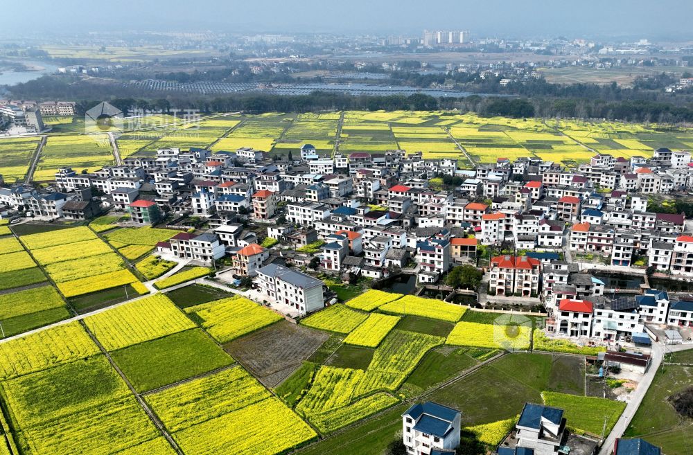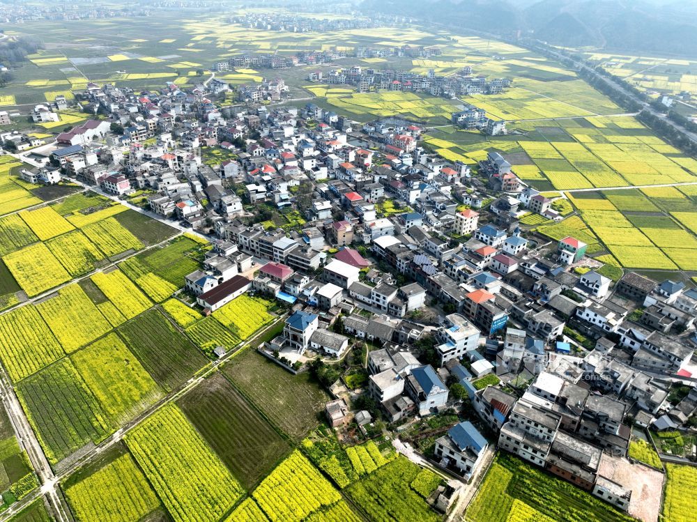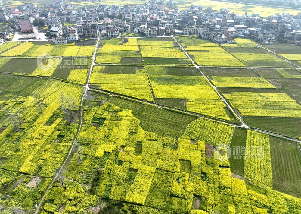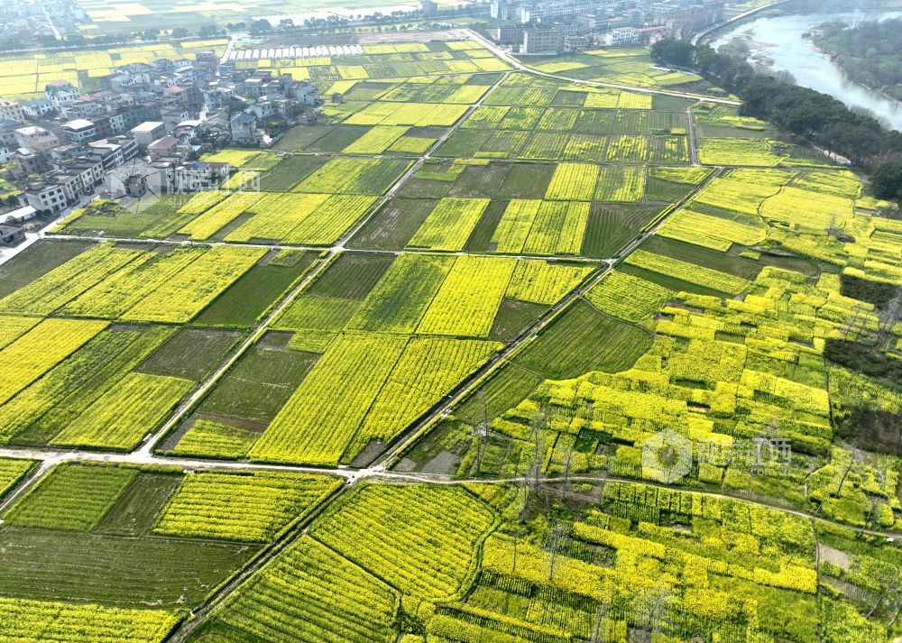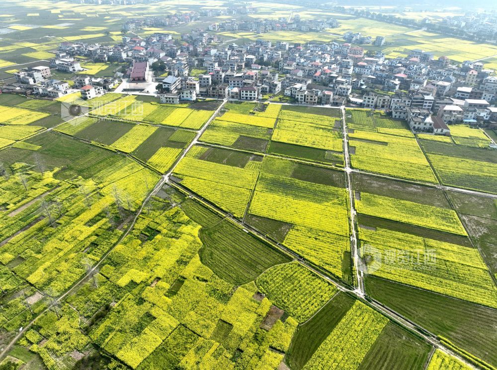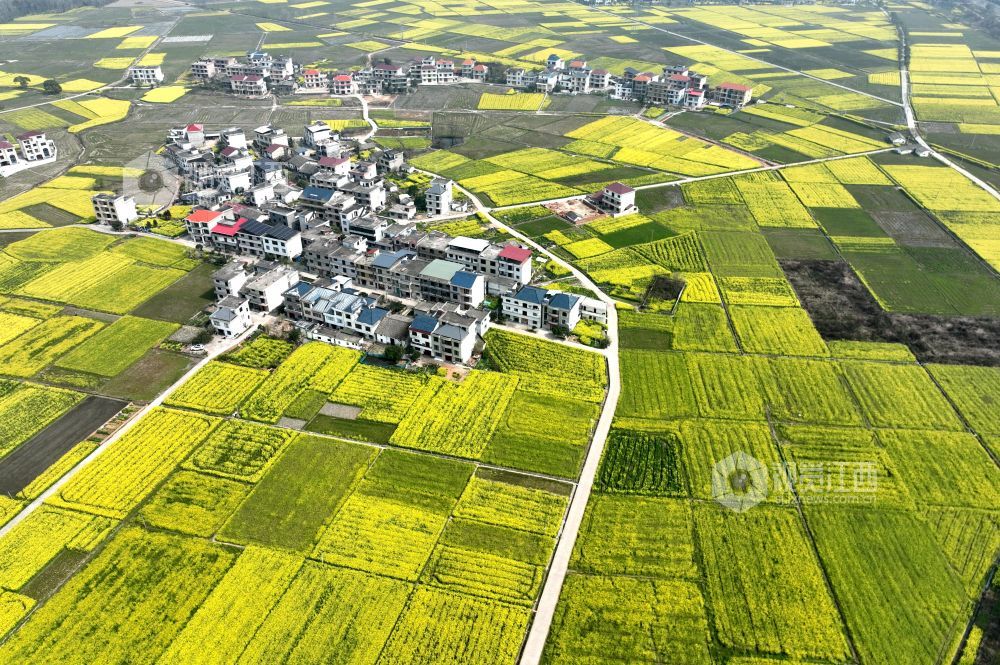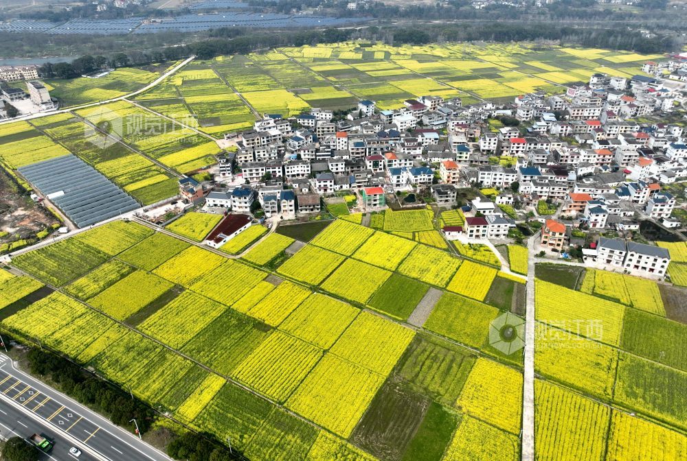 2023年3月6日,在江西省遂川县枚江镇油菜花烂漫盛开,从空中俯瞰,一片金黄,金色铺满大地,金灿灿的油菜花与别致的乡村民居、道路交相辉映,绘就一幅美丽的乡村田园风景画,美不胜收。