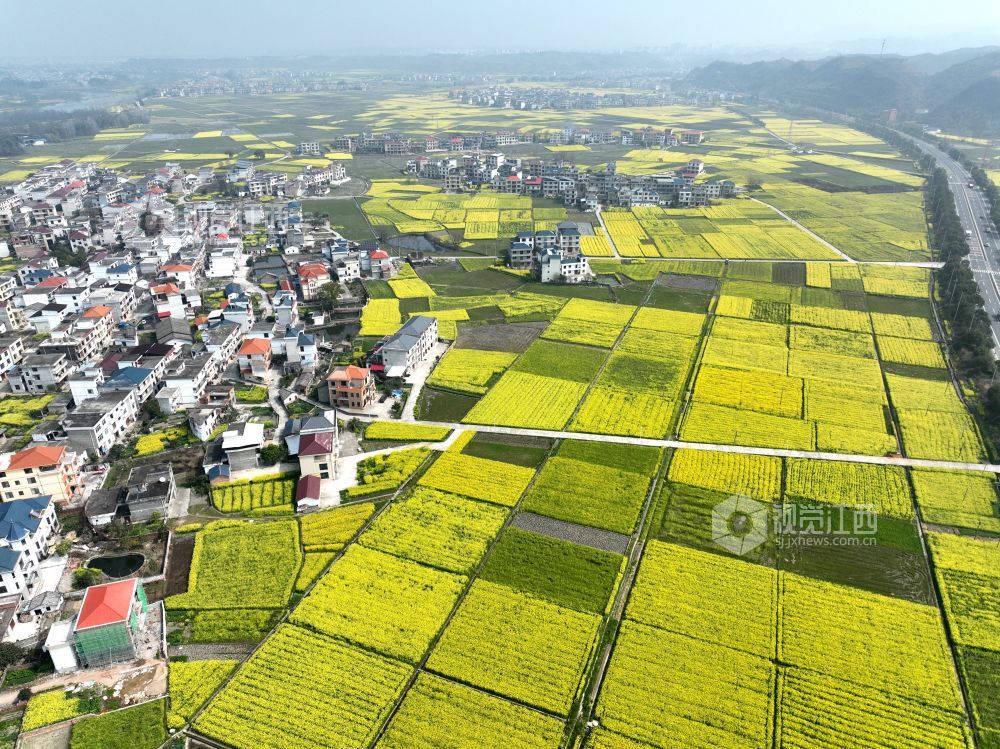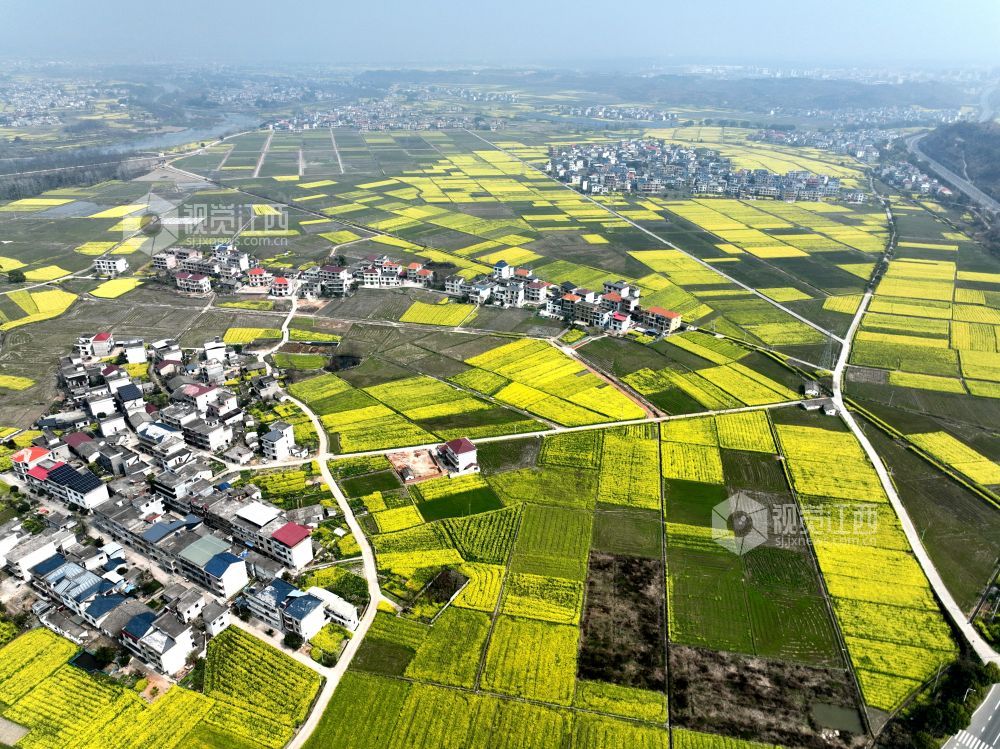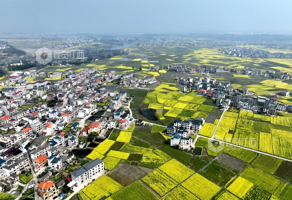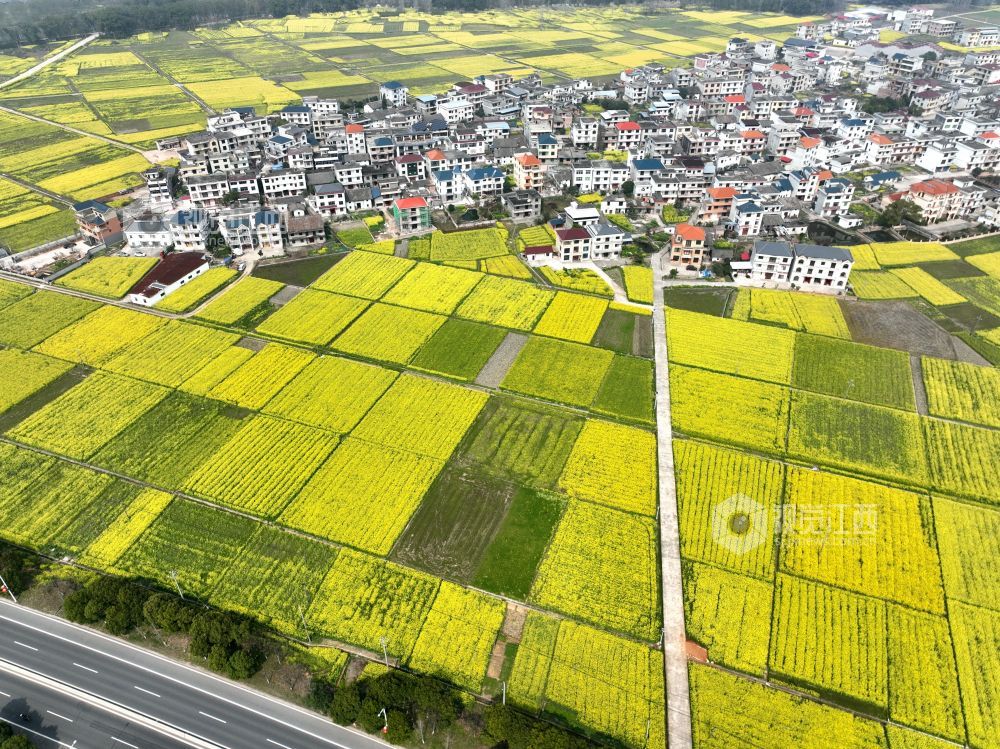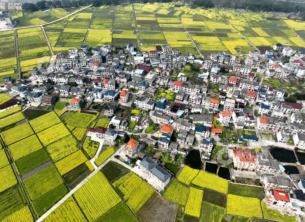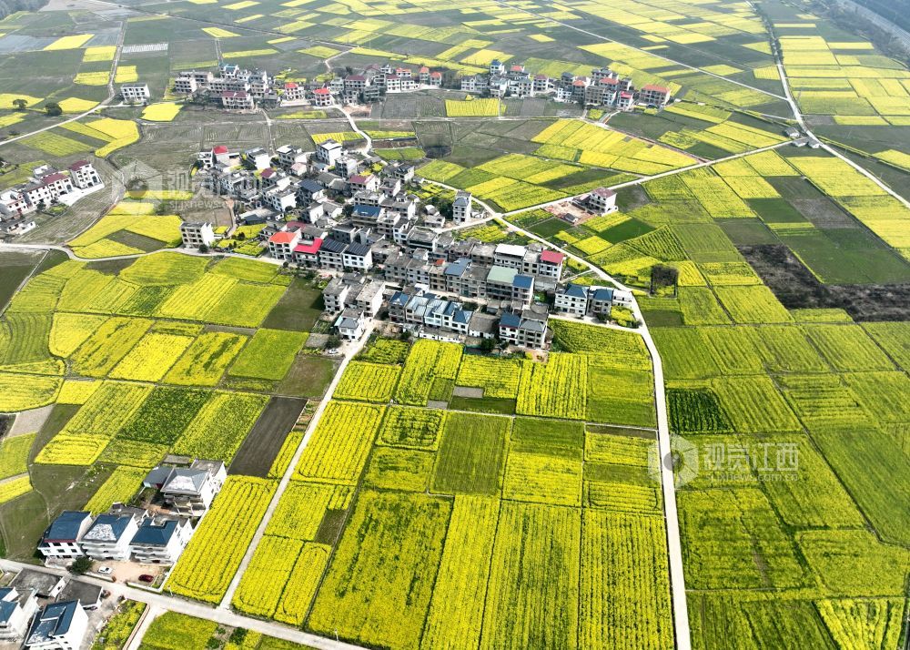 2023年3月6日,在江西省遂川县枚江镇油菜花烂漫盛开,从空中俯瞰,一片金黄,金色铺满大地,金灿灿的油菜花与别致的乡村民居、道路交相辉映,绘就一幅美丽的乡村田园风景画,美不胜收。
