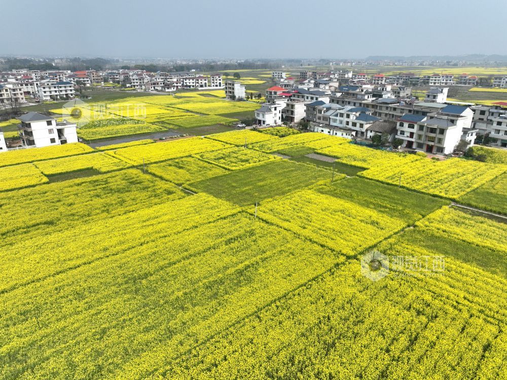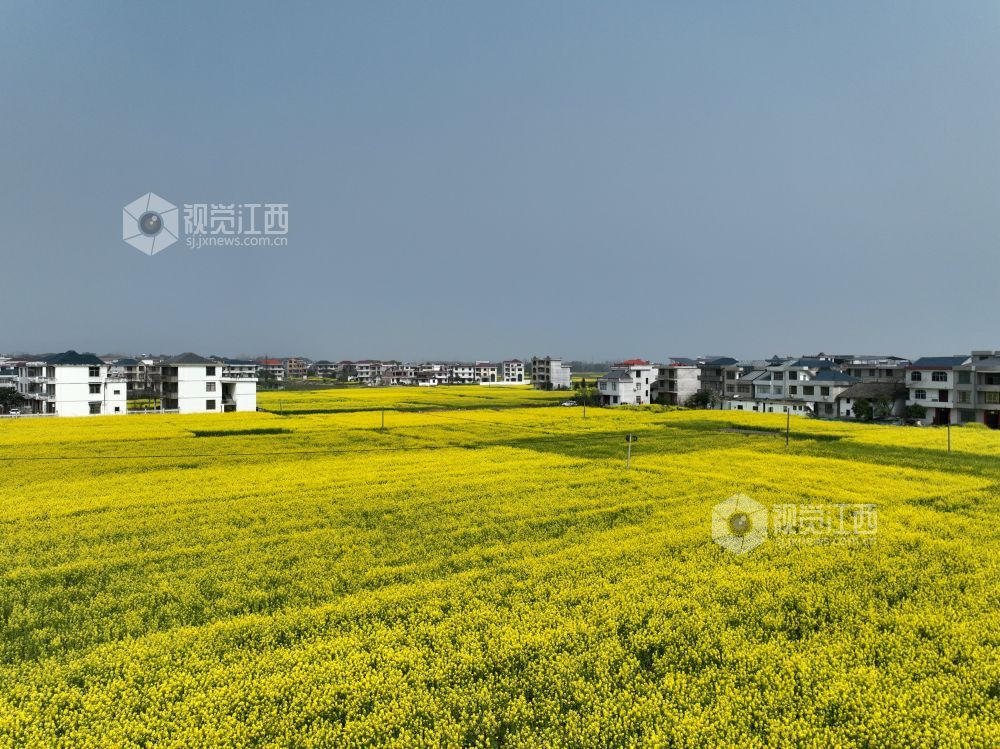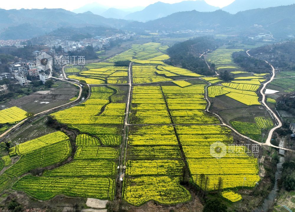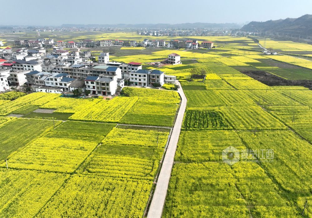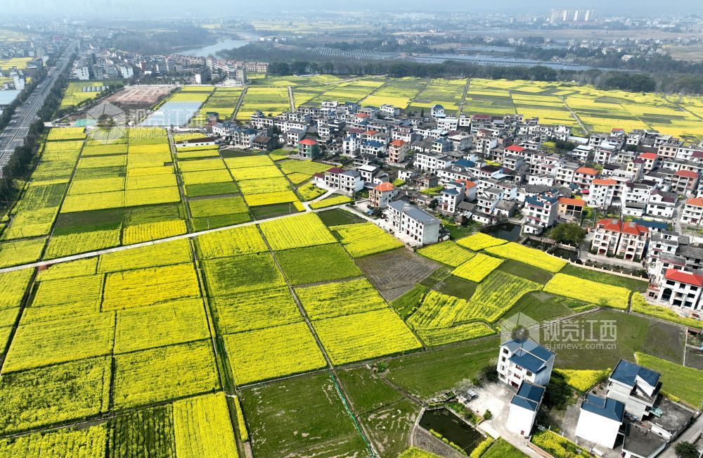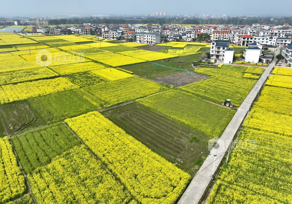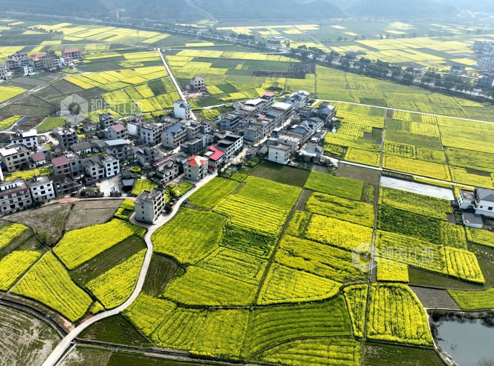 2023年3月6日,在江西省遂川县枚江镇油菜花烂漫盛开,从空中俯瞰,一片金黄,金色铺满大地,金灿灿的油菜花与别致的乡村民居、道路交相辉映,绘就一幅美丽的乡村田园风景画,美不胜收。