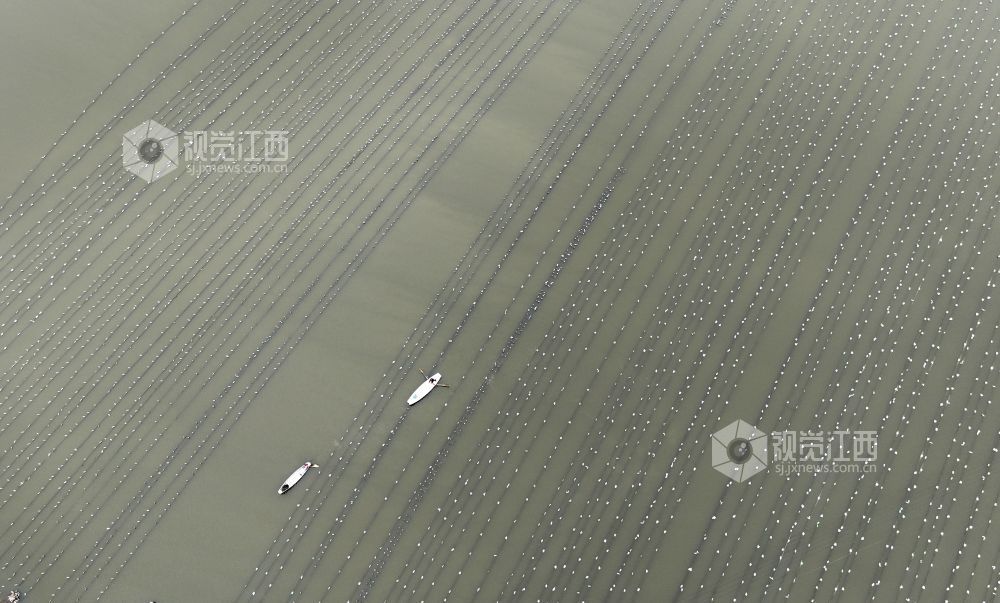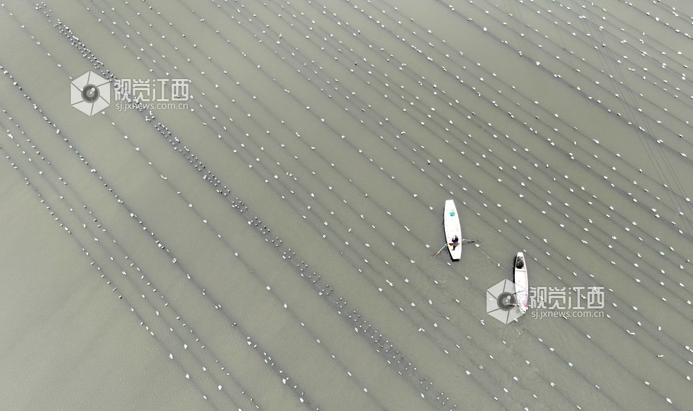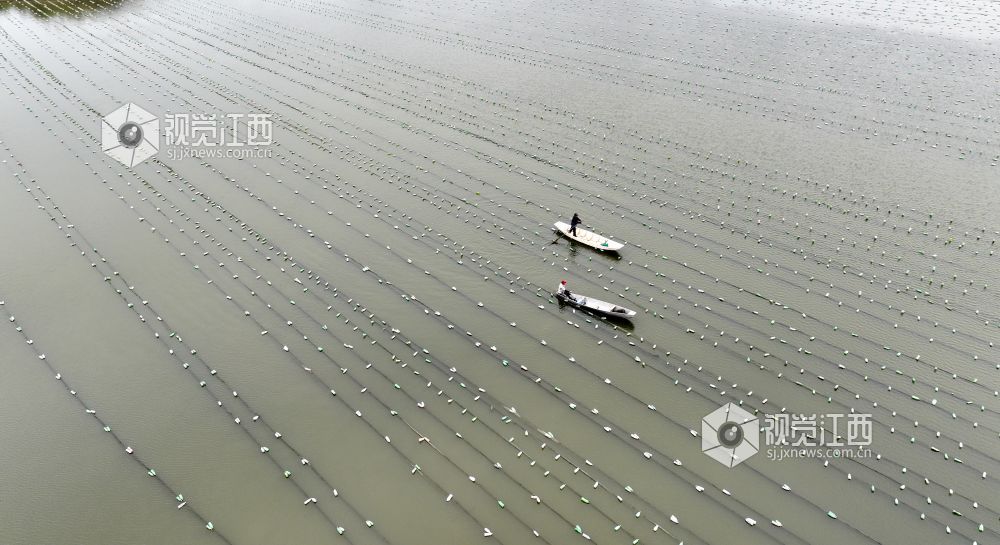 日前,在江西省九江市湖口县舜德乡石岭村,水产养殖户划着小舟在水面上进行劳作,一派水上“春耕”的忙碌景象。