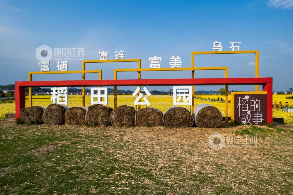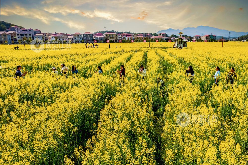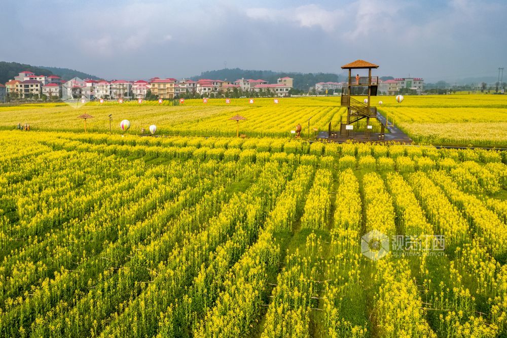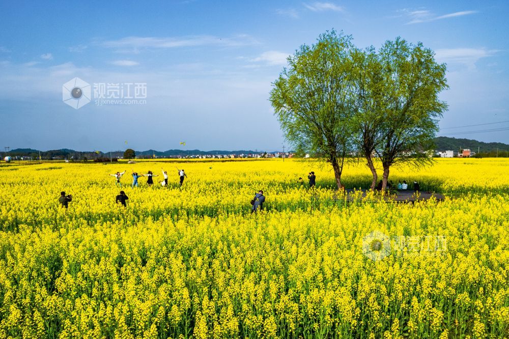 2023年3月10日,航拍江西省萍乡市银河稻田公园内油菜花绽放,美景如画,吸引众多游客前来打卡拍照,乐享春光。