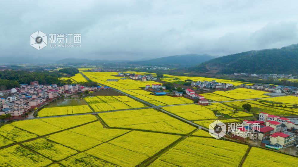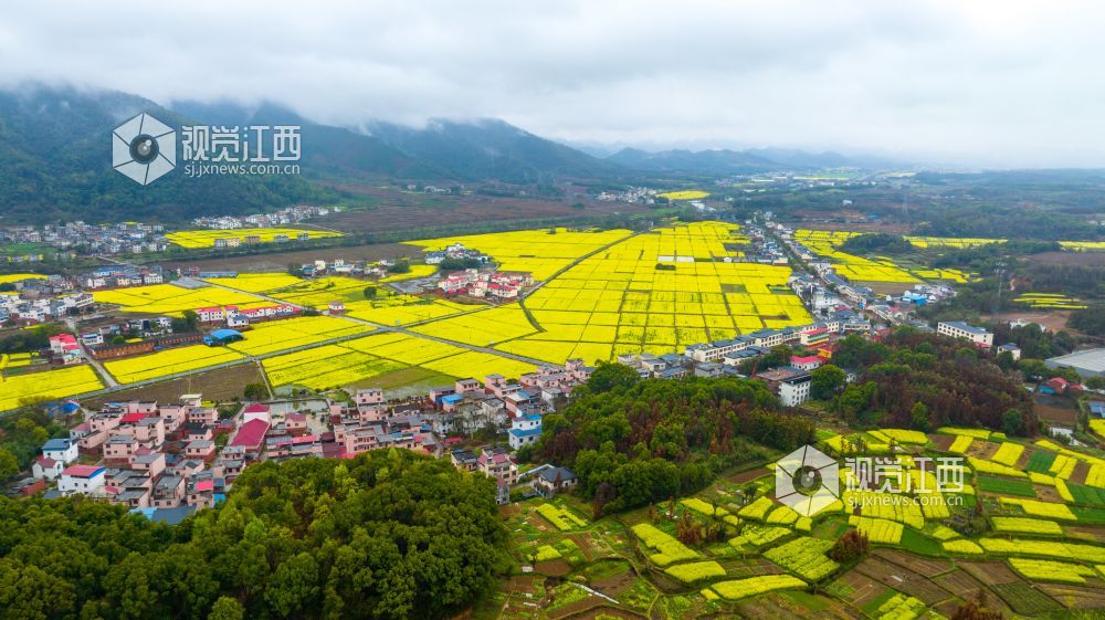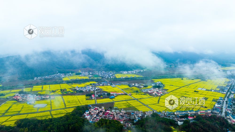 2023年3月17日,俯瞰雨后的江西省瑞昌市桂林街道常丰村,金黄色的花海、村庄、山峦和云雾相互映衬,构成一幅美丽的乡村春日画卷。