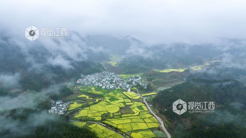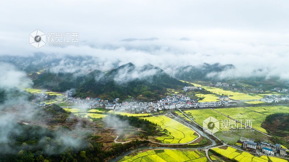 2023年3月21日,江西省瑞昌市花园乡上空云雾缭绕,风景秀丽,满地金黄的油菜花田与山村民居、群山等相互映衬,构成一幅美丽的乡村春日画卷。