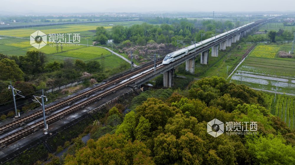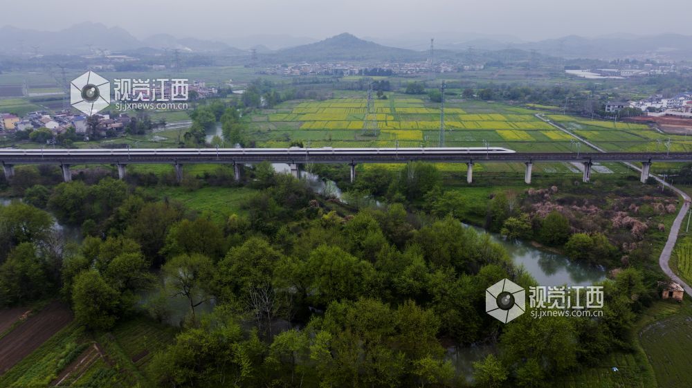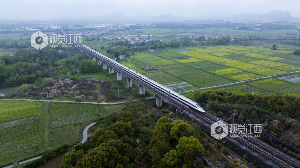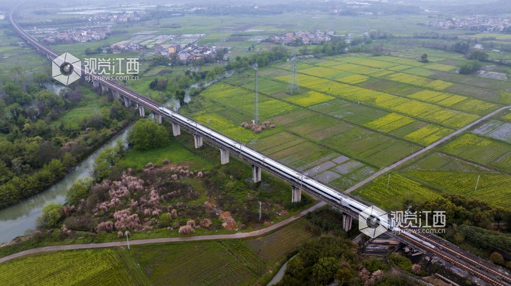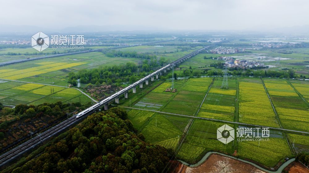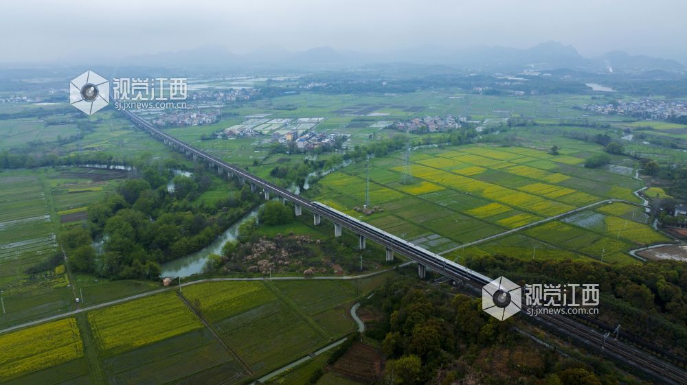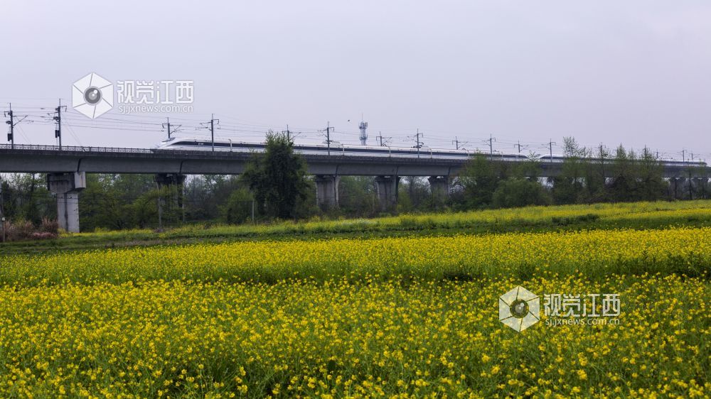 3月25日,天下着朦朦细雨,江西省新余仙女湖区观巢镇沪昆高速铁路两旁的千亩油菜花显得格外清新靓丽,一趟趟往来高速列车穿行其间,构成了一幅幅栩栩如生的的美丽画卷。