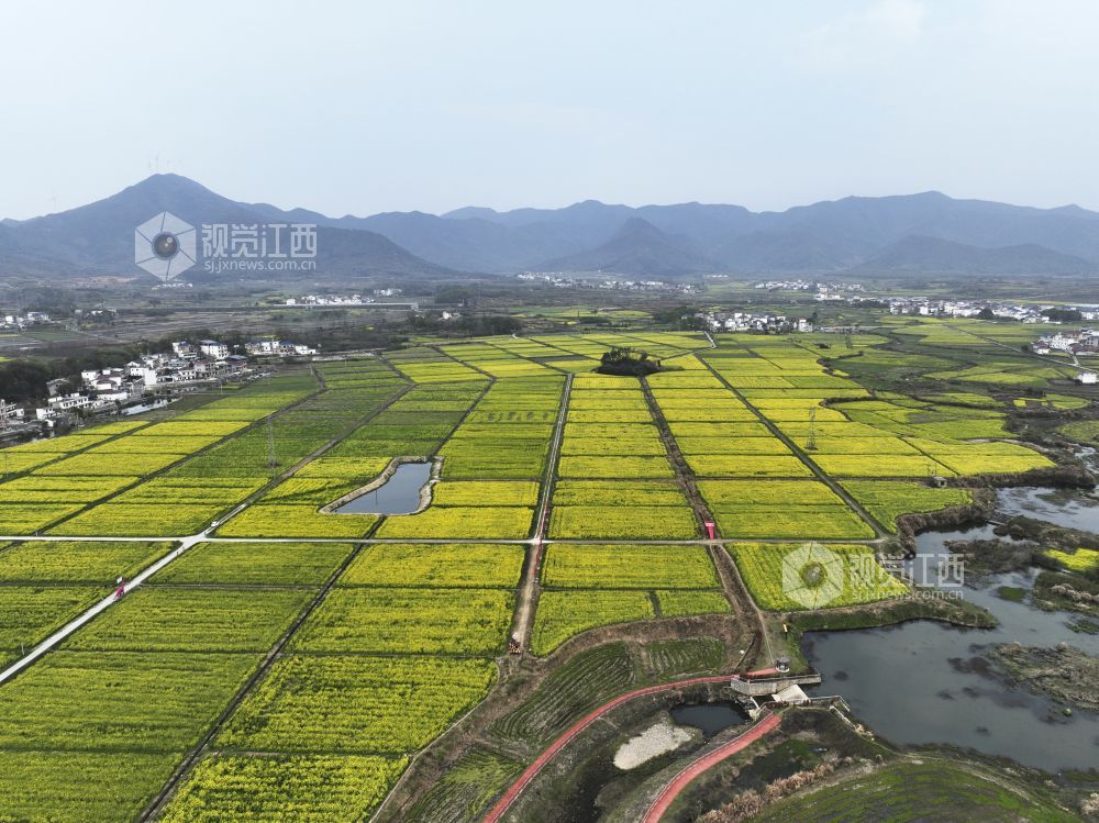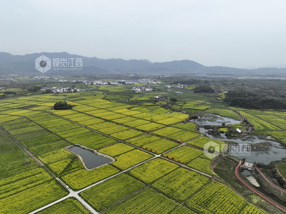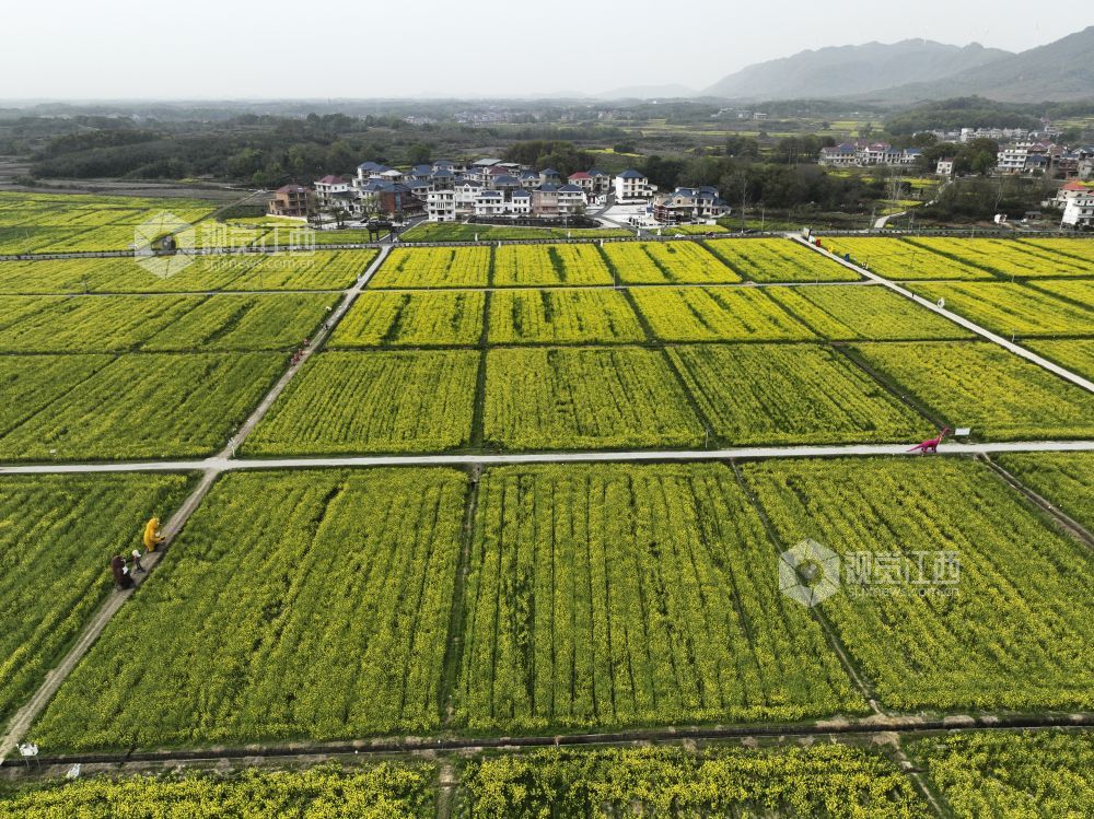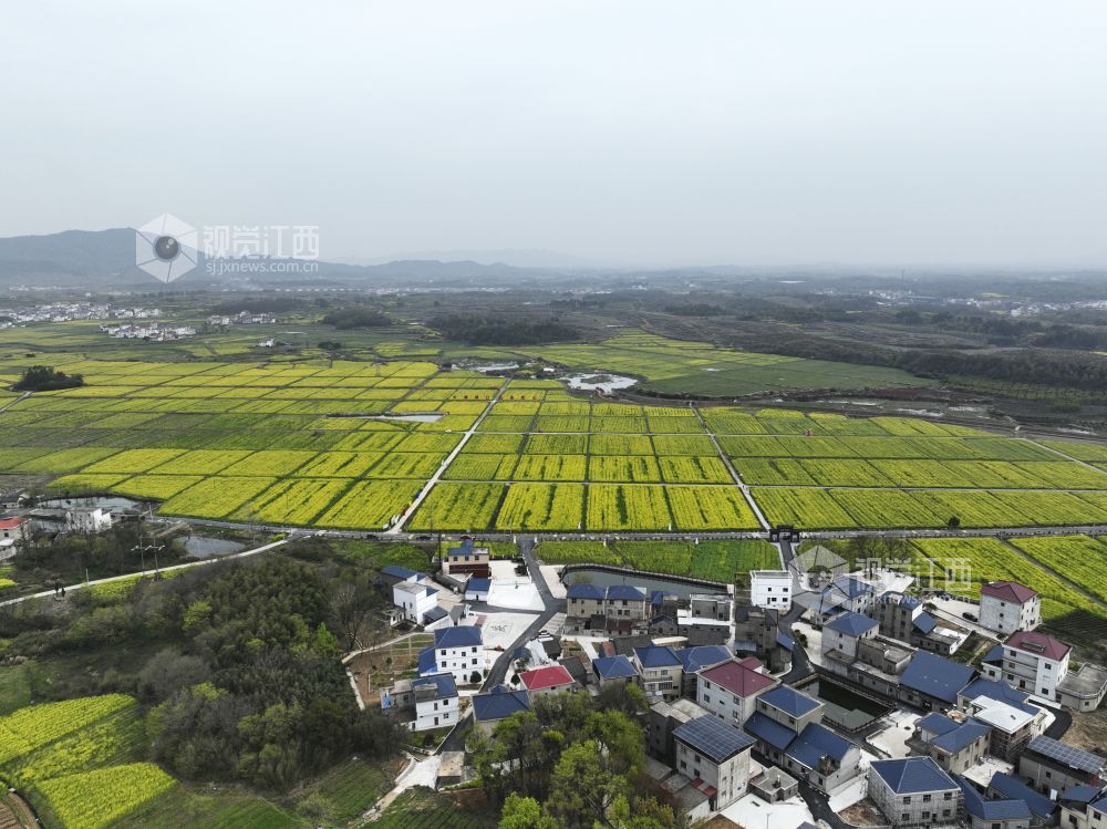 2023年3月27日,航拍下的江西省九江市湖口县武山镇武前村,屋舍俨然、畦畦油菜、青山含翠,好似一幅优美的田园风景画。