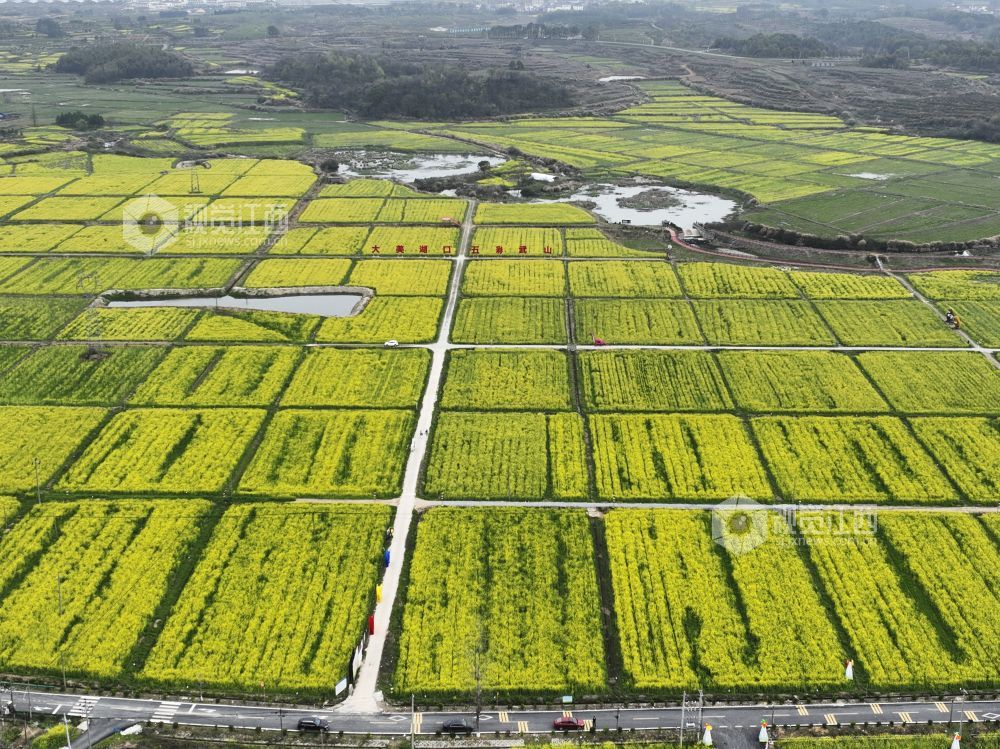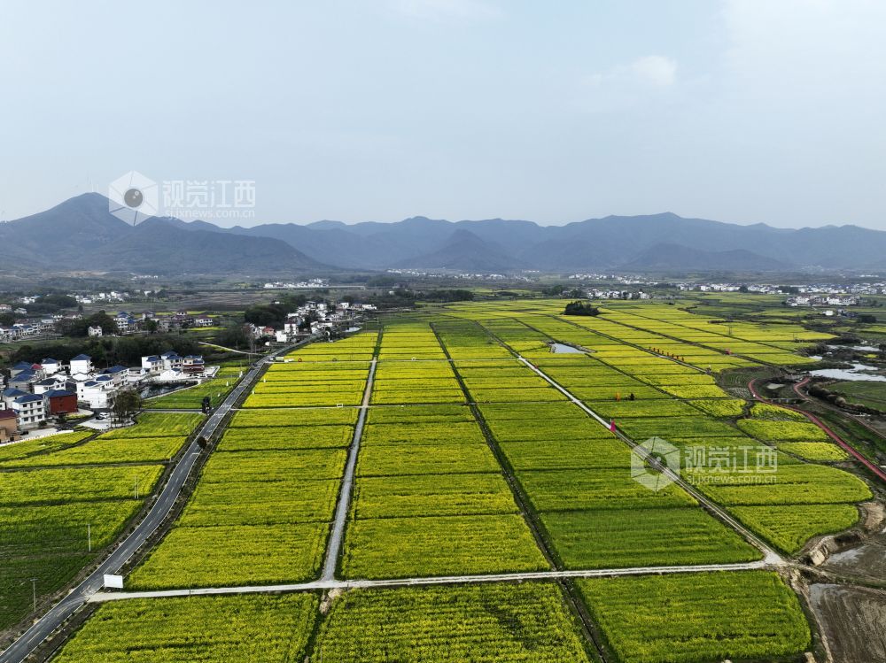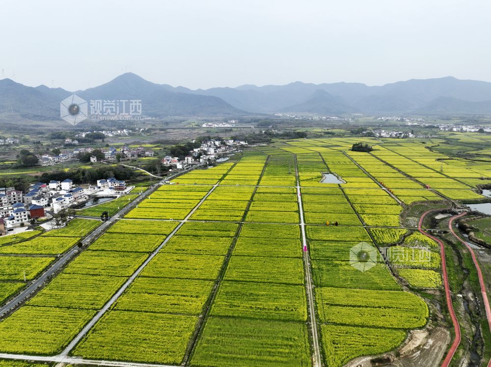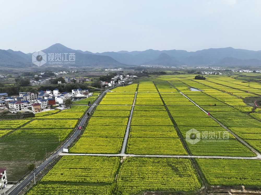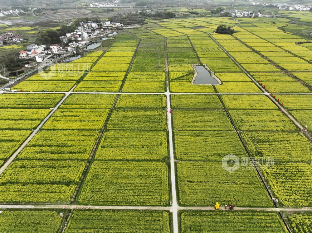 2023年3月27日,航拍下的江西省九江市湖口县武山镇武前村,屋舍俨然、畦畦油菜、青山含翠,好似一幅优美的田园风景画。