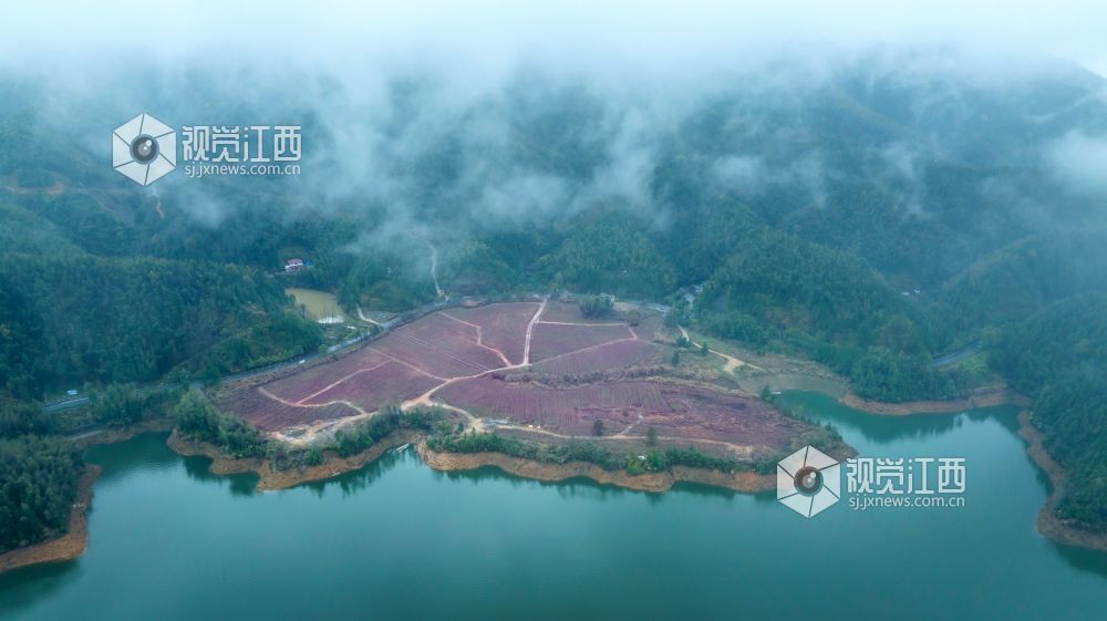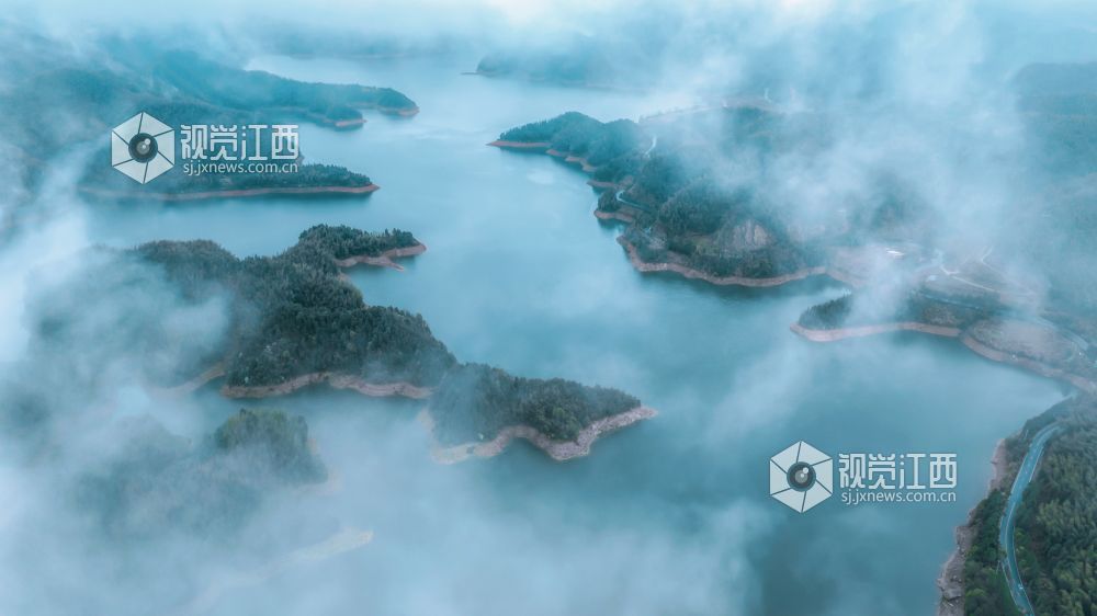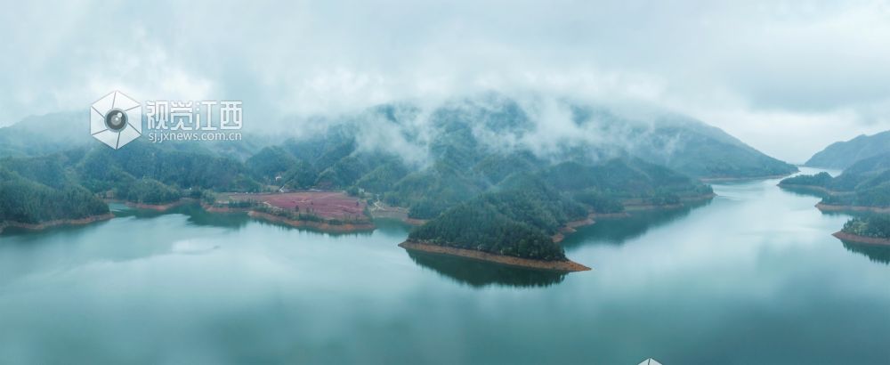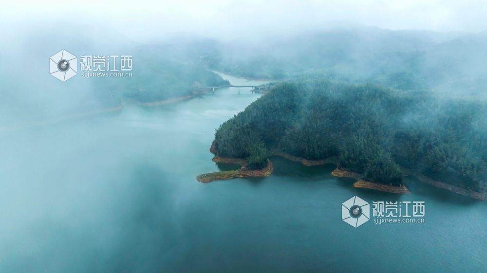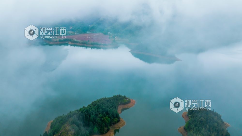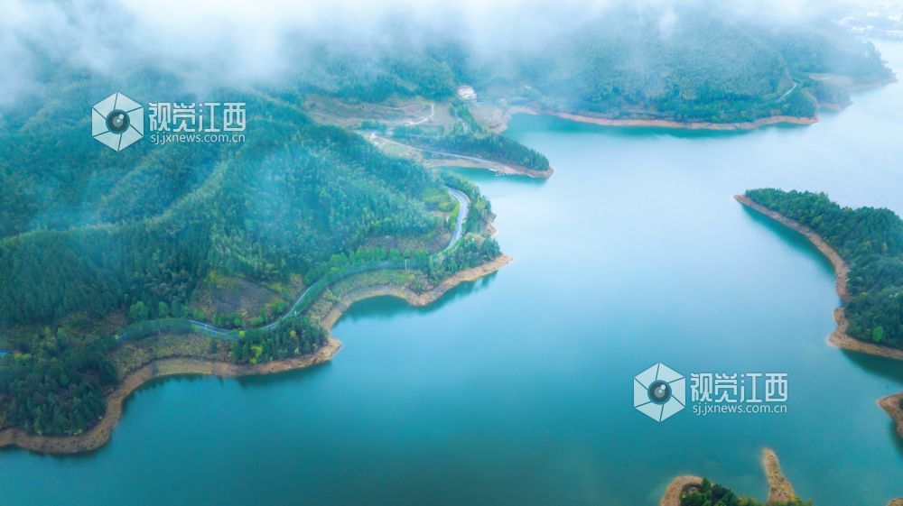 2023年3月29日,俯瞰江西省萍乡市芦溪县山口岩水库云雾缭绕,群山环抱,林木葱翠,景美如画。