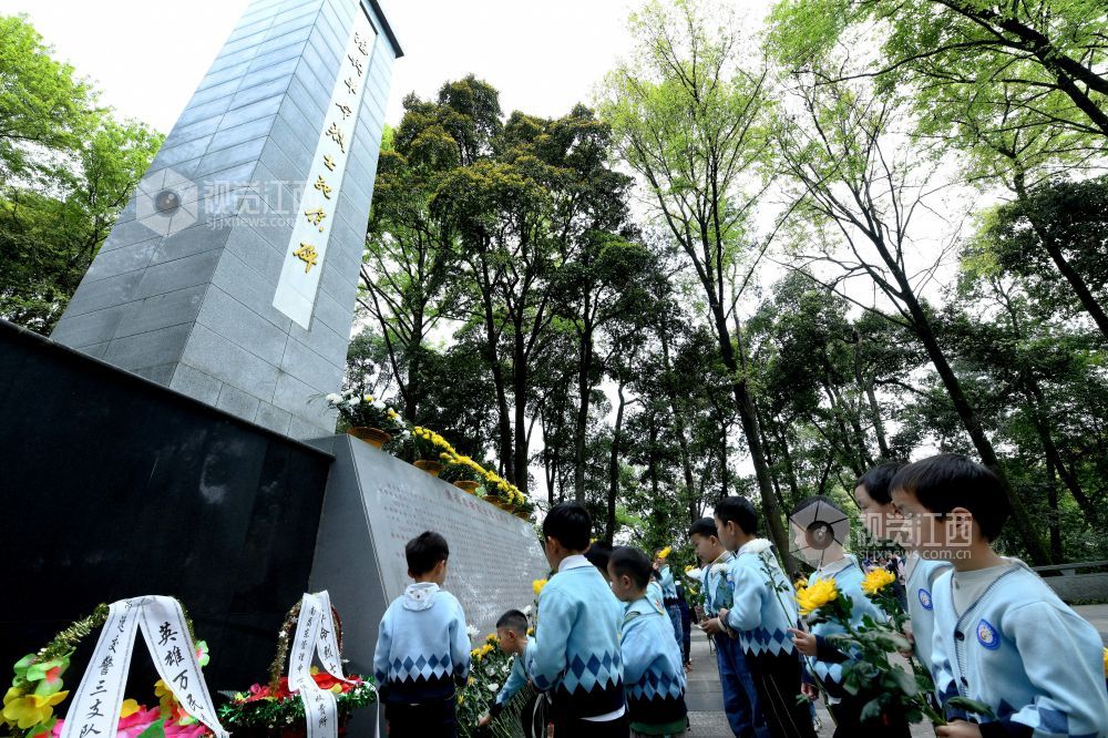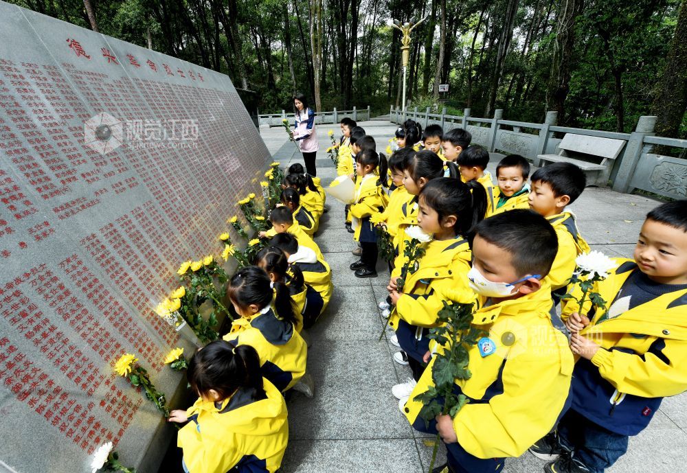 2023年3月31日,江西省德兴市银城幼儿园大班的小朋友来到该市革命烈士纪念塔前敬献鲜花。
