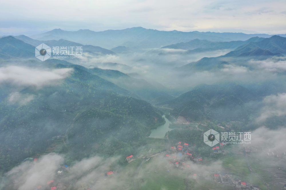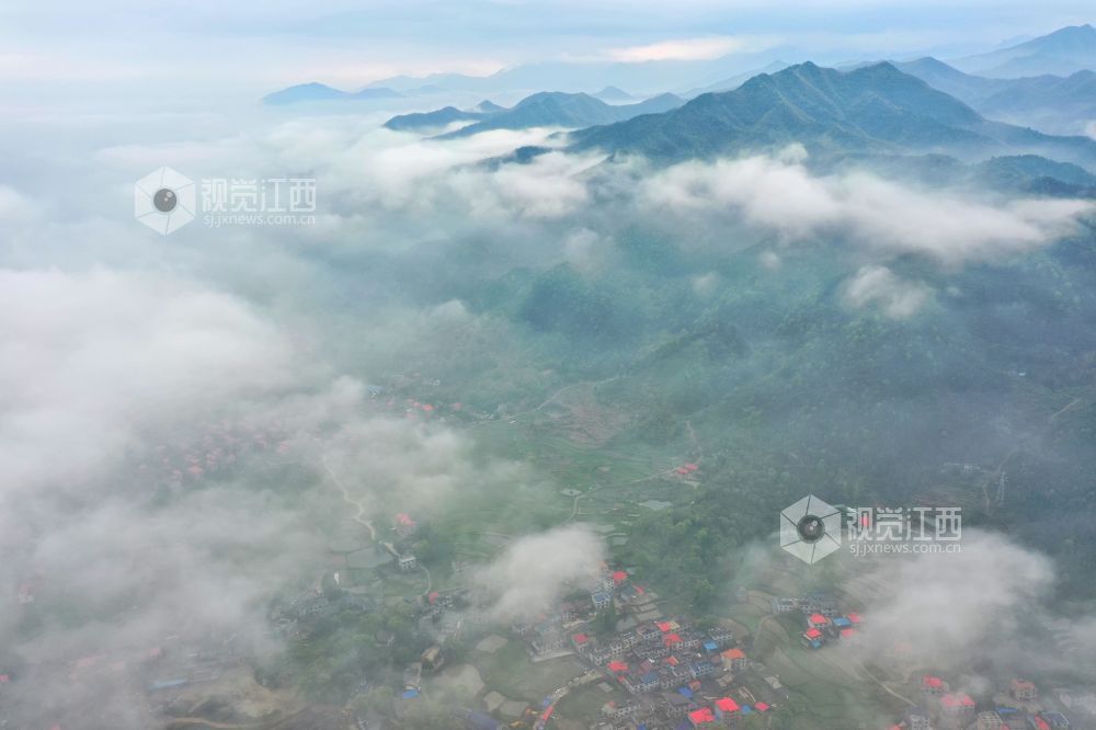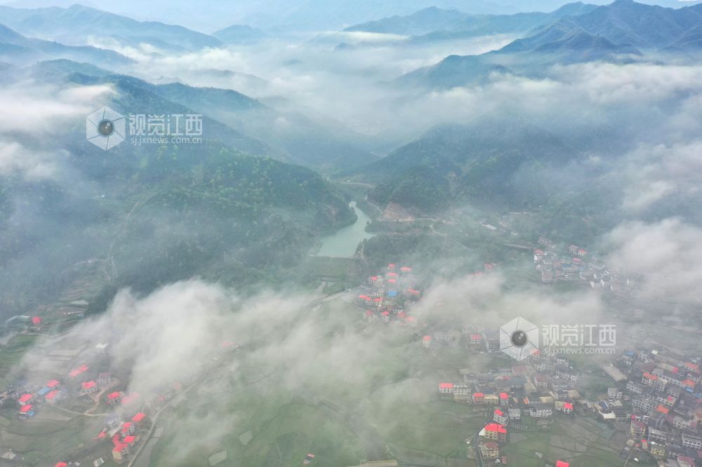 2023年4月2日,江西省萍乡市芦溪县芦溪镇高楼村,云雾缭绕,山青水绿,构成一幅壮美的山水画卷。