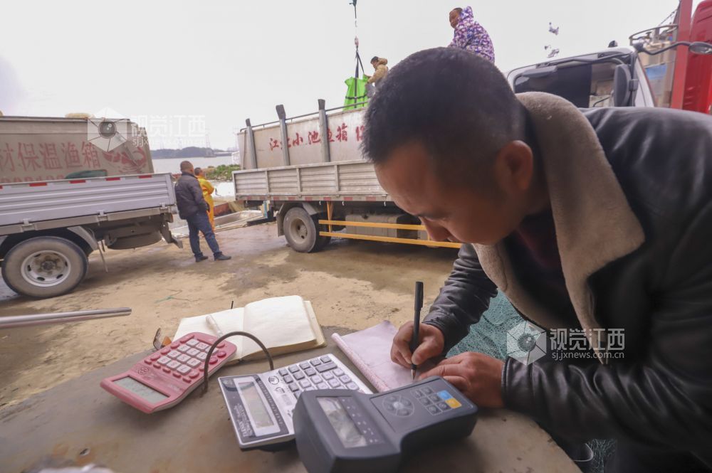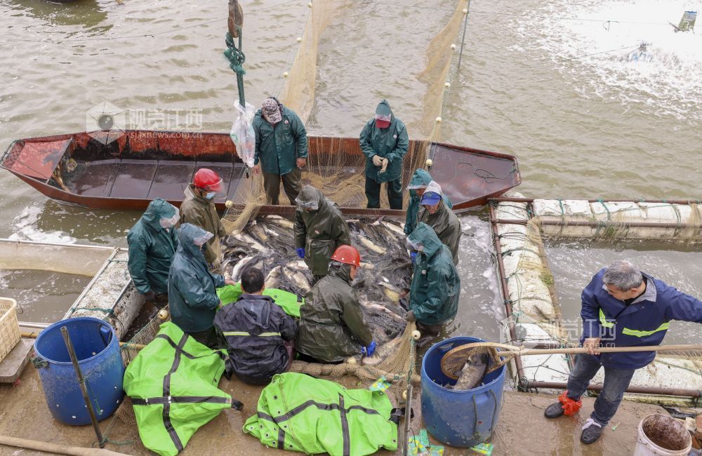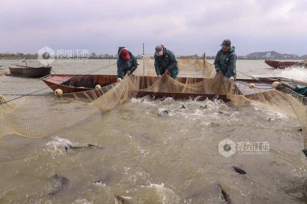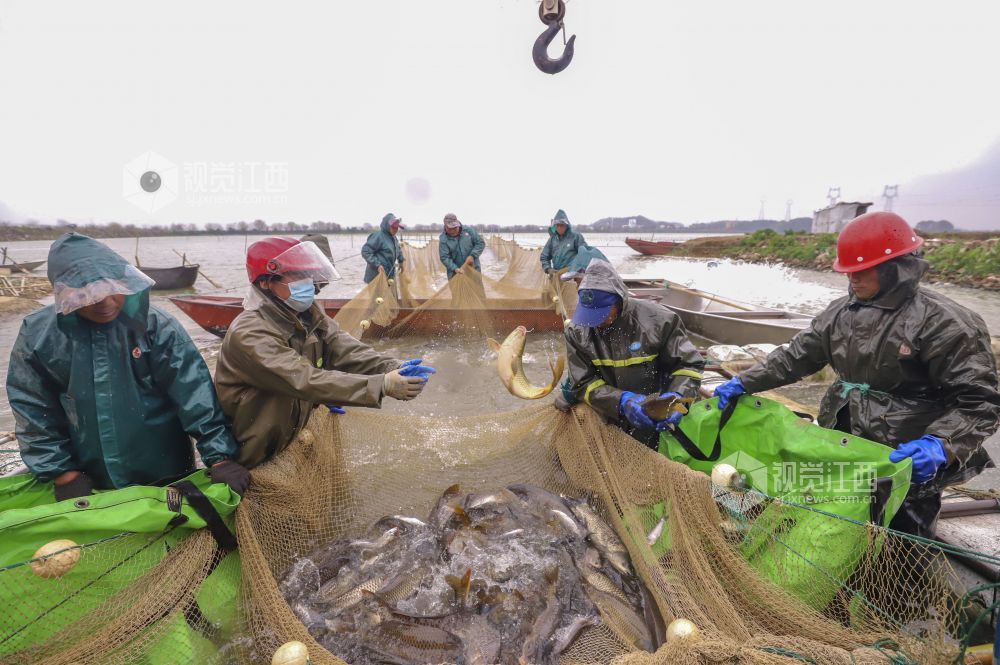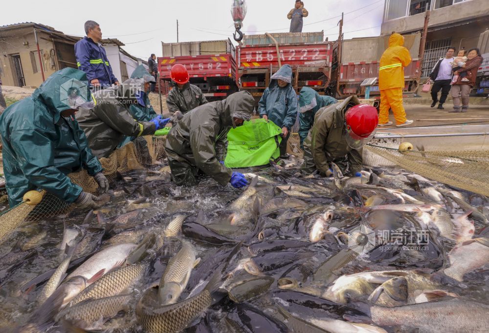 近日,江西省九江市湖口县双钟镇胜利水产场捕捞成鱼,来自四川、湖北、浙江等省的商贩排队收购,一派热闹的丰收场景。