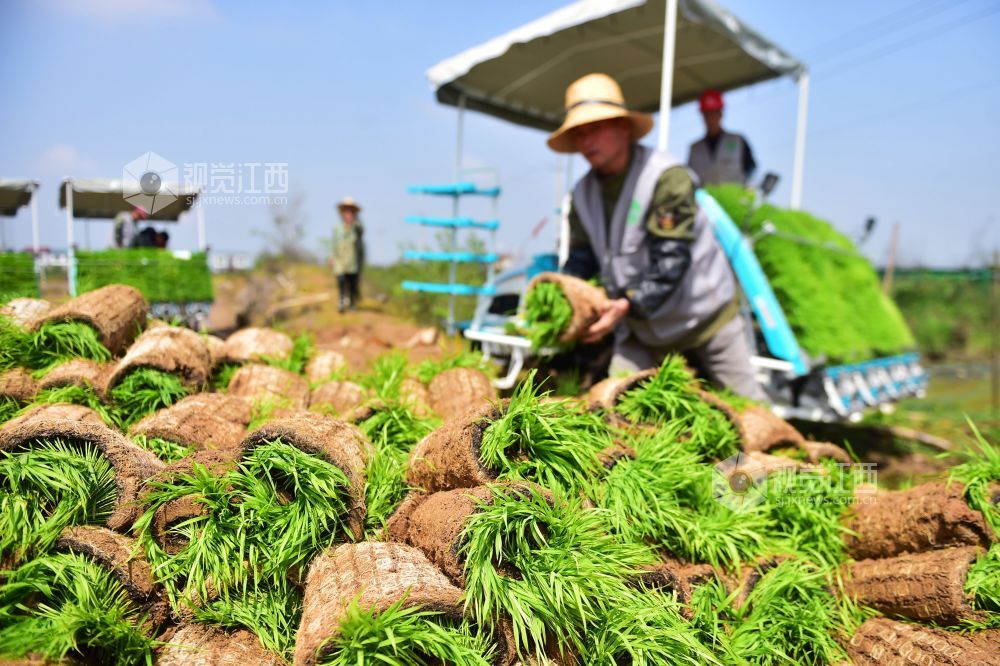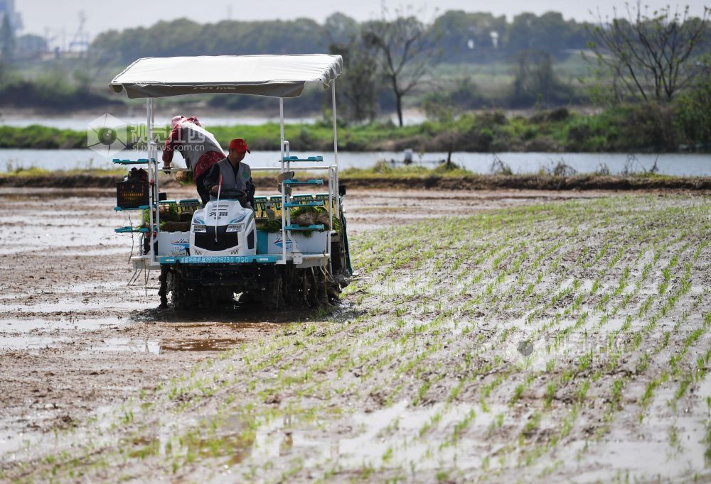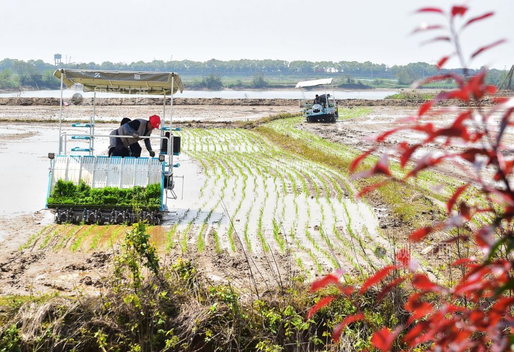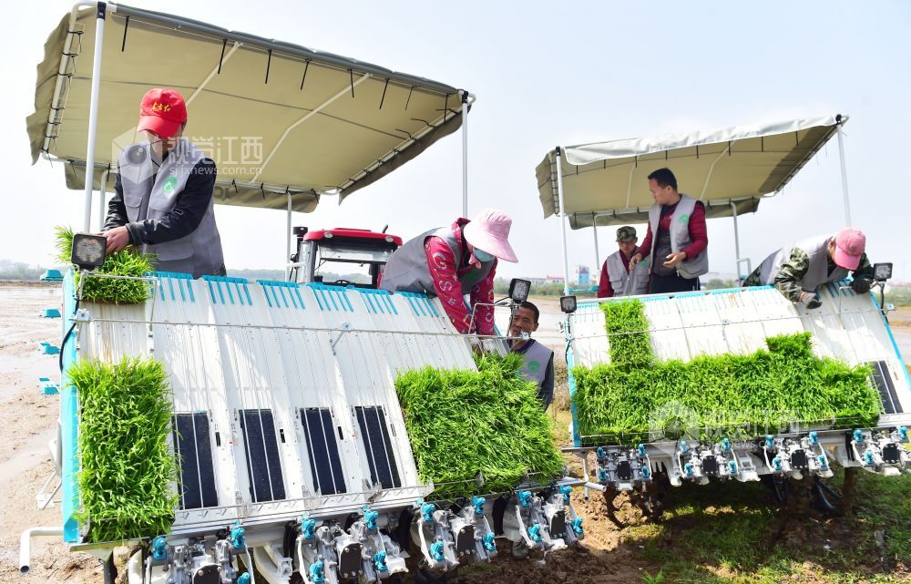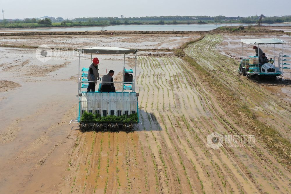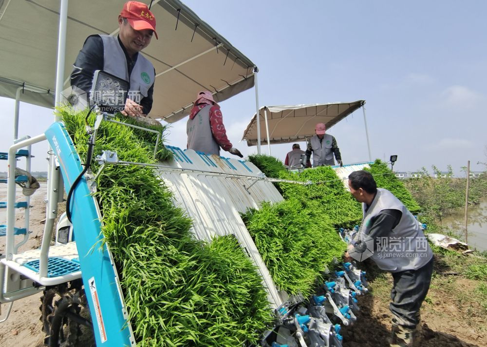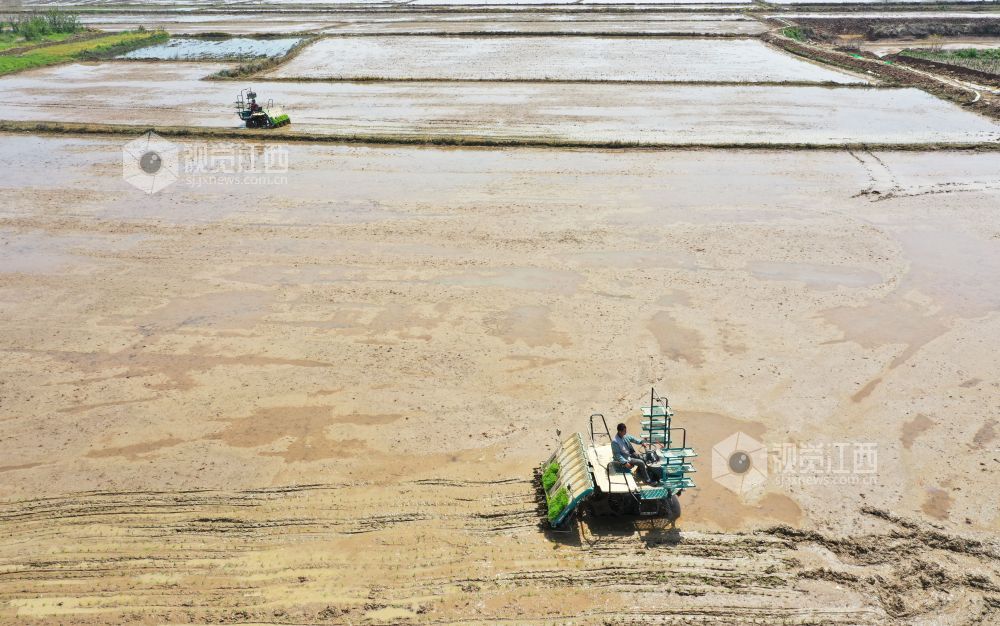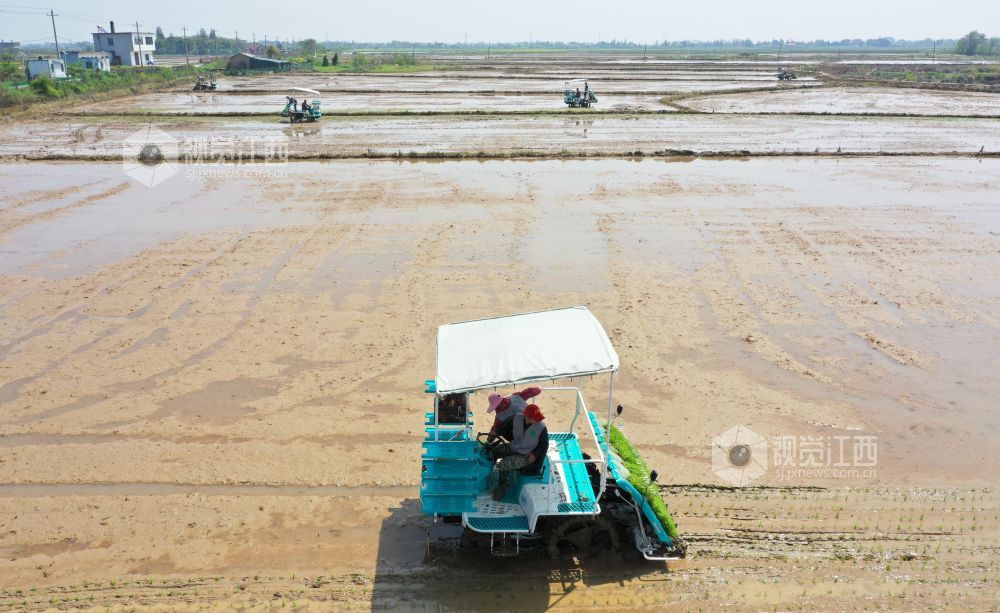 4月7日,在江西省南昌市新建区昌邑乡上河口村,一台台插秧机在田间来回穿梭,早稻春播正式拉开序曲。