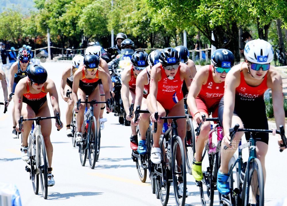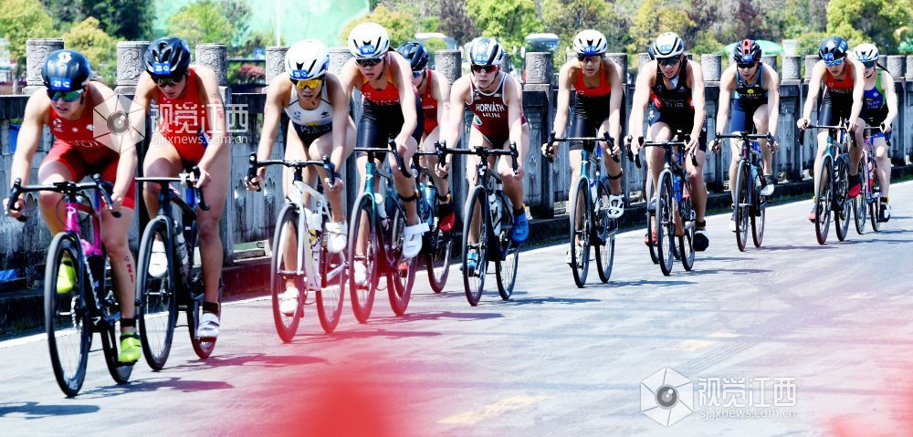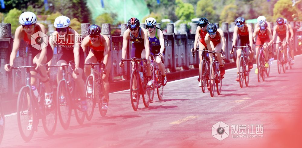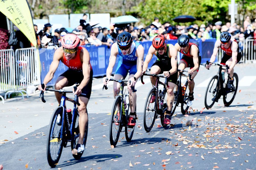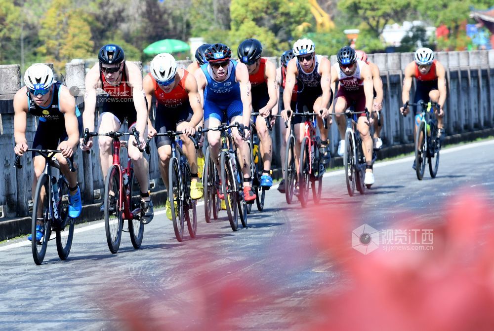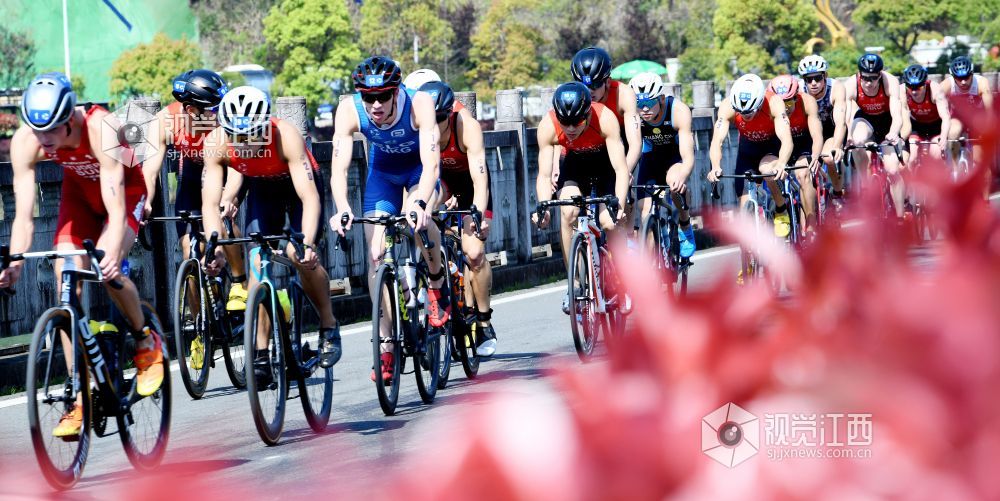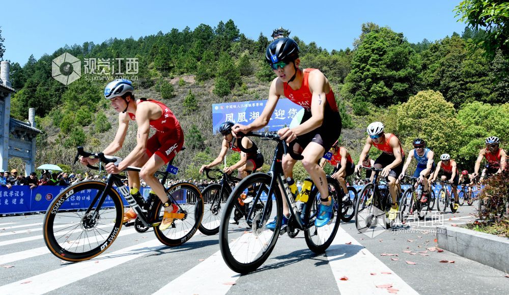 2023年4月8日,亚洲杯铁人三项男子优秀组正在江西省德兴市凤凰湖畔举行自行车赛事场景。