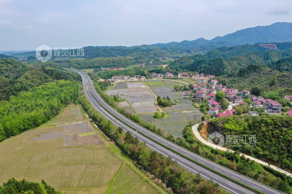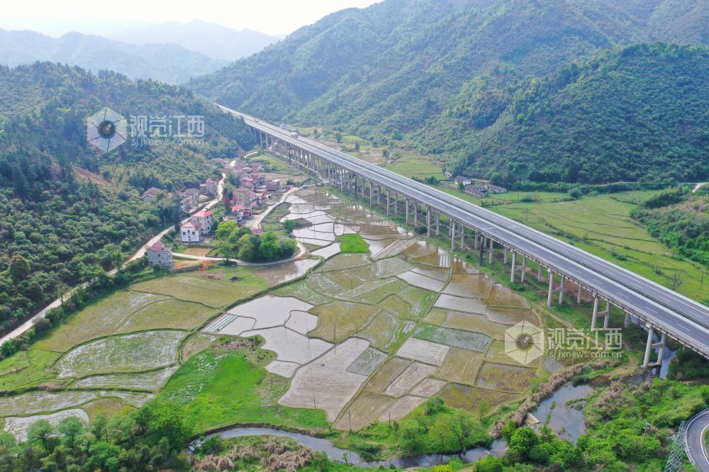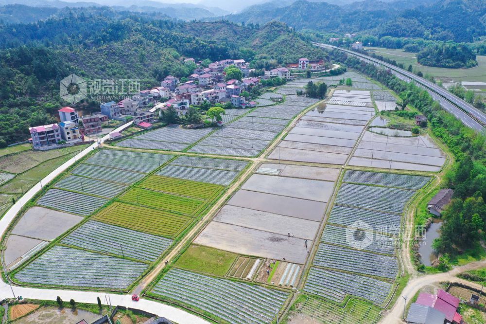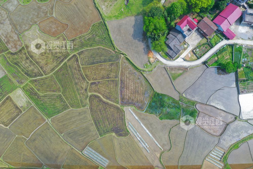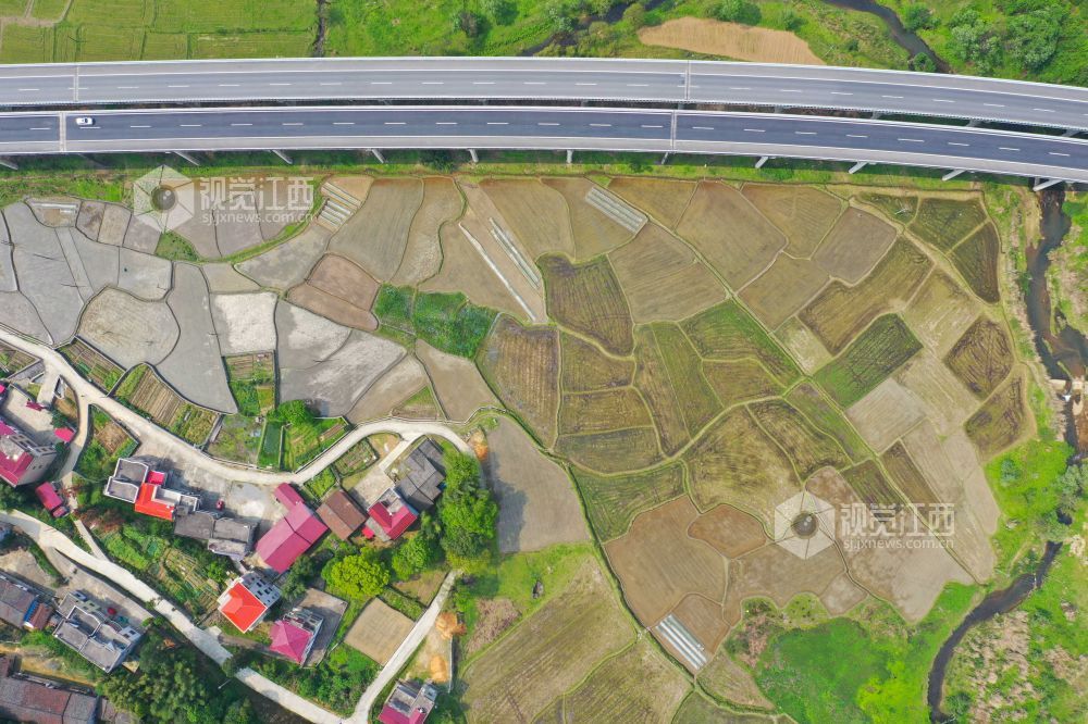 4月11日,航拍下的江西省泰和县中龙乡,水田如镜,阡陌纵横,与泉南高速相映成景,构成了一幅春日田园画卷。