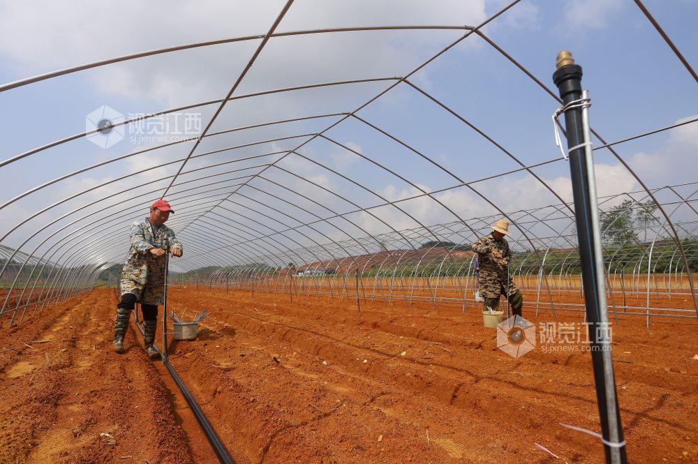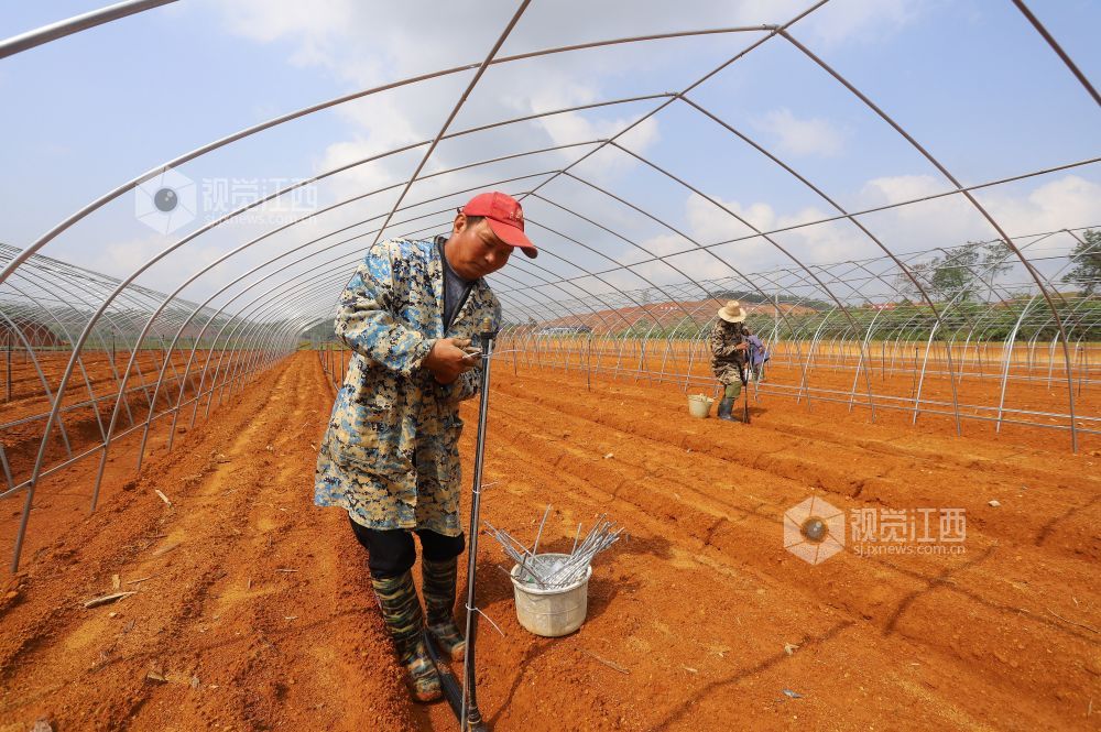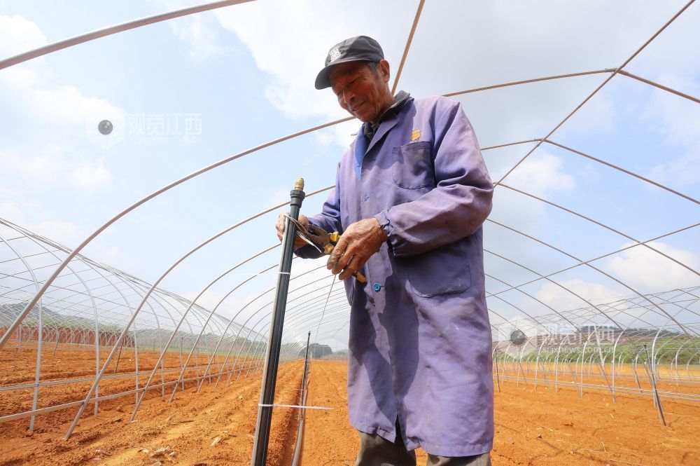 2023年4月13日,江西省吉安市安福县甘洛乡夏塘村村民在钢架大棚中安装喷淋设备。