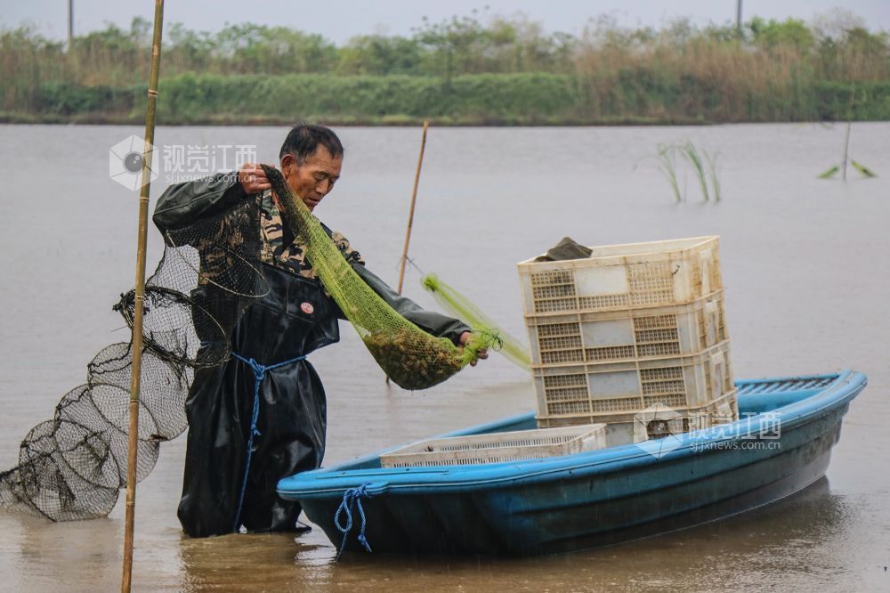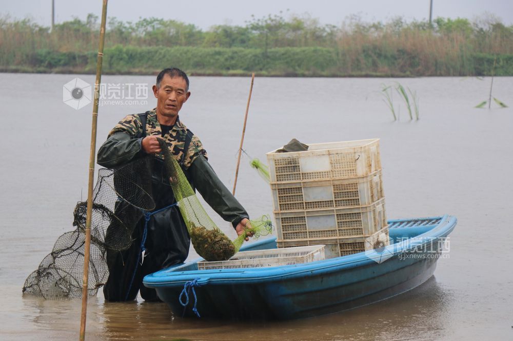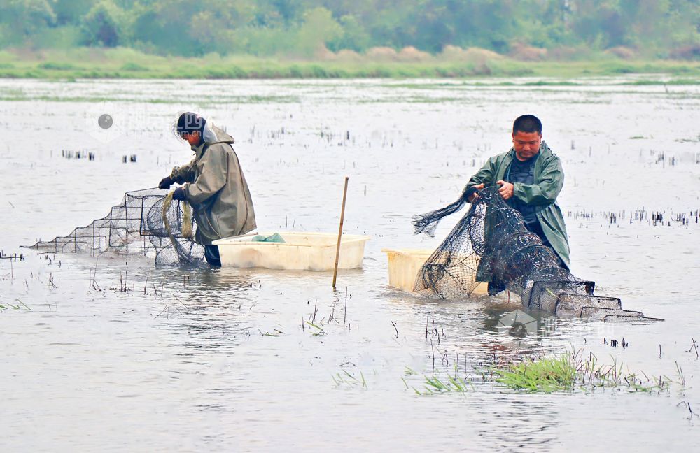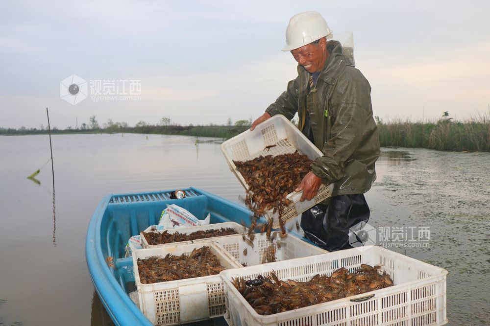 4月13日,在江西省余干县康山垦殖场大湖口分场鹏辉稻虾共作养殖基地,农户正在捕捞小龙虾。