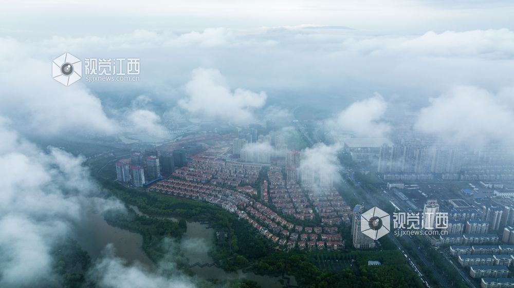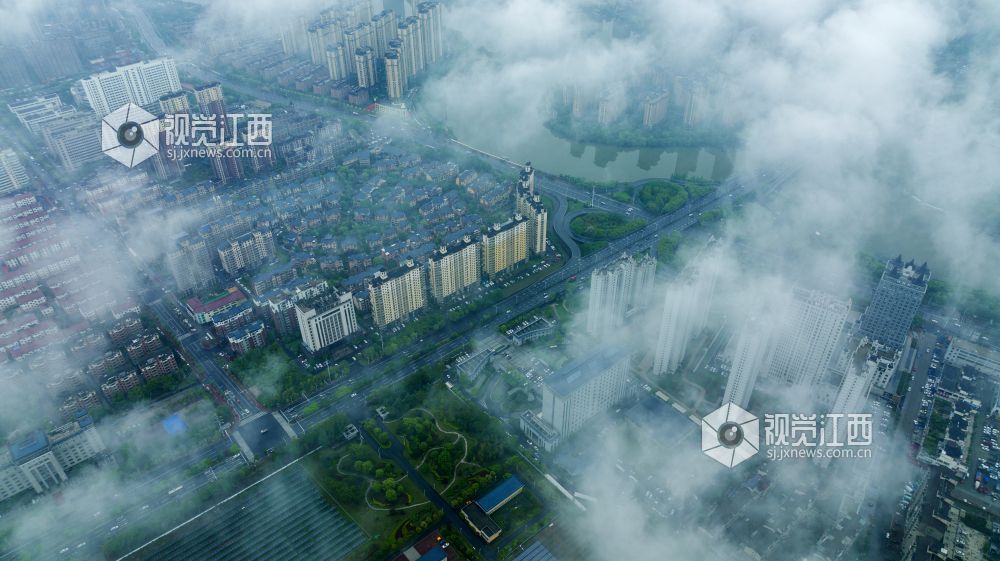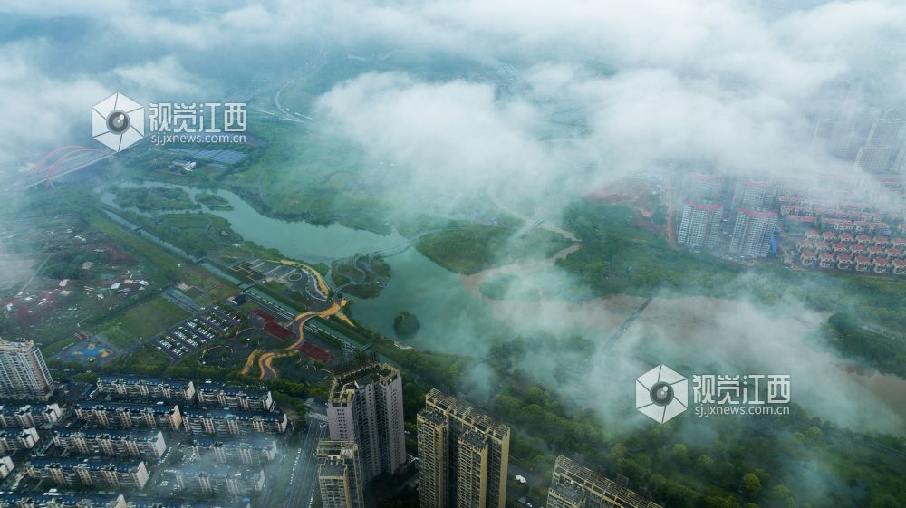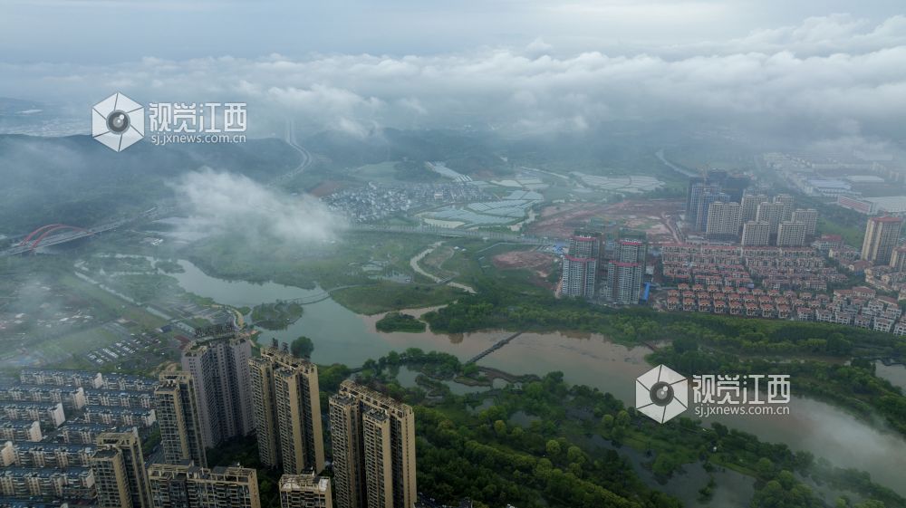 4月14日下午,航拍雨后的江西省新余市孔目江国家湿地公园、仰天岗国家森林公园、新余城区等地云雾缭绕,房屋、道路、森林、公园等在云雾中忽隐忽现,美如仙境。