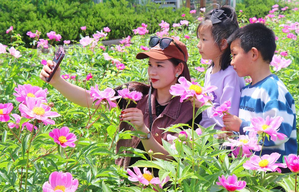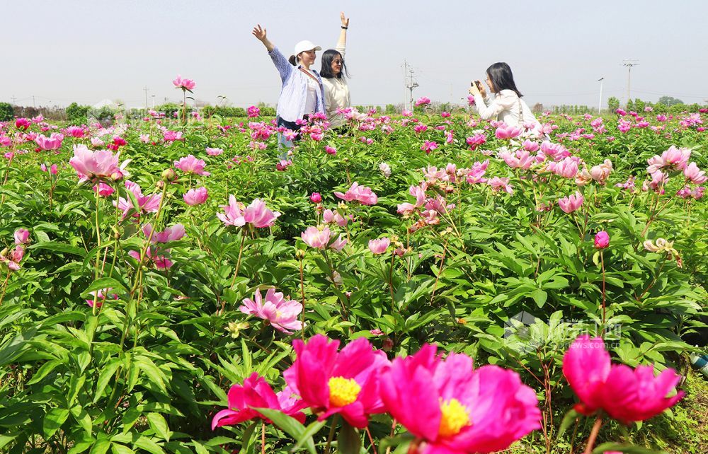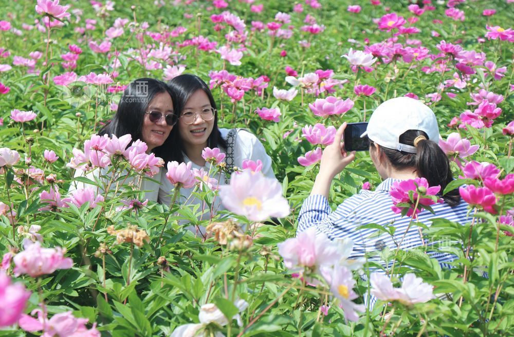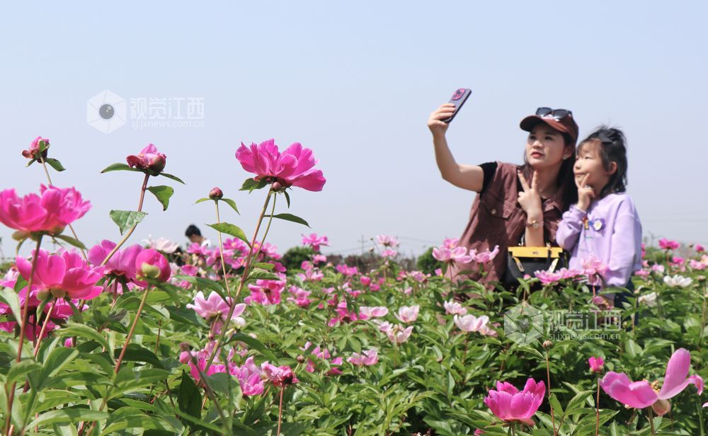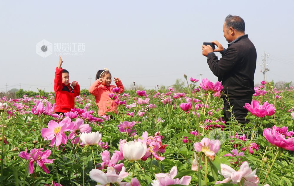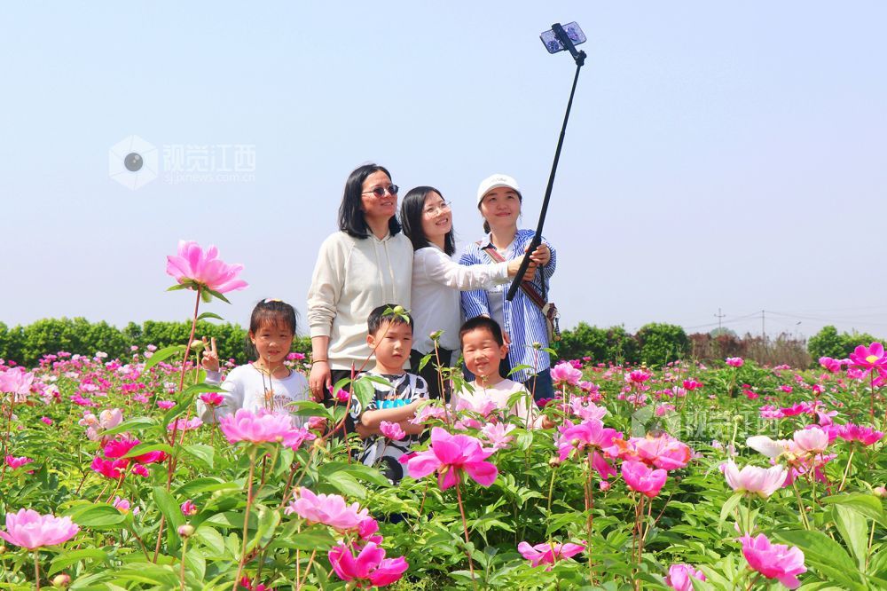 4月16日,江西省余干县康山垦殖场甘泉洲分场的芍药花种植基地,游客们赏花拍照打卡。