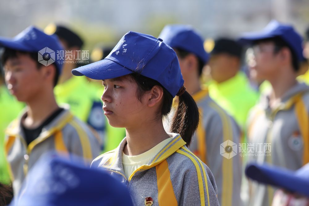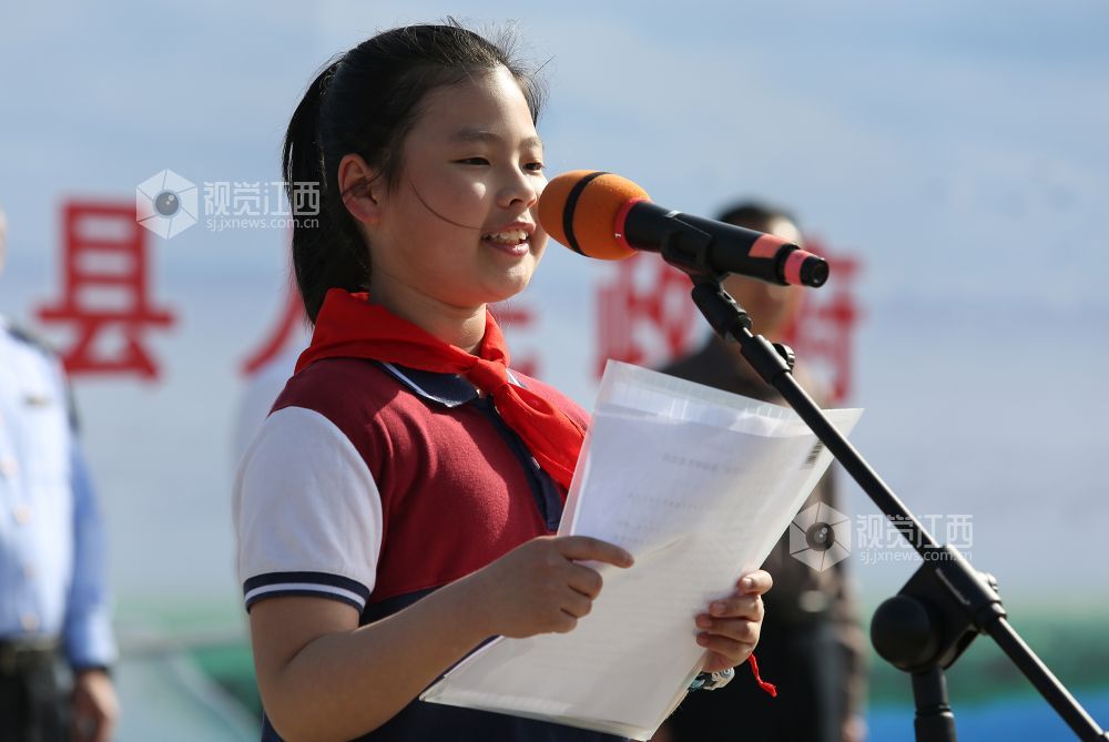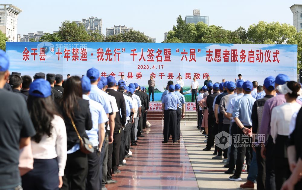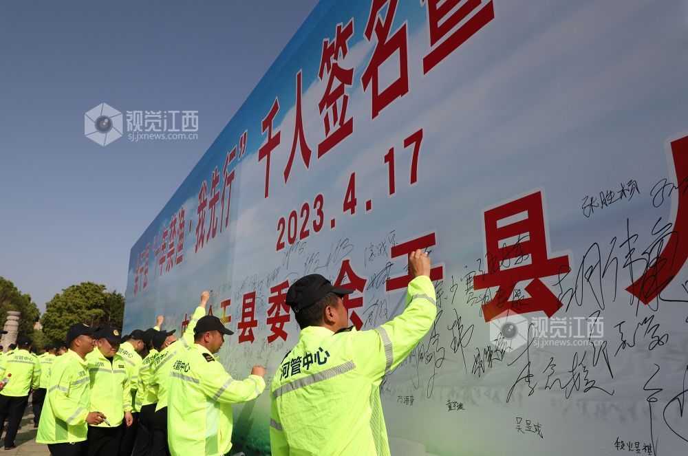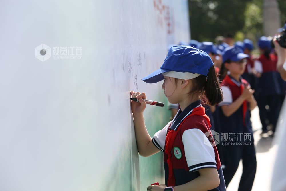 4月17日,在余干县世纪广场,一名学生在“十年禁渔·我先行”千人签名暨“六员”志愿服务活动启动仪式上签名。