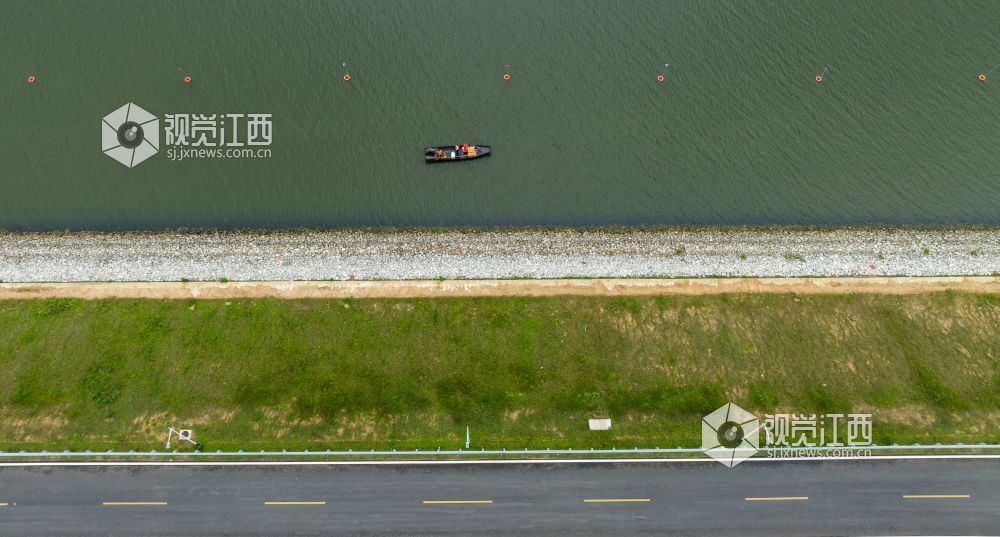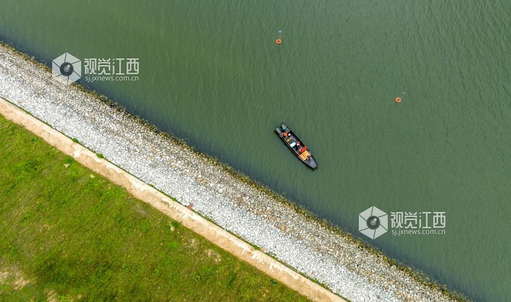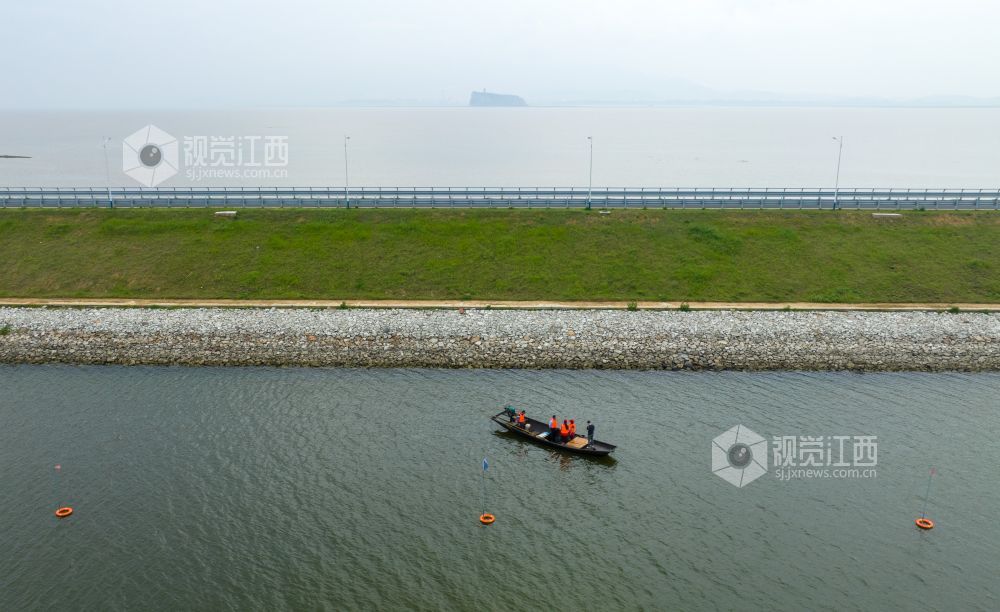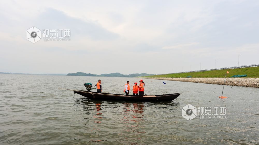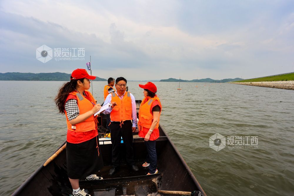 2023年4月18日,江西省九江市湖口县气象局工作人员在该县南北港江豚保护基地乘船实地测量气象数据,监测和记录江豚出水活动、频率等。