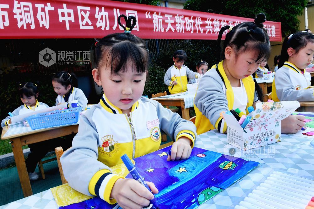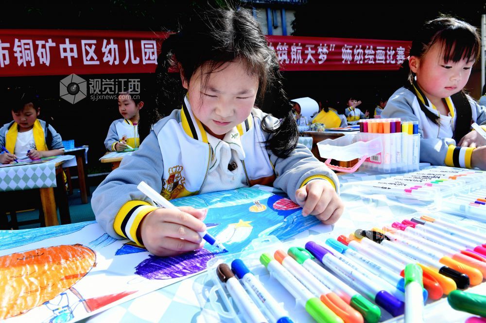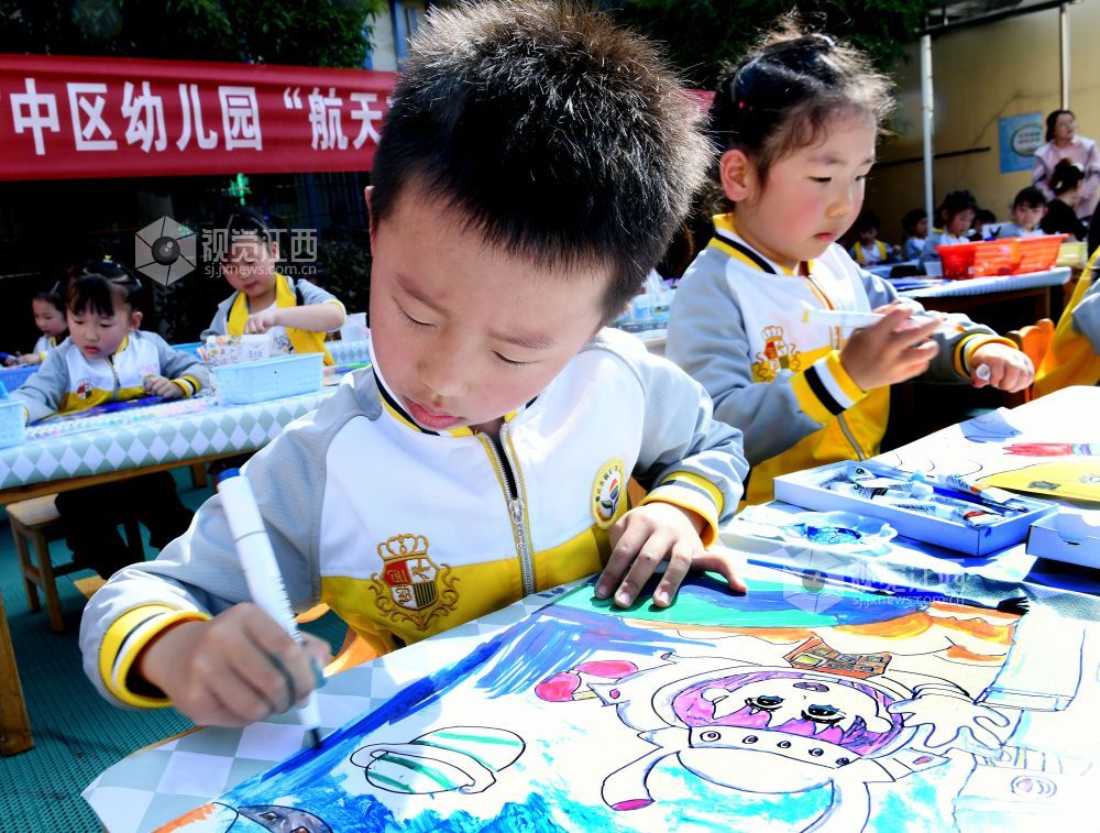 2023年4月17日,江西省德兴市铜矿中区幼儿园大班的小朋友正在绘就航天梦想画图。
