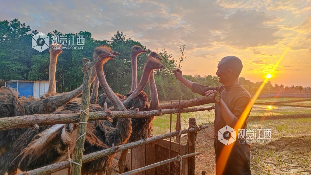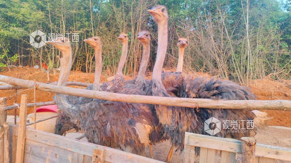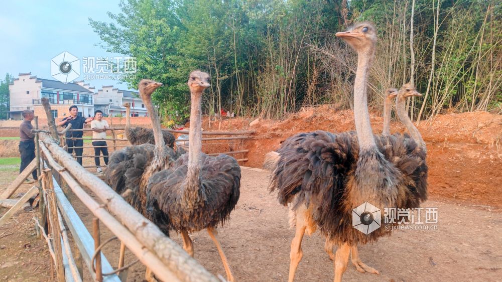 4月20日,江西省余干县石口镇古竹村村民朱长凑在鸵鸟圈舍里给鸵鸟喂食。