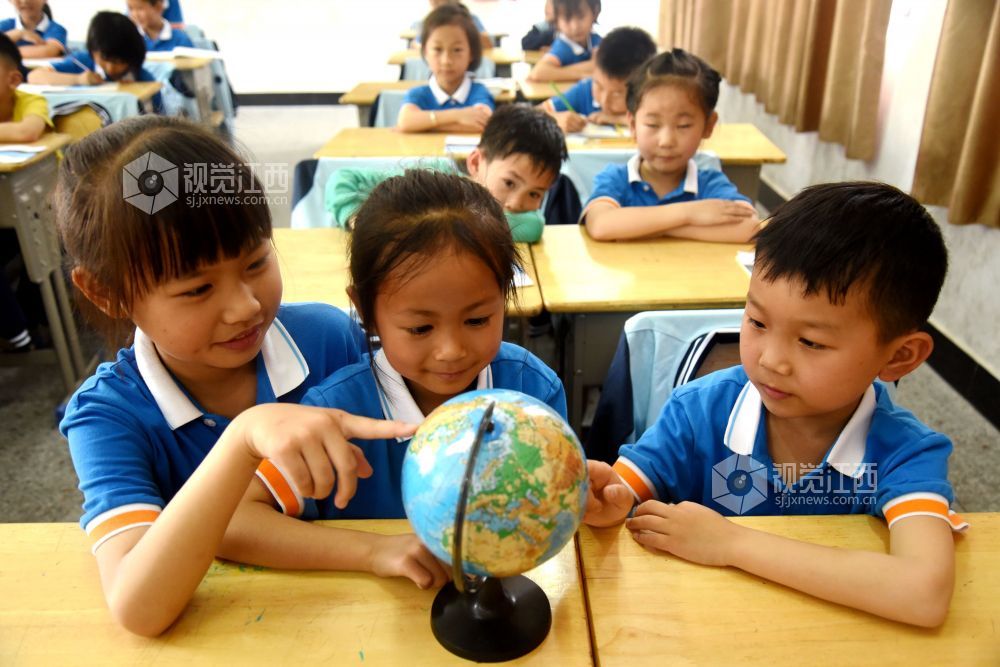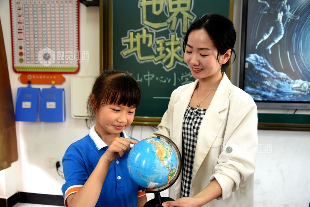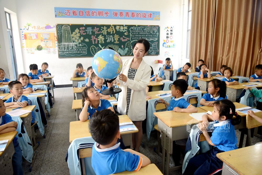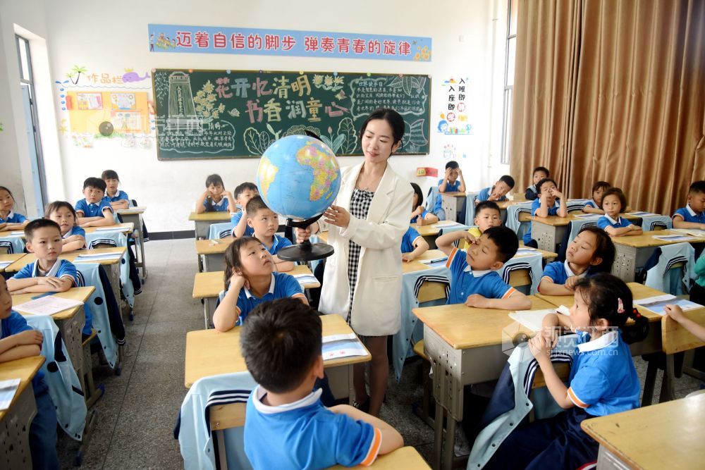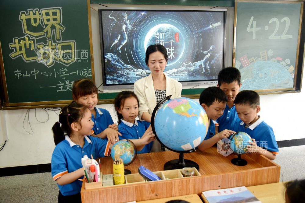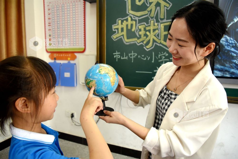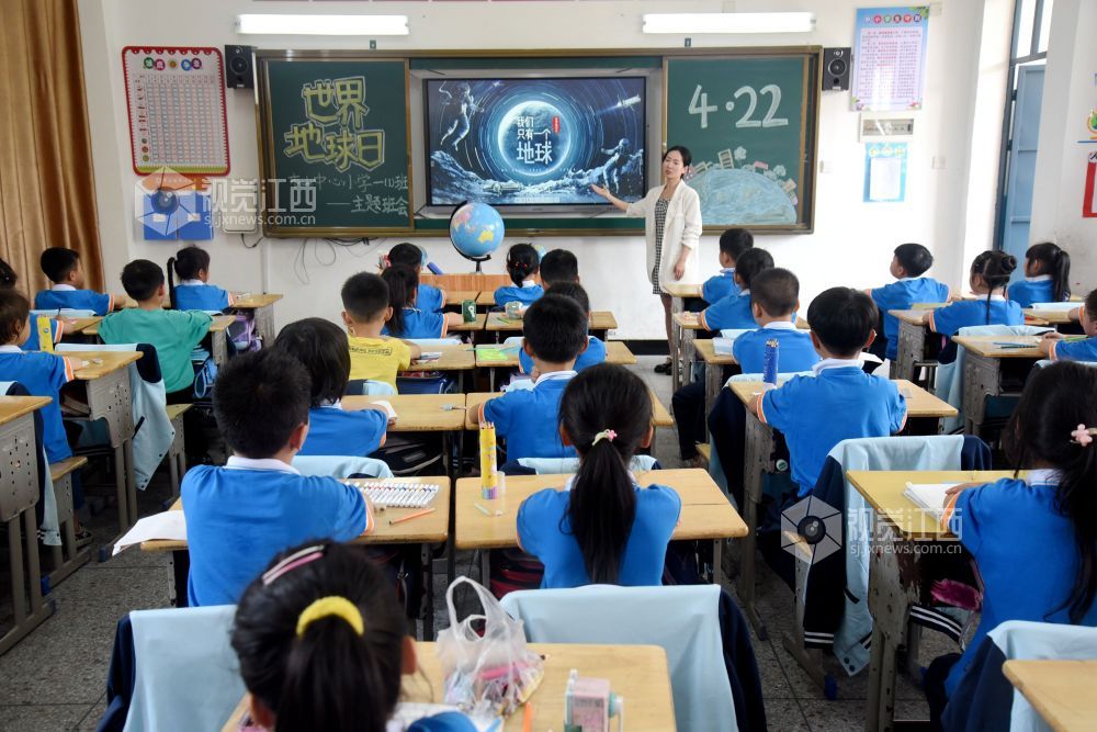 2023年4月21日,江西省抚州市南丰县市山中心小学一年级的老师正在上“我们只有一个地球”主题班会课,向学生们讲解地球知识,旨在让小学生了解保护地球的重要性。